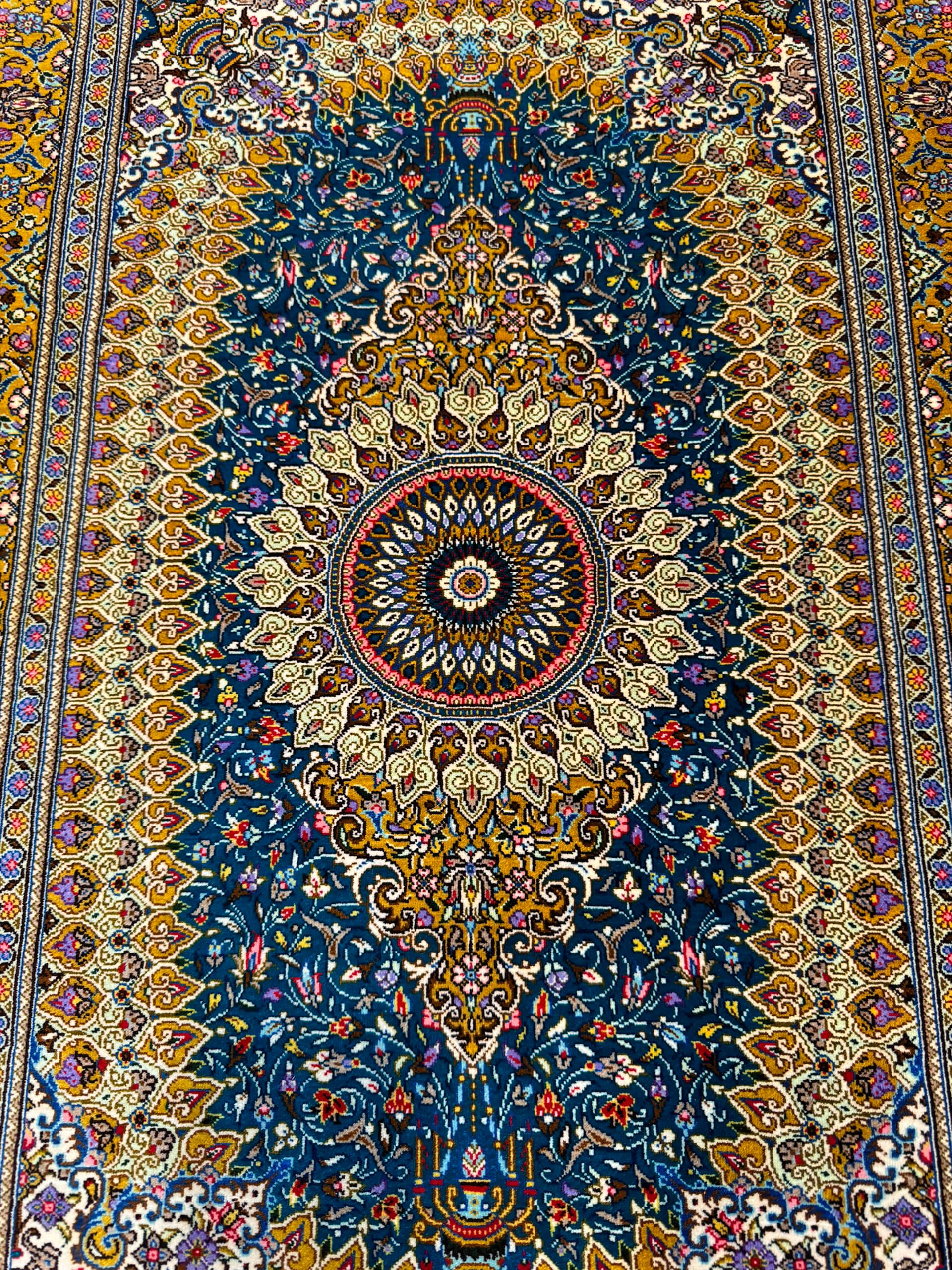 黄色を基調とした華やかなデザインが魅力のペルシャ絨毯です。中央には美しい花模様が描かれ、周囲の装飾がそれを際立たせています。細やかな柄と繊細な織りが、伝統的な職人技術の高さを感じさせます。小ぶりなサイズでありながら、存在感のある仕上がりです。