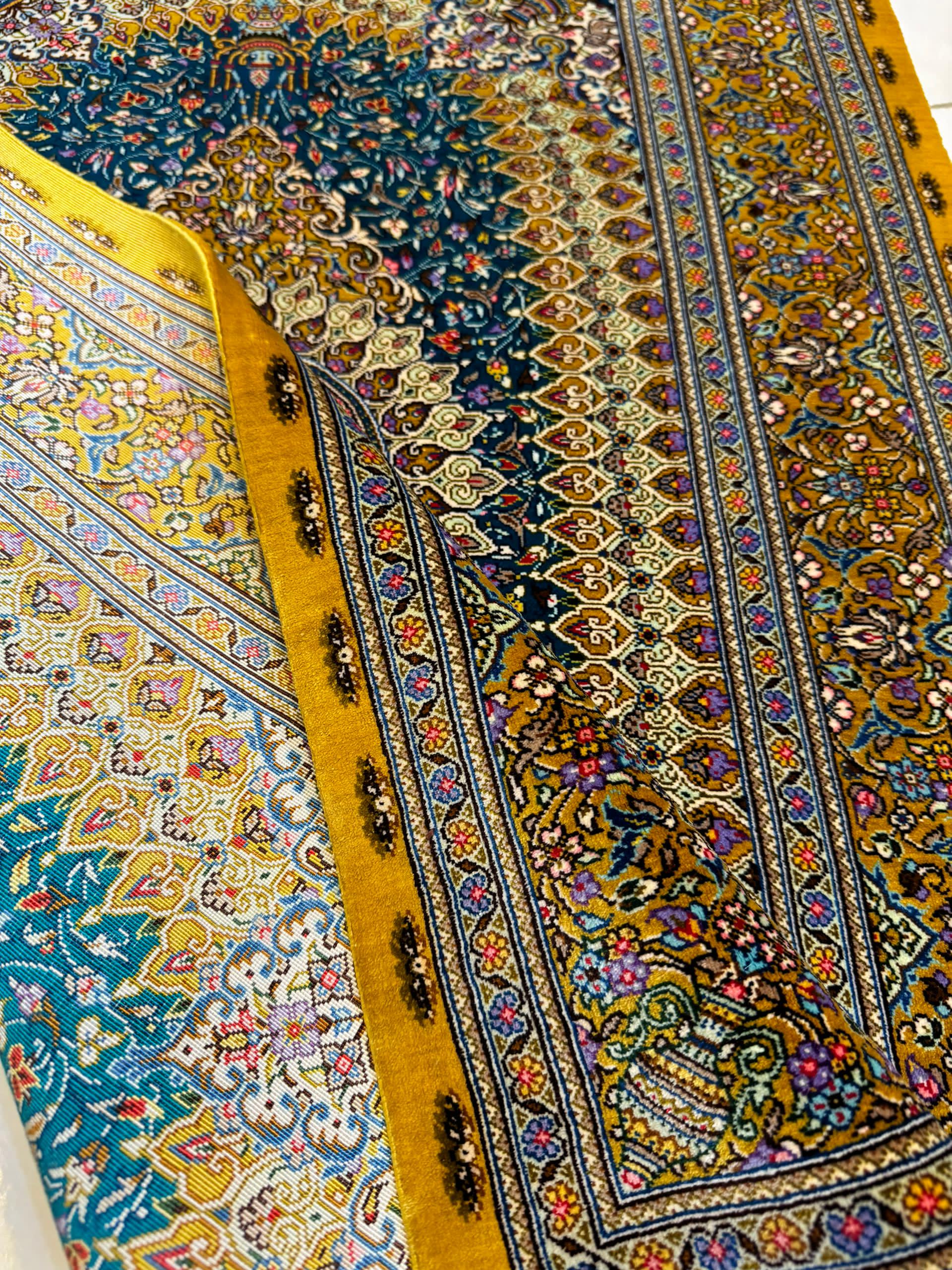 驚くような細かな織り目とビロードのような生地、肌に吸い付くようなシルクの艶やかな光沢感が豪華絢爛。まさに、「The ペルシャ絨毯」と言うべき最高峰のペルシャ絨毯は、もはや工芸品ではなく美術品としての価値となります。ジャムシディ工房のサイン入り。シルクの絨毯は毛足の光沢が見る向きによってまったく趣の異なる色合いになりますので、敷く際は向きを調整してください。