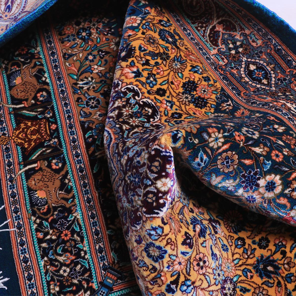 質感の良さ:シルク100%のなめらかさ。指で撫でると毛並みが流れ、光で艶がやさしく変化。さらりと軽い踏み心地が続きます。
