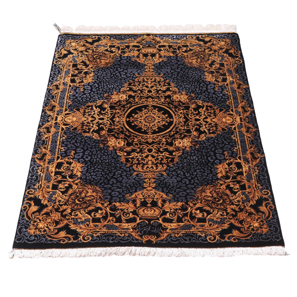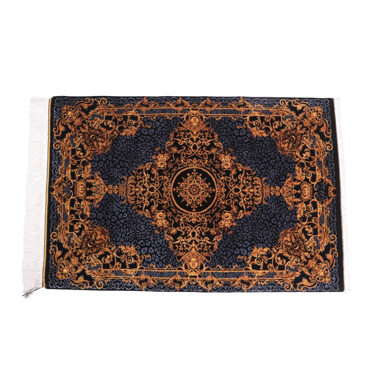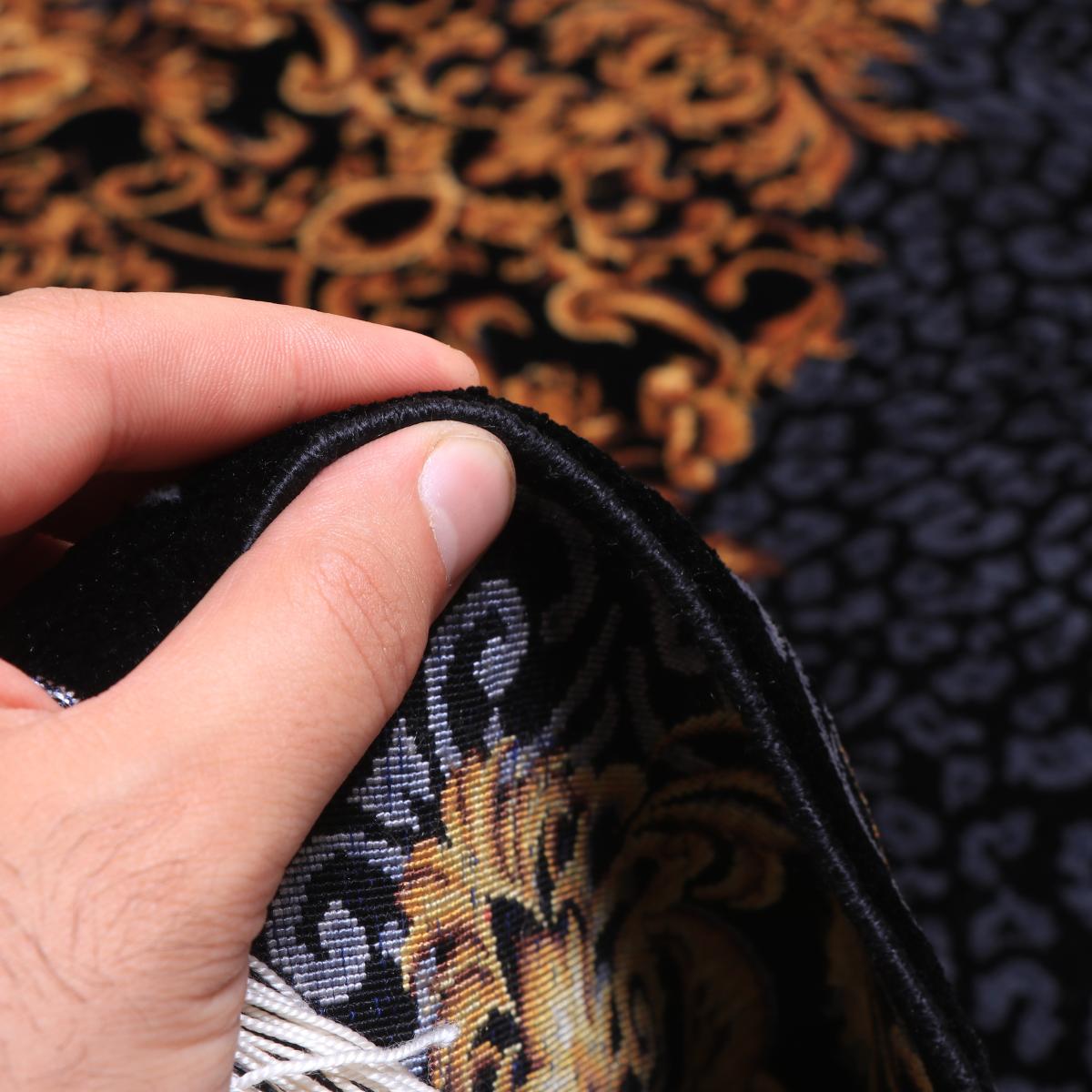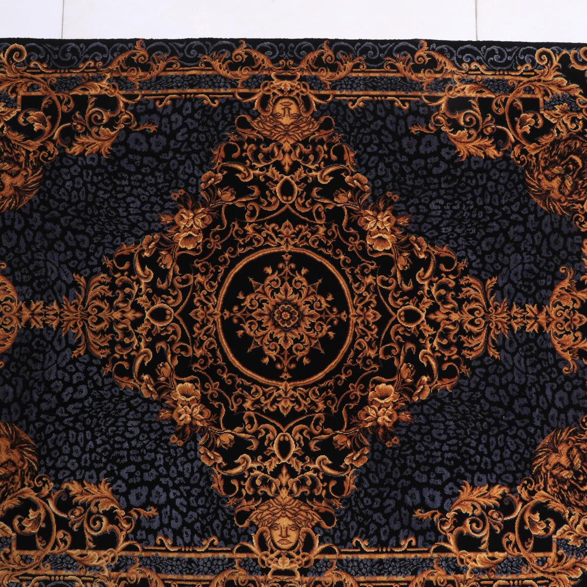 デザインの魅力:金のアラベスクが額縁のように巡り、中央の円文を際立たせます。端正でクラシック、敷くだけで空間がきゅっと締まります。