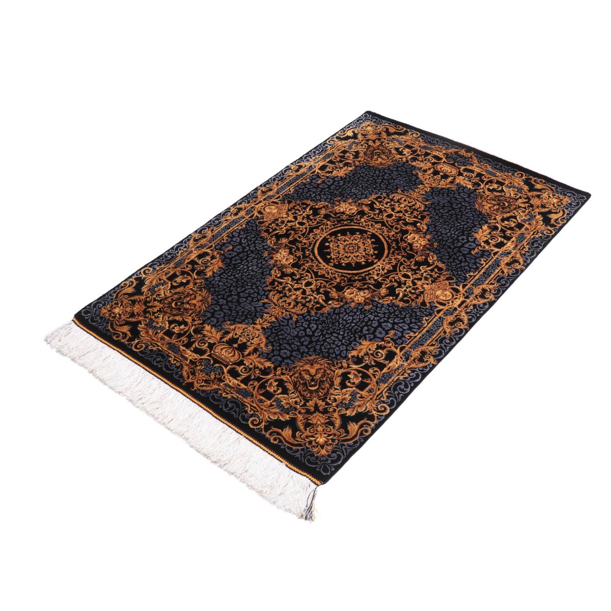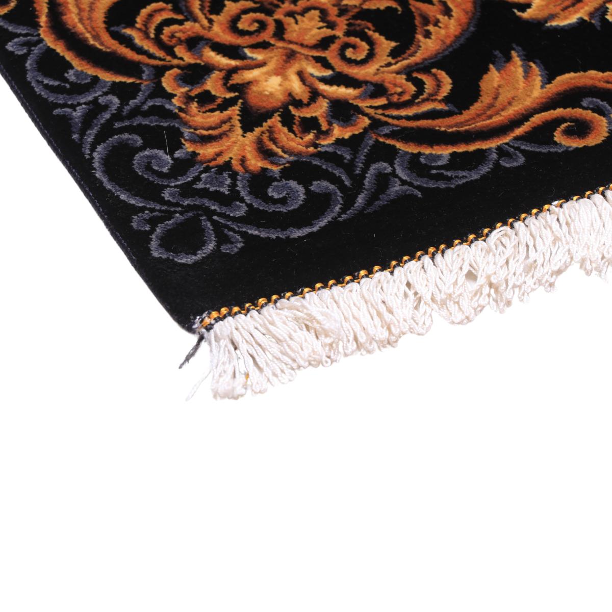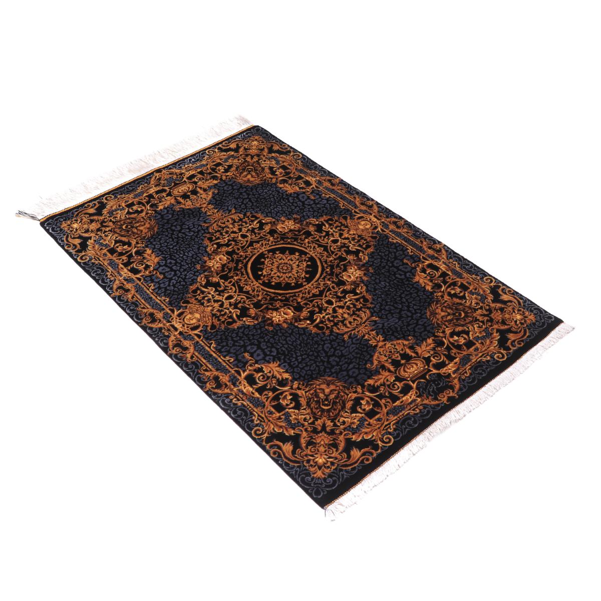 デザインの魅力:金のアラベスクが額縁のように巡り、中央の円文を際立たせます。端正でクラシック、敷くだけで空間がきゅっと締まります。