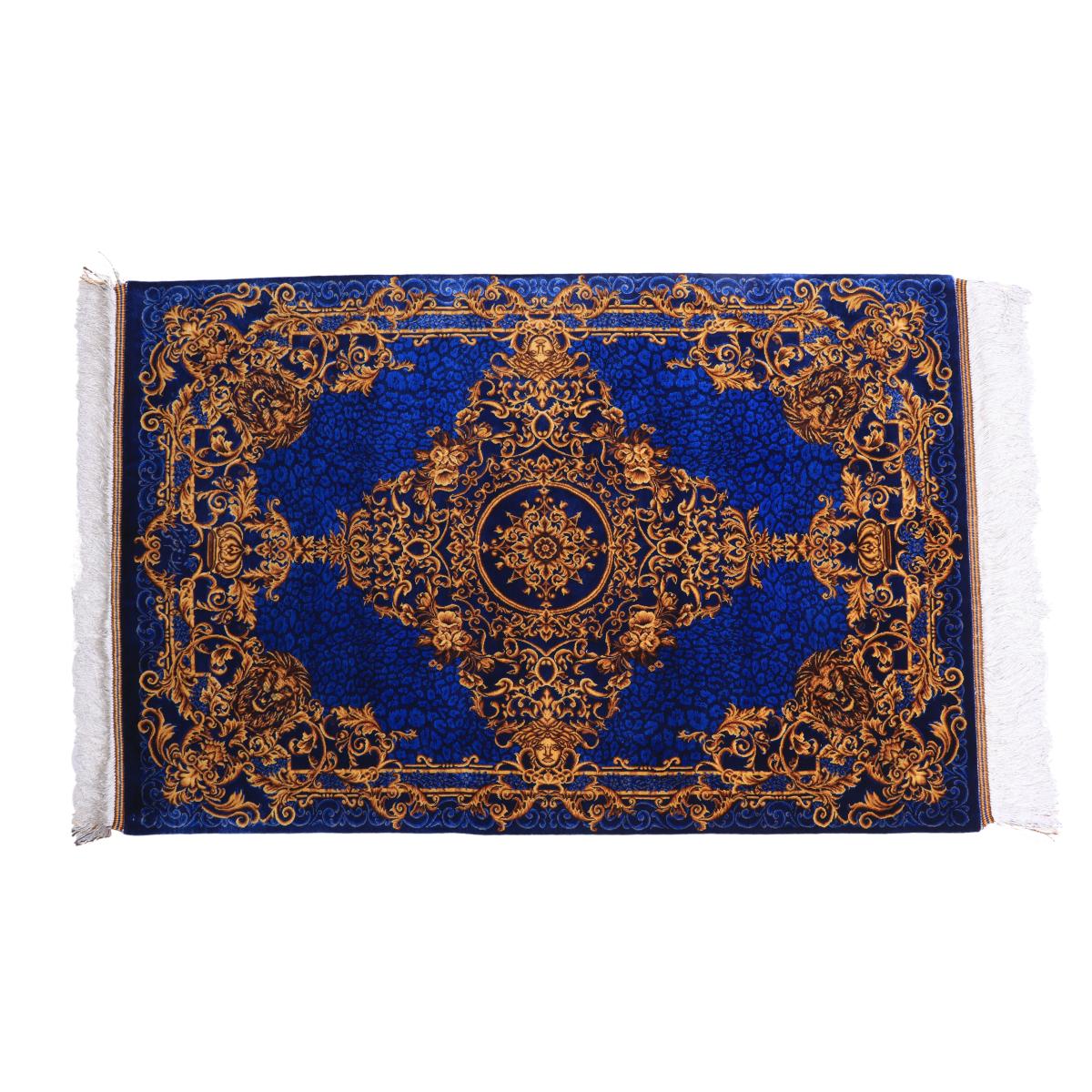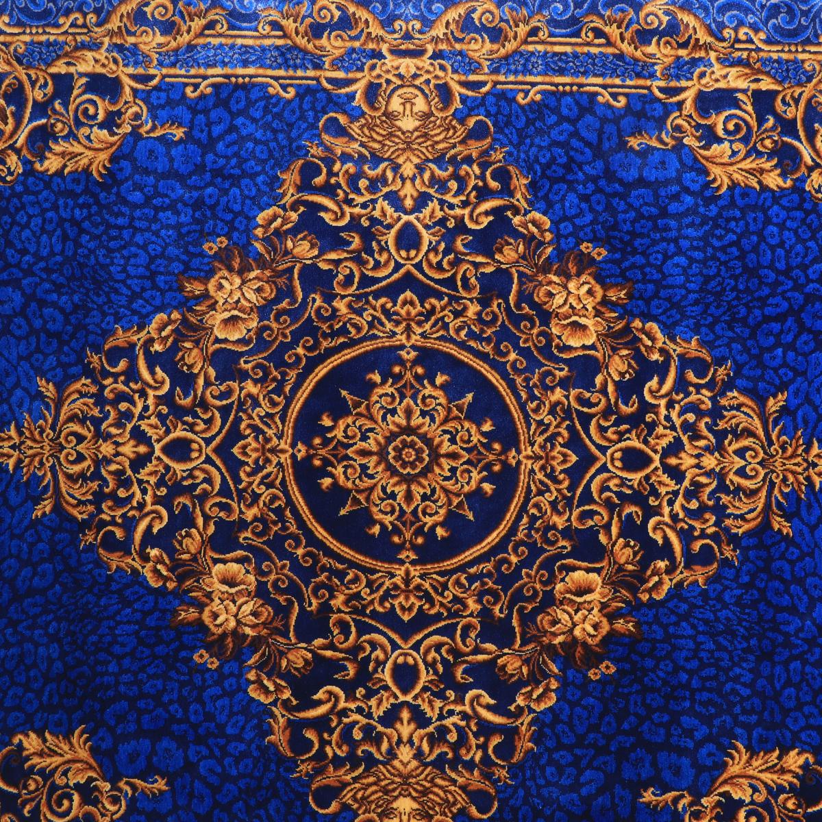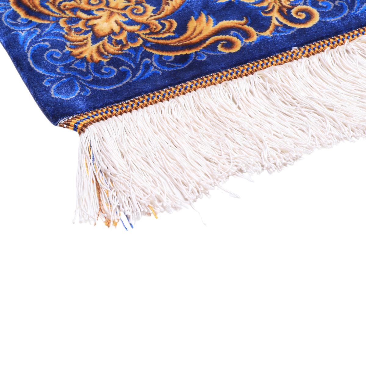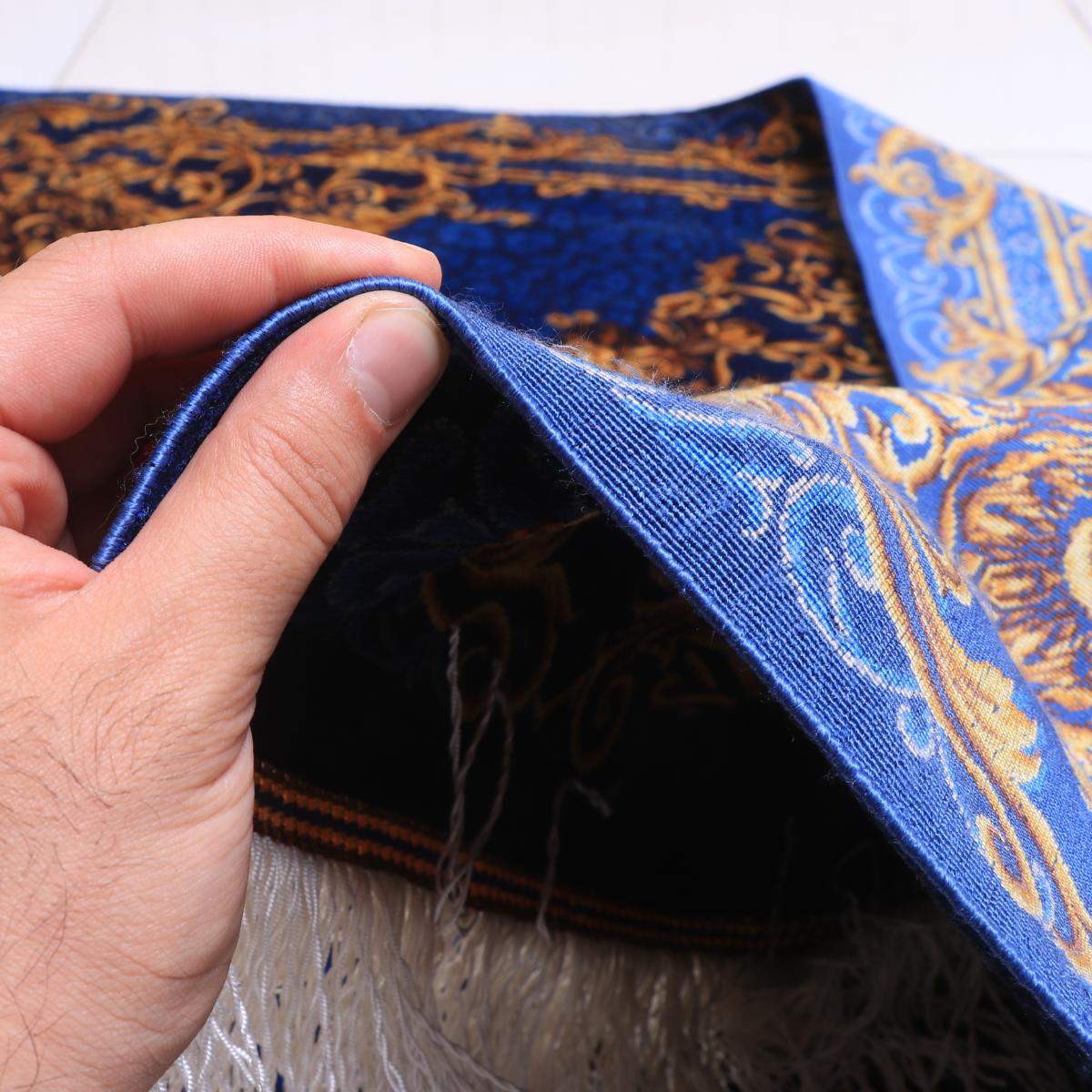 デザインの魅力:金のアラベスクが四隅から中心へ結ぶ端正な構図。円花が際立ち、敷くだけで空間がきゅっと締まります。