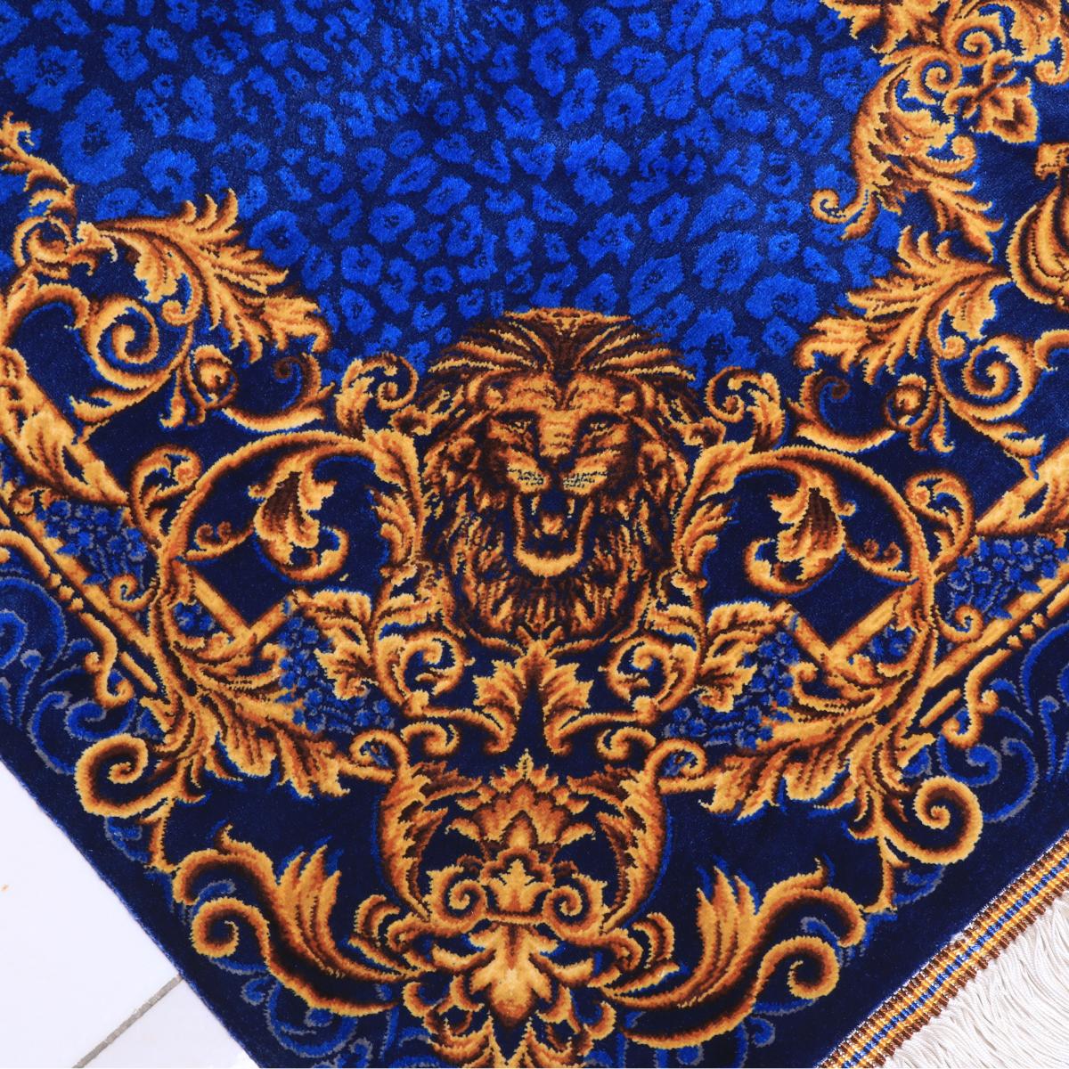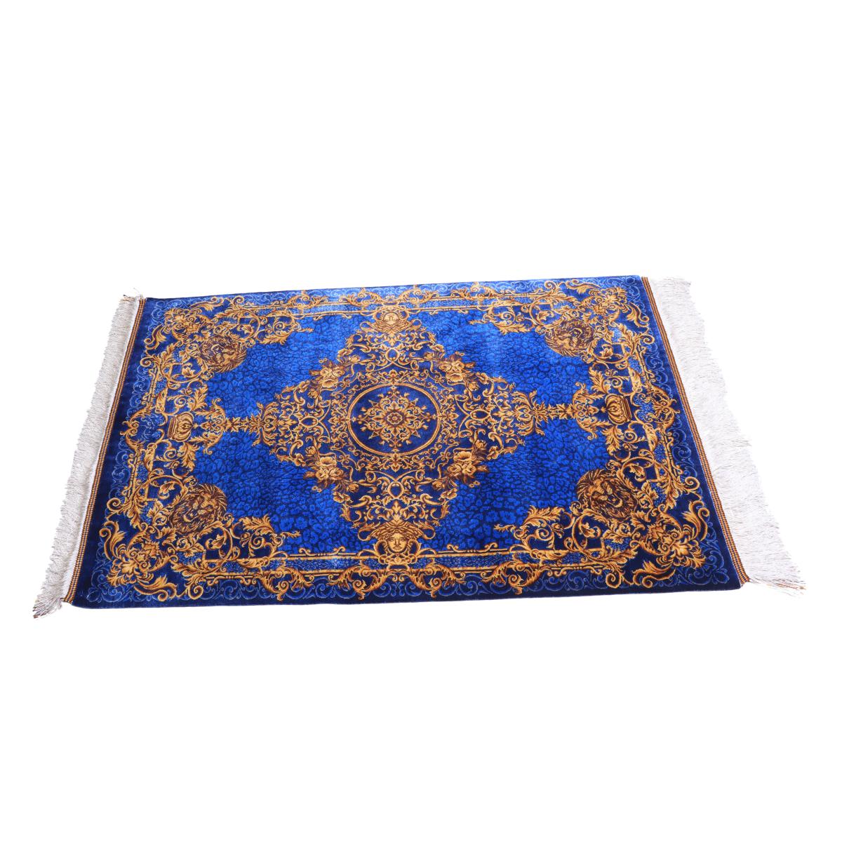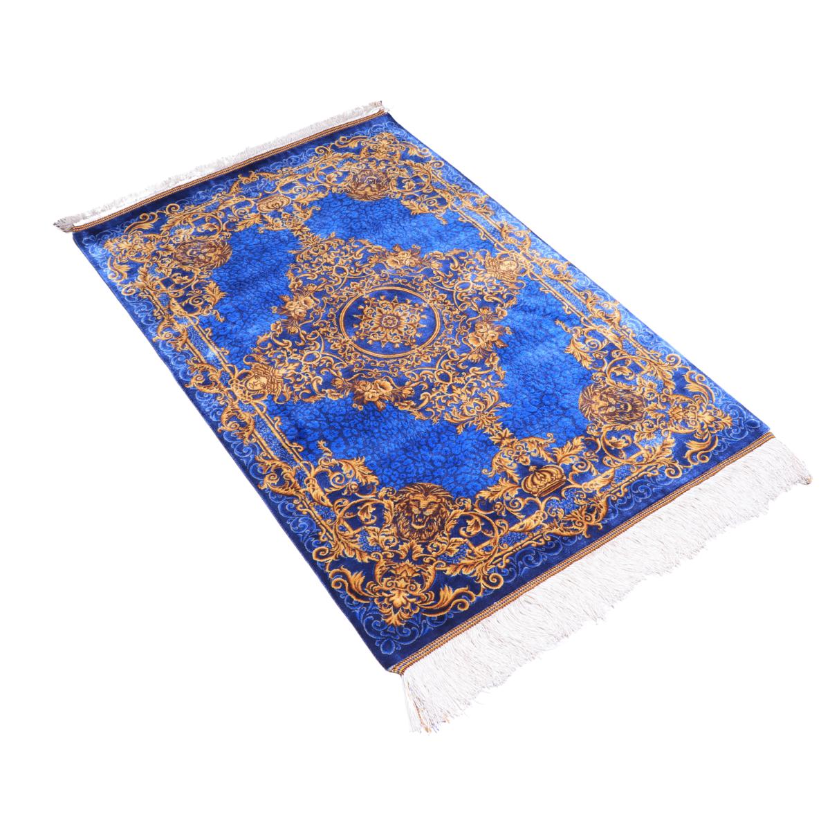 デザインの魅力:金のアラベスクが四隅から中心へ結ぶ端正な構図。円花が際立ち、敷くだけで空間がきゅっと締まります。