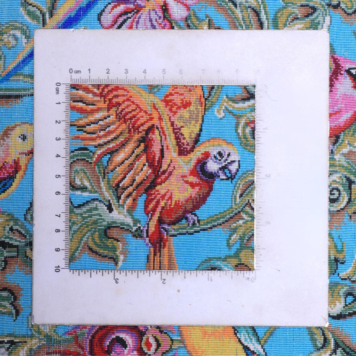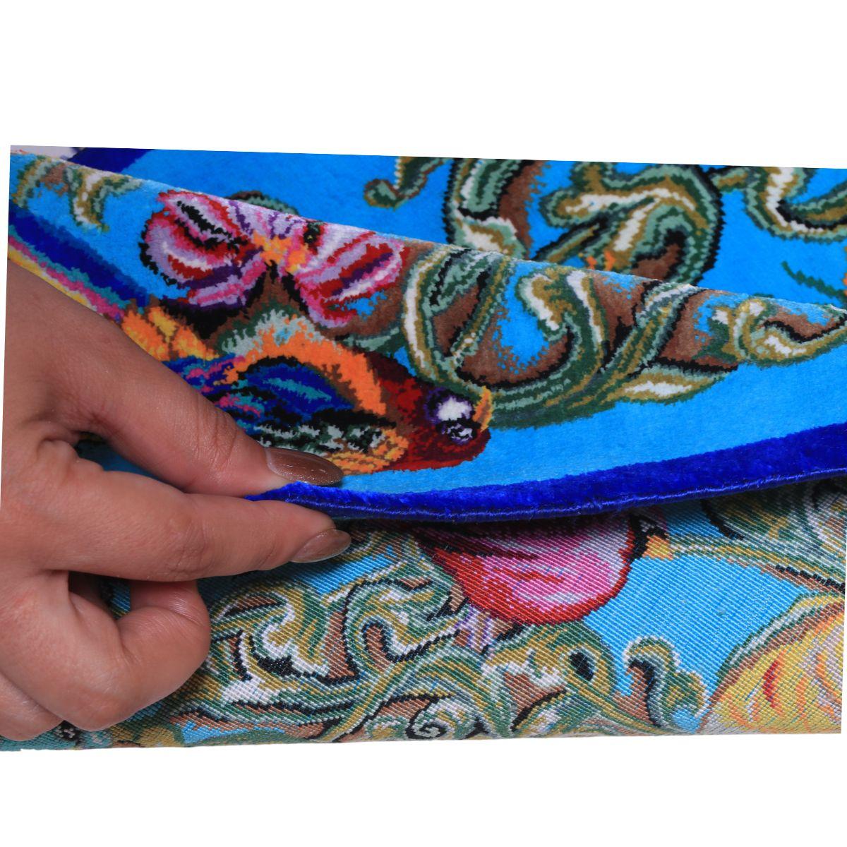 デザインの魅力:澄んだ青の面に唐草が流れ、小鳥と花が生き生きと舞う縦長図。敷いても壁掛けでも軽やかに映えます。