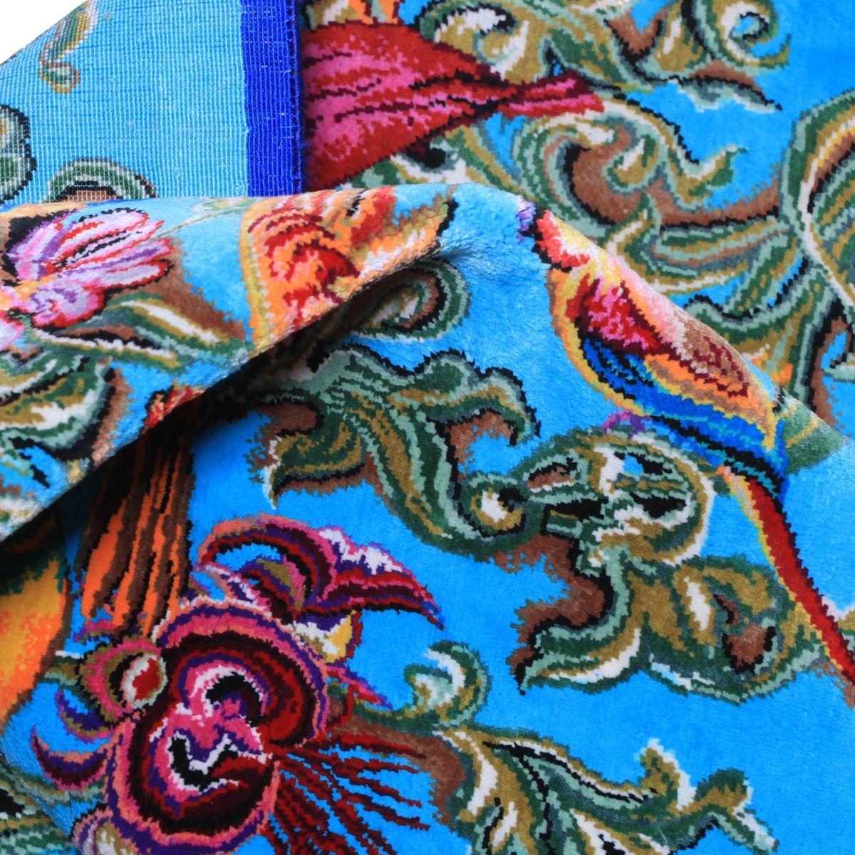 色:明るいターコイズを基調に、緑の蔓、橙や紅、紫、金がアクセント。青の濃淡が奥行きを生み、部屋をぱっと明るくします。