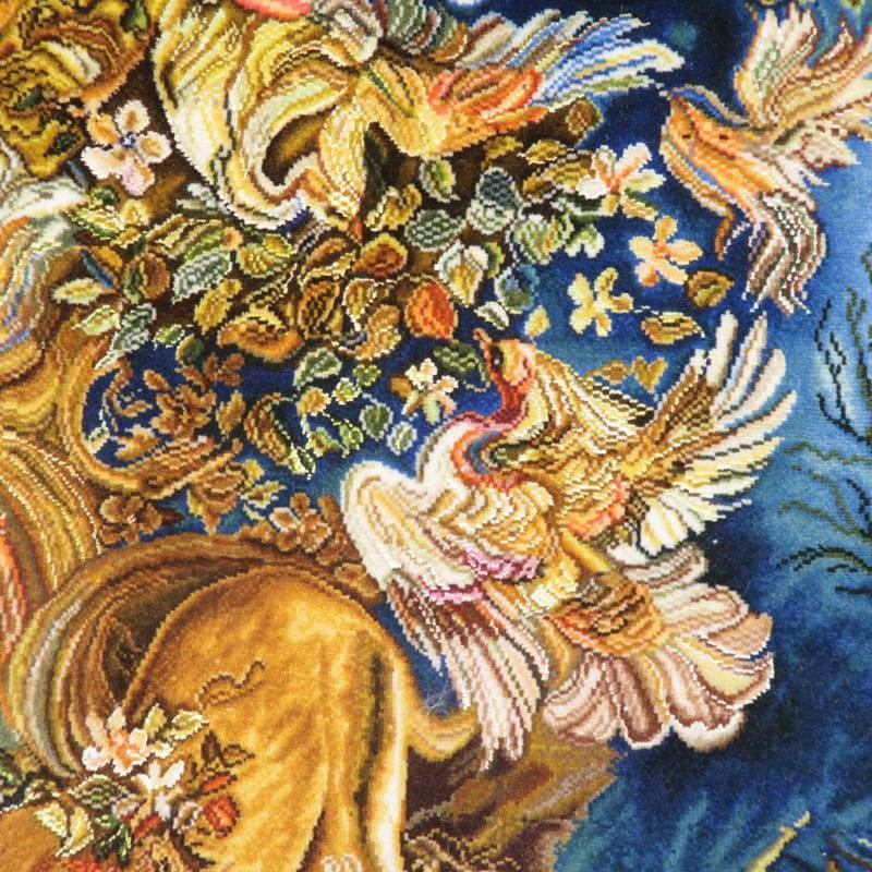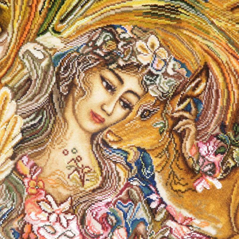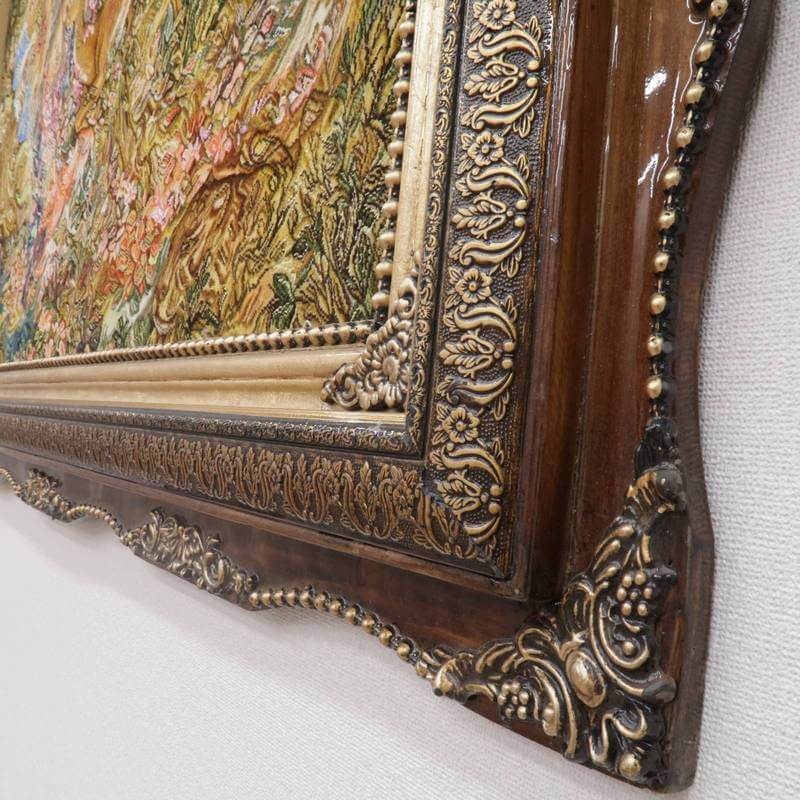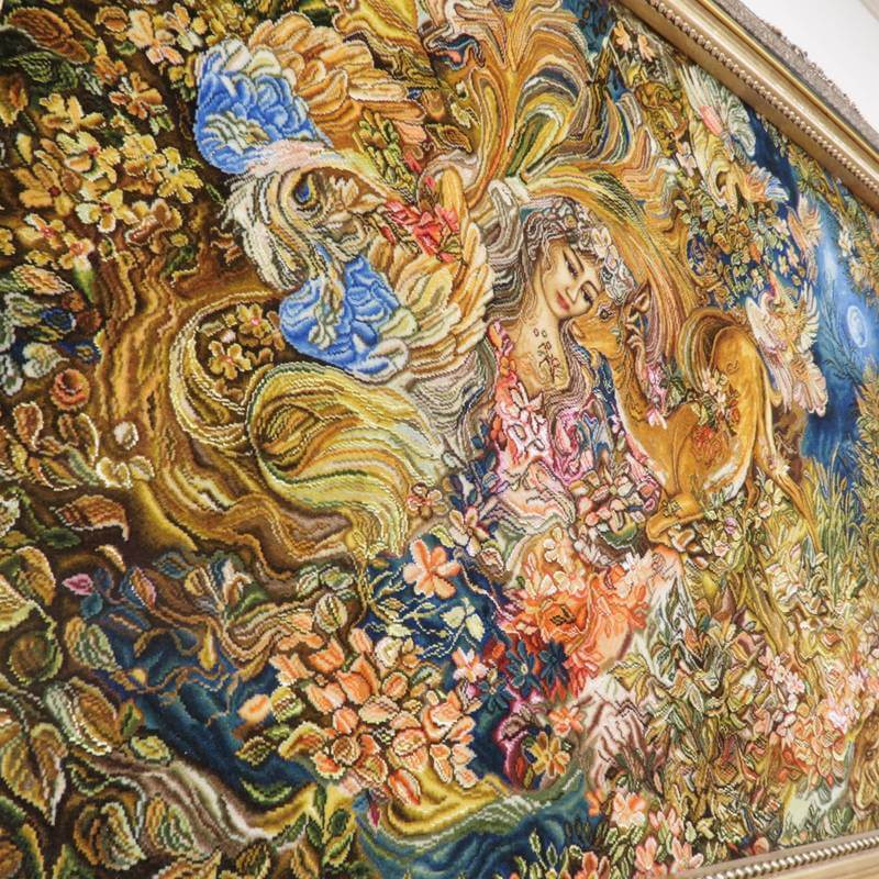 ペルシャ細密画の第一人者「ファルシチアン」の青白く光る月と天女と動物たち。一番難しいと言われる顔の表情が、美しく描き出され、画題の持つ幻想的な雰囲気を最高に引き出しています。120色にもおよぶ色数のウールとシルクを使用して、細かくリアルに表現され、その質感は絵画を超える美しさです。感性を刺激し、インテリアの価値を高めてくれるアートとしての作品を飾ることは、心を豊かにするためだけでなく、来客とのコミュニケーションツールとして特に海外で大変人気があります。また、こちらの額装は、中の絨毯をより引き立たせるため、職人による手彫りの木製額縁にこだわりました。