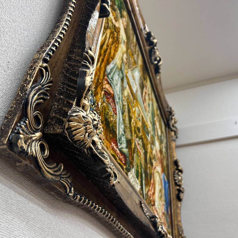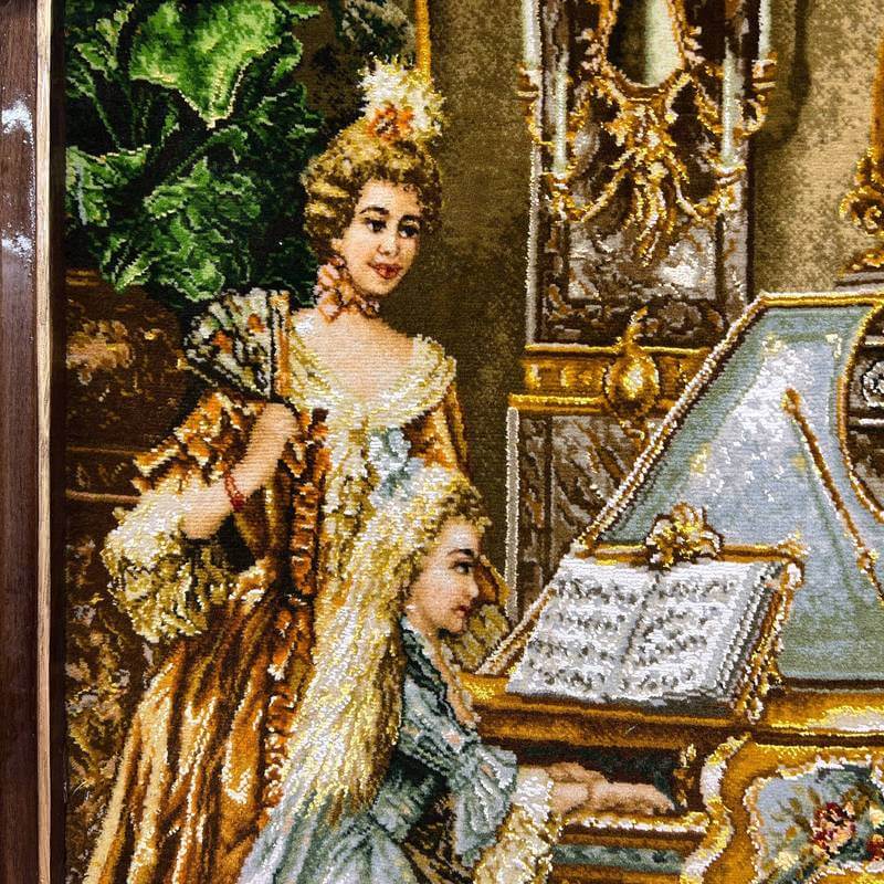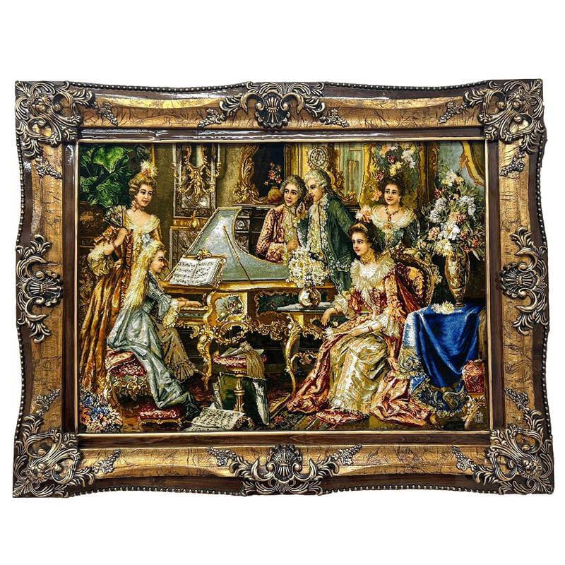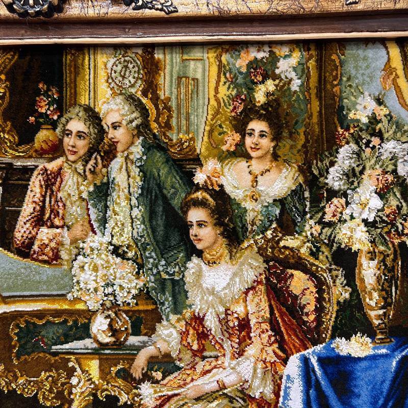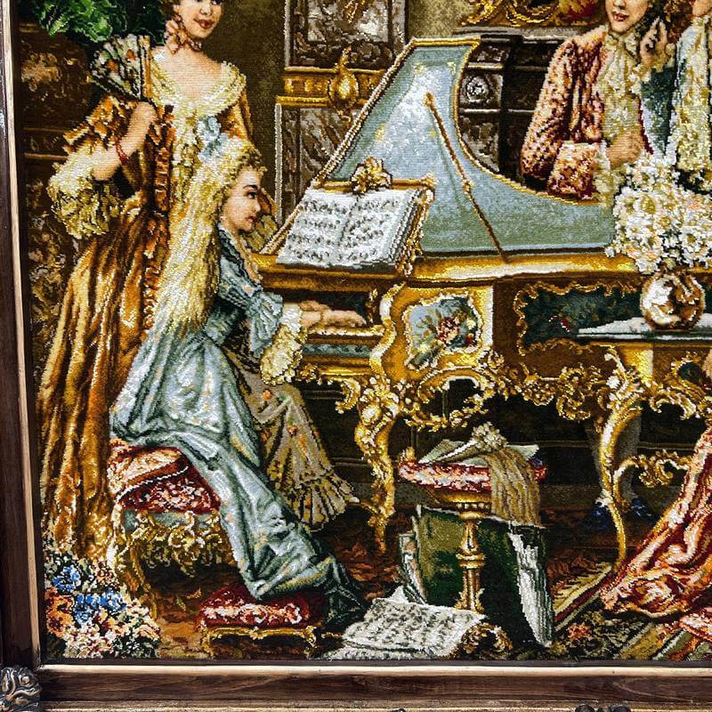中世ヨーロッパの上流家庭。女の子のピアノの演奏を熱心に聞く大人たちの様子を丁寧に描いています。一番難しいと言われる人物の表情が美しく、繊細な調度品とともに優美に描かれています。80色にもおよぶ色数のウールとシルクを使用して、細かくリアルに表現され、その質感は絵画を超える美しさです。感性を刺激し、インテリアの価値を高めてくれるアートとしての作品を飾ることは、心を豊かにするためだけでなく、来客とのコミュニケーションツールとして特に海外で大変人気があります。また、こちらの額装は、中の絨毯をより引き立たせるため、職人による手彫りの木製額縁にこだわりました。