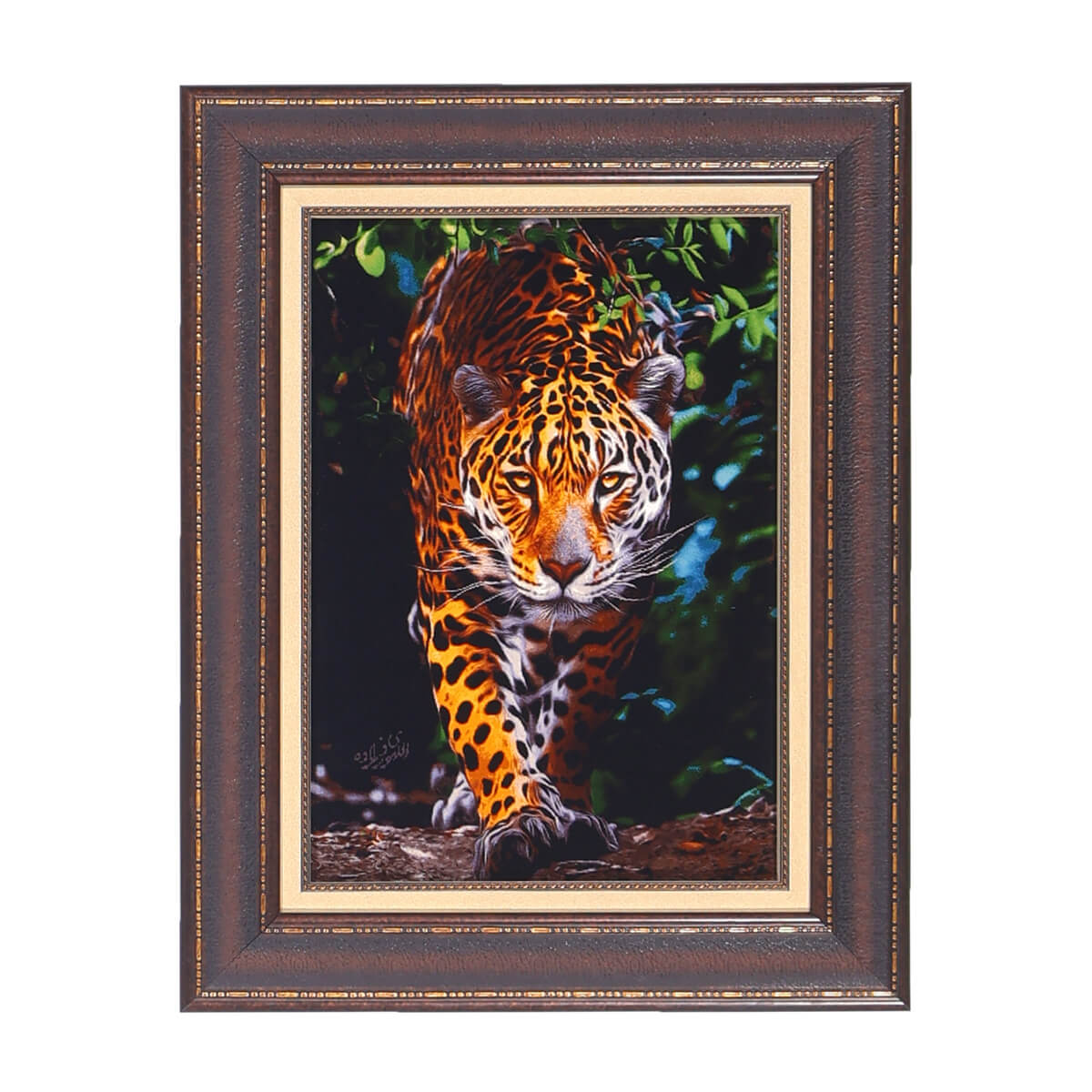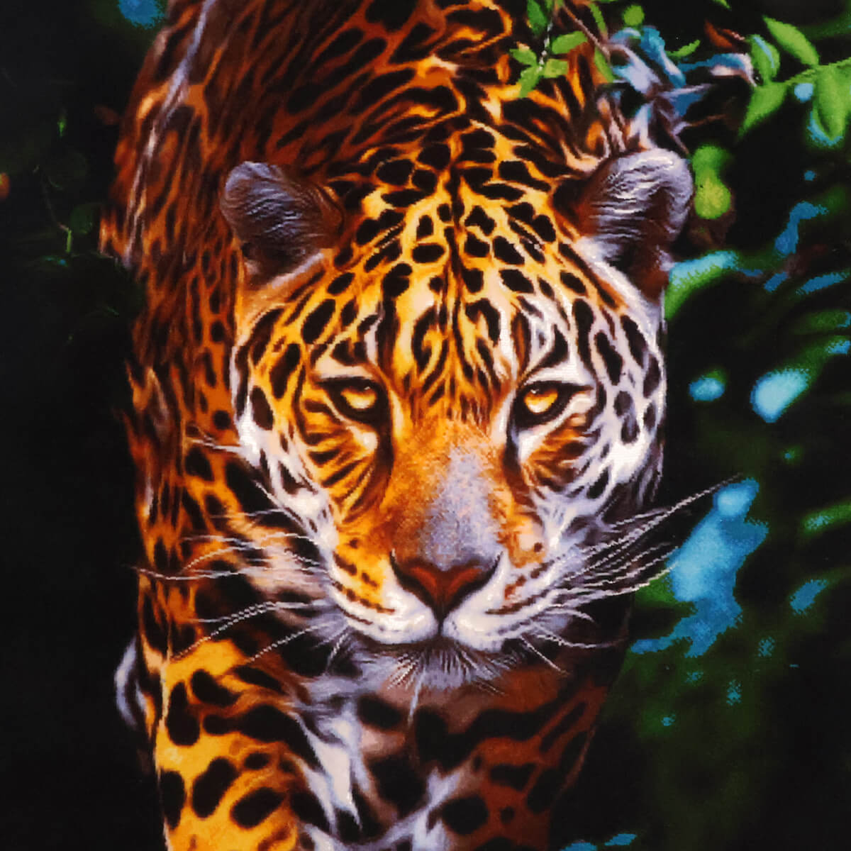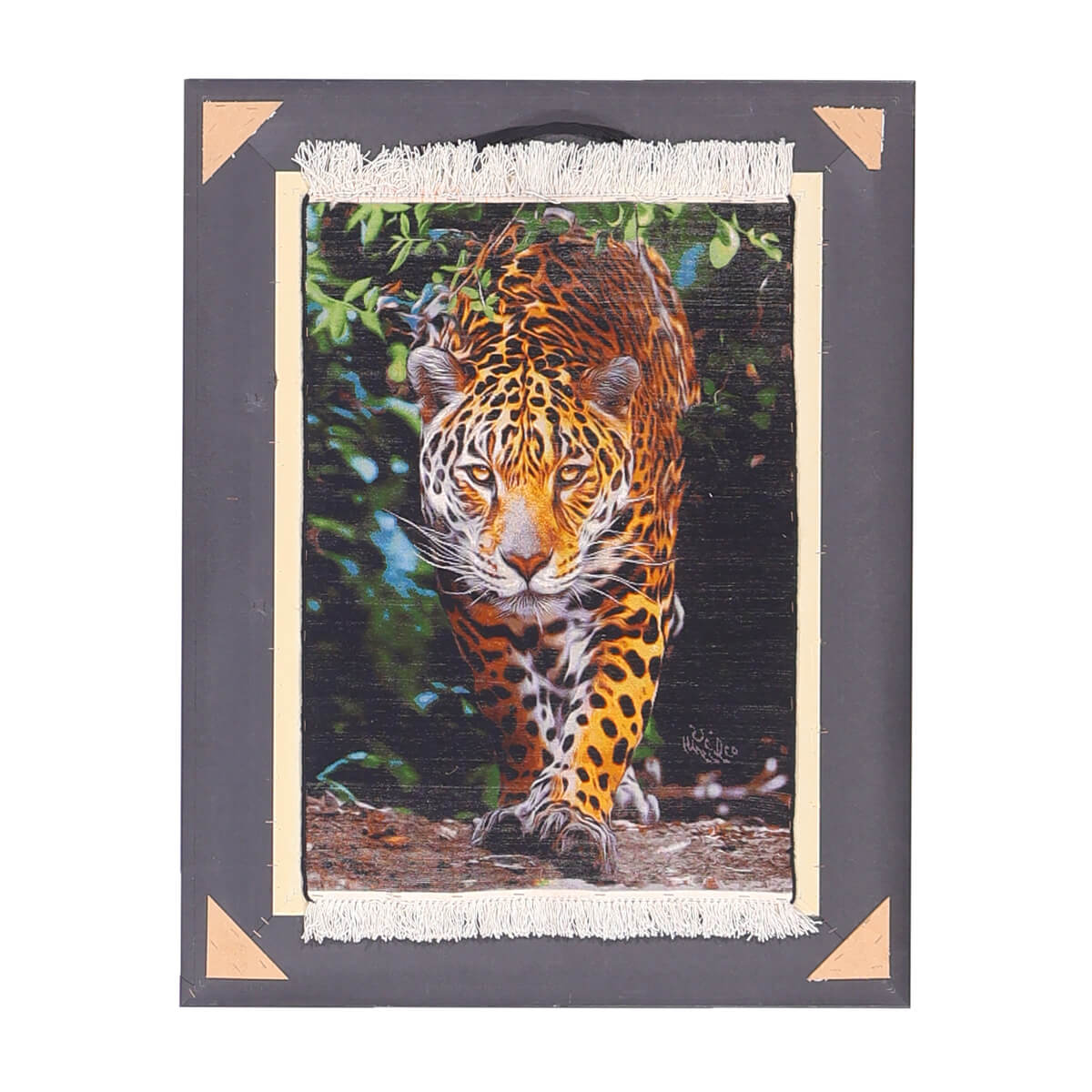 まるでジャングルから今にも飛び出してきそうなヒョウ。力強い眼差しとしなやかな毛並みが、絨毯とは思えないほどリアルに表現されています。動物画好きな方にも、アートラグをお探しの方にもおすすめです。 -