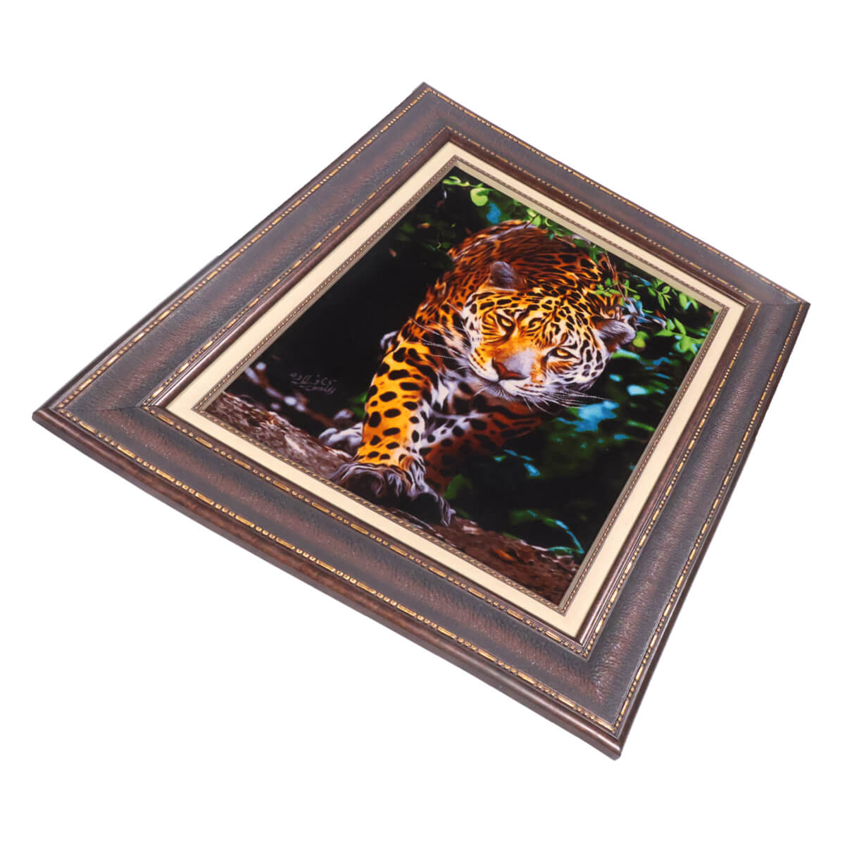 深みのあるブラックを背景に、鮮烈なオレンジとイエローの毛並み、自然を感じさせるグリーンの葉が絶妙なバランスで彩られています。お部屋に飾るだけで、空間が一気に明るく上質な雰囲気に。 -