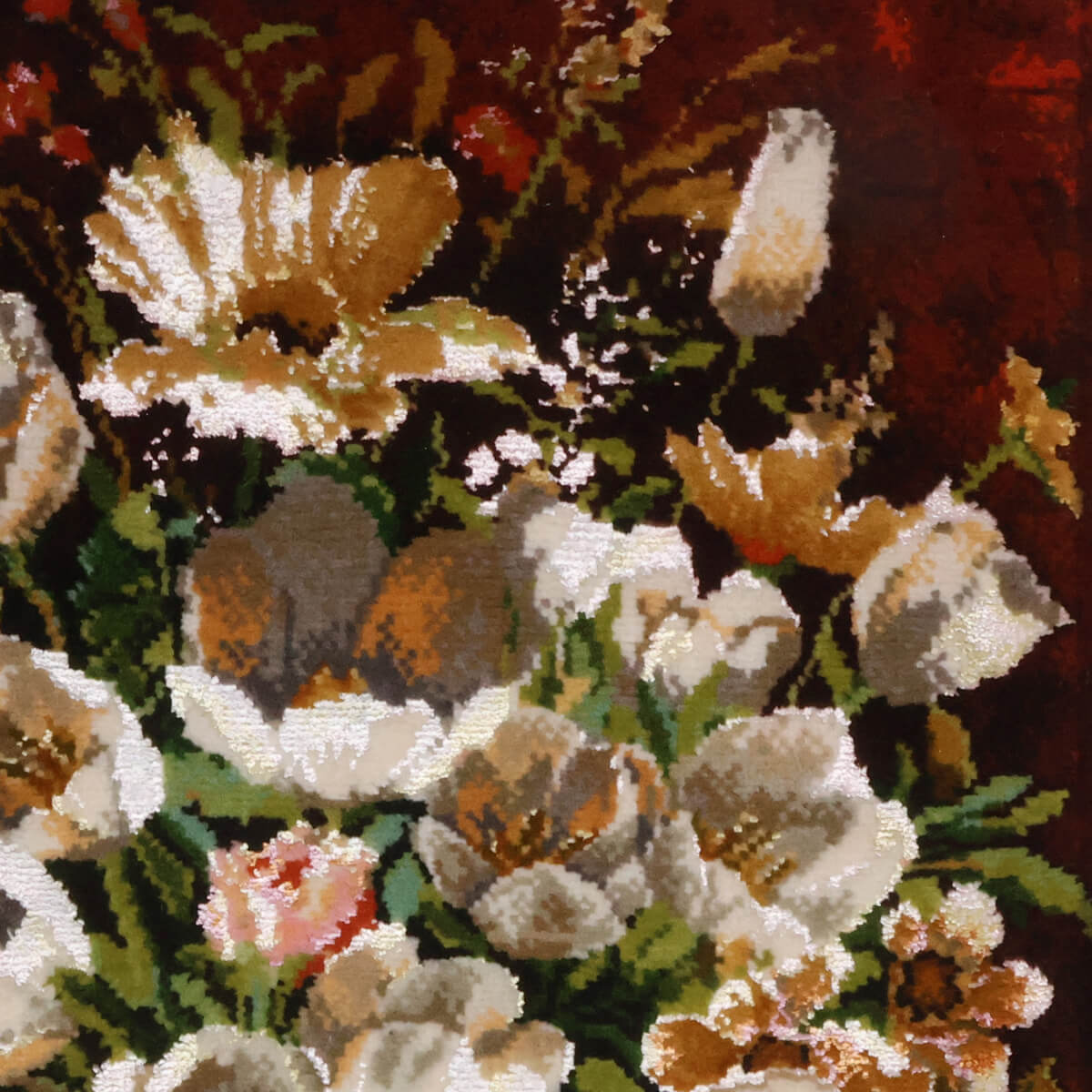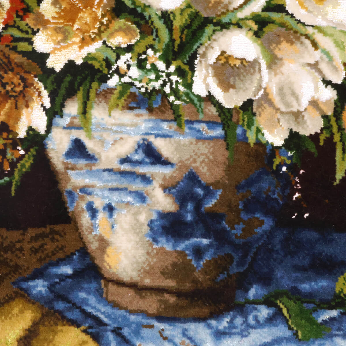 風景や人物、動物、花々など、イマジネーションと卓越した技術で描かれるモチーフは、まるでシルクのキャンバスに描かれたような、唯一無二の芸術絨毯です。