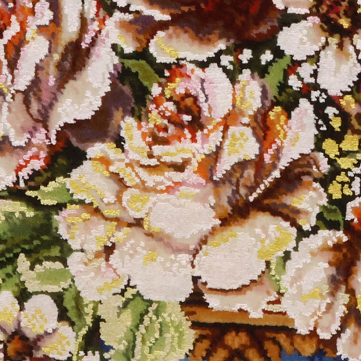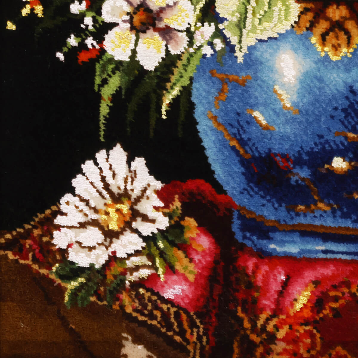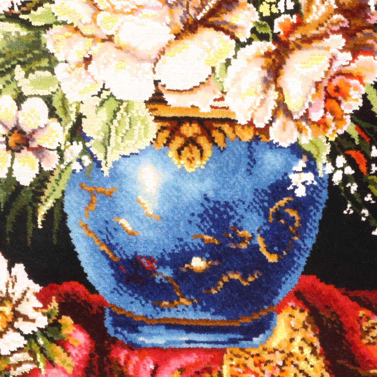 この絵画絨毯は、花瓶の鮮やかな青が本当に印象的で、どこに飾ってもお部屋がぱっと華やぎます。季節やインテリアを問わず楽しめるので、ぜひ毎日の暮らしに彩りを添えてみてください。ご質問やご相談もお気軽にどうぞ!
