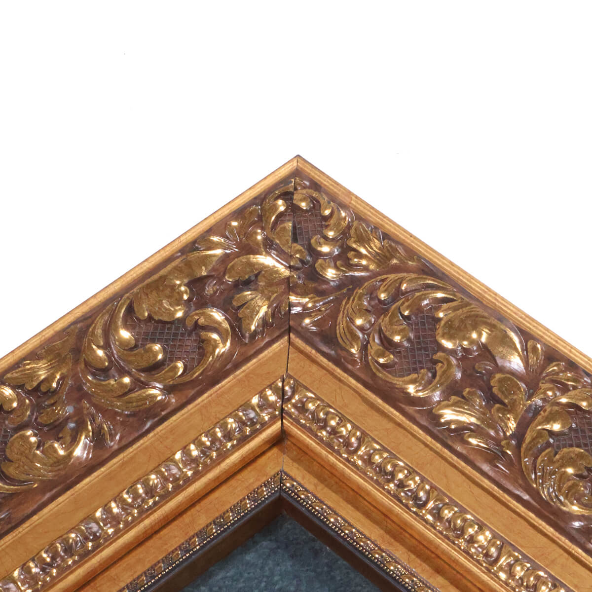 彫刻模様が美しい重厚なゴールドフレームが、絨毯アートの存在感を一層引き立てます。届いたその日からすぐに飾れます。