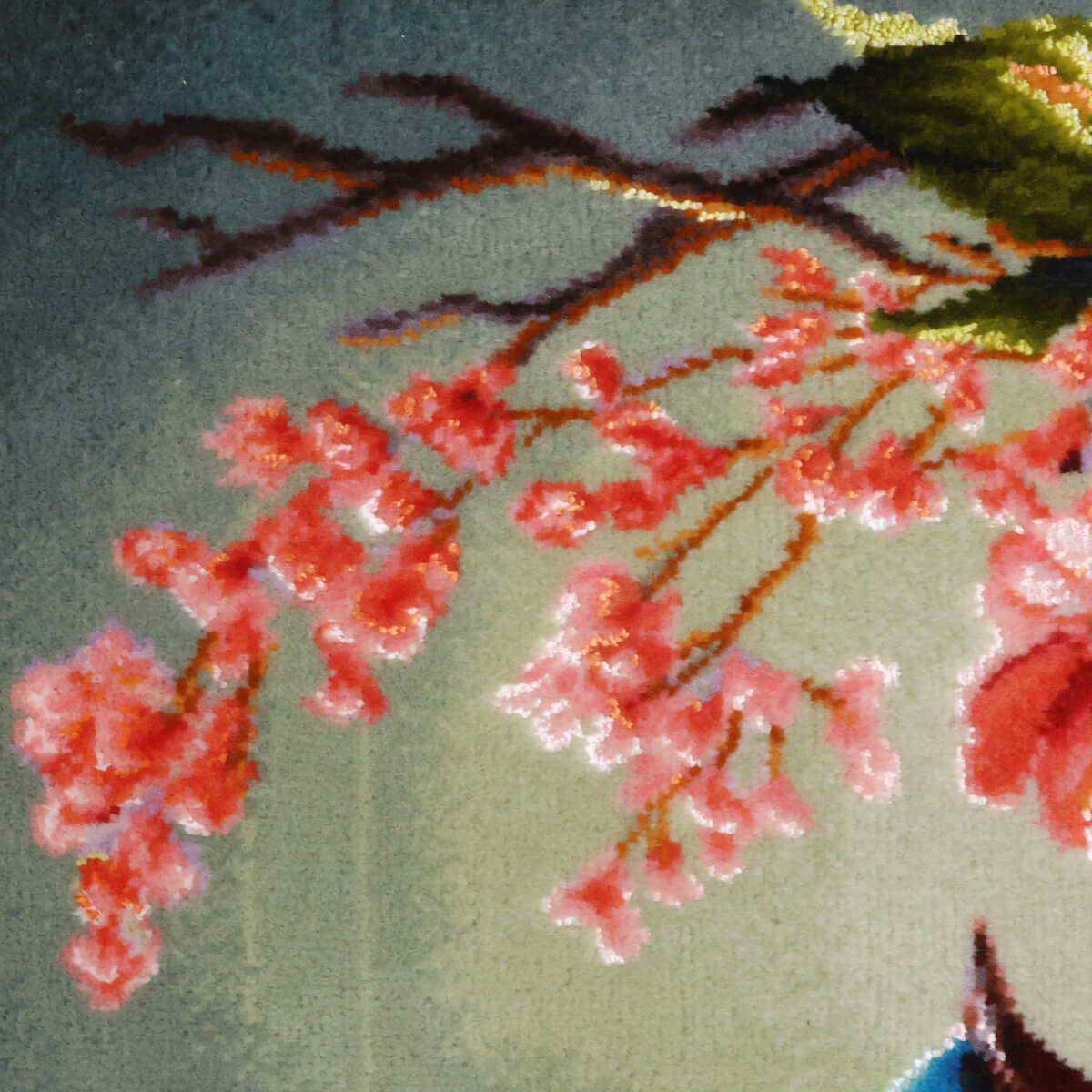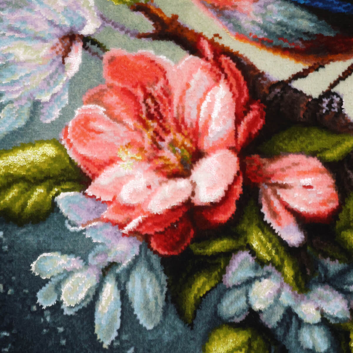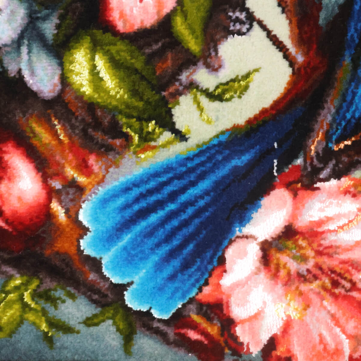 この青い鳥の絨毯は、鮮やかな色合いと花々の美しさが本当に目を引きます。玄関やお部屋のアクセントにするだけで、春の訪れを感じる華やぎをもたらしてくれますよ。ご質問やご相談も、お気軽にどうぞ!