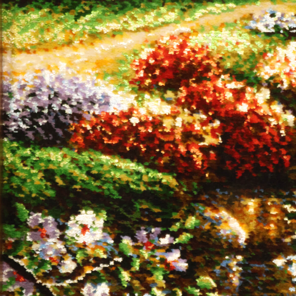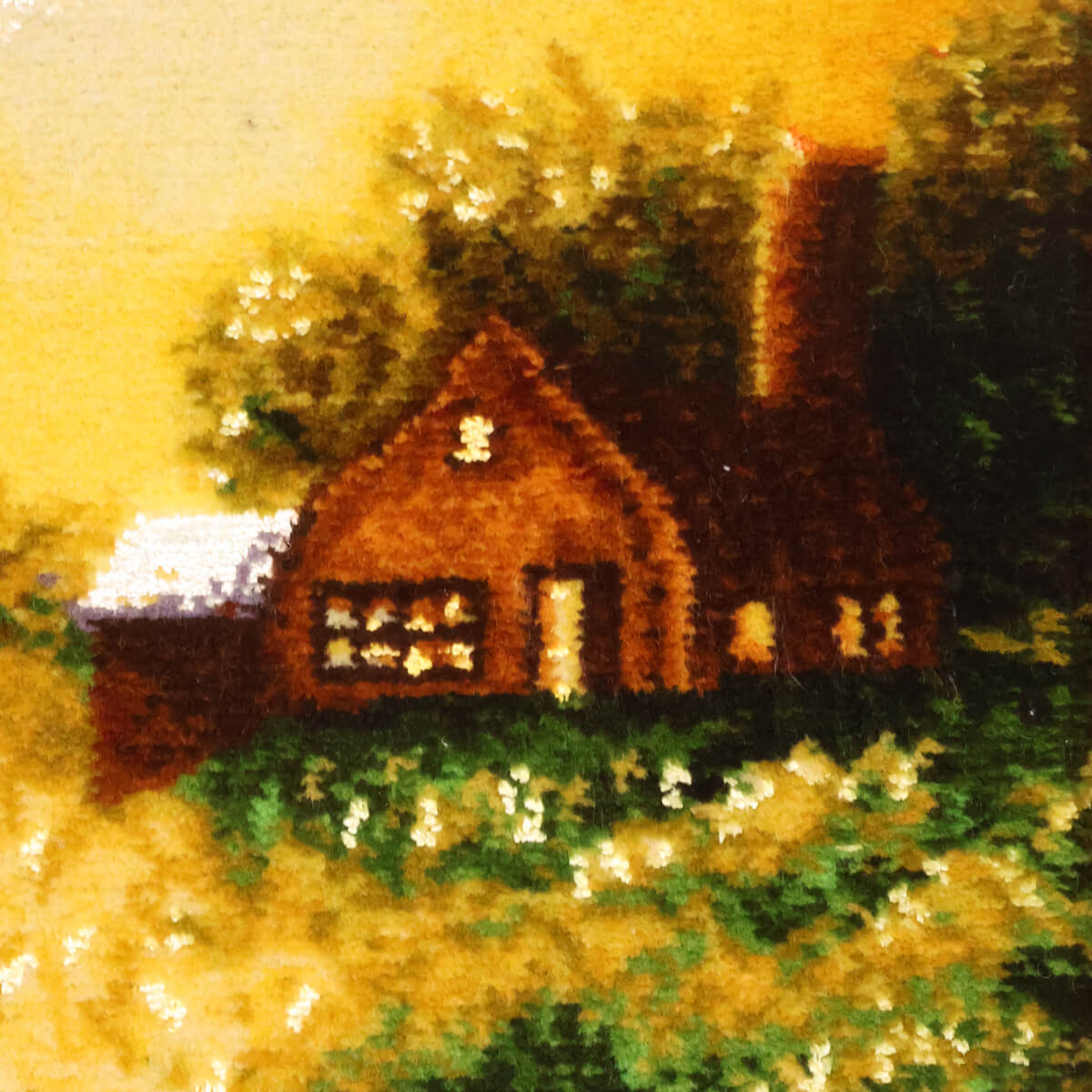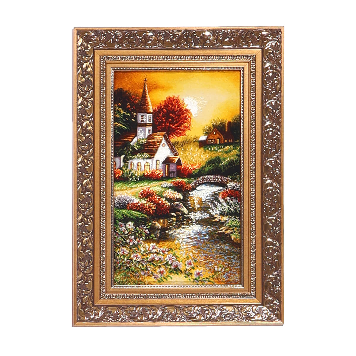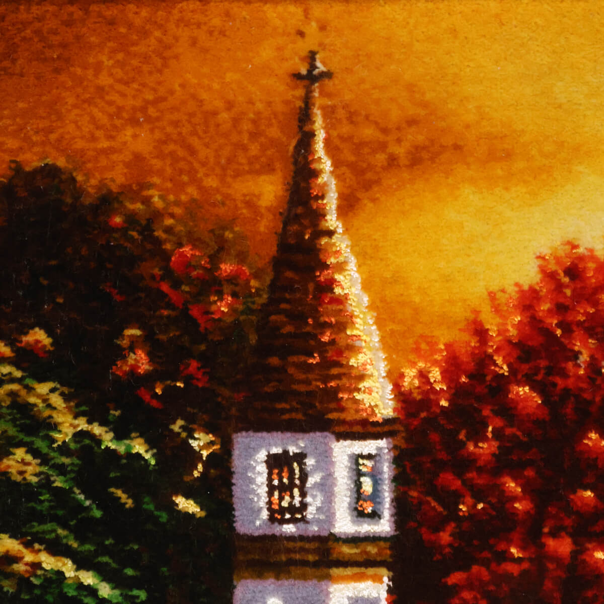 美しい教会と小川、石橋、咲き誇る花々。夕焼けに照らされた温かみのある田園風景が、絨毯の中で繊細に表現されています。どこか懐かしい、安らぎの空間を演出します。