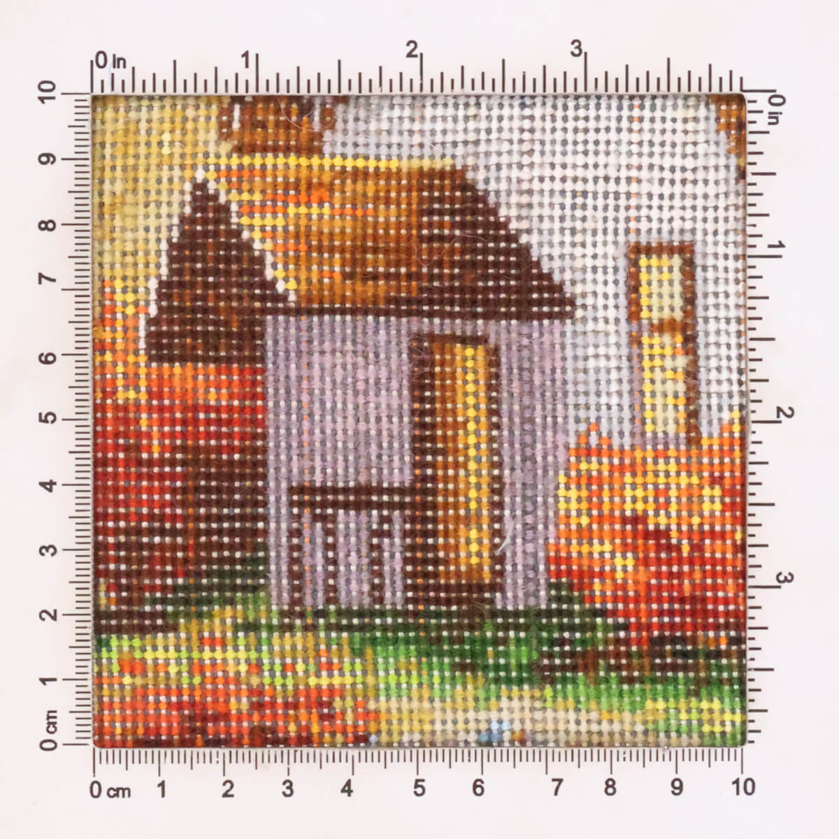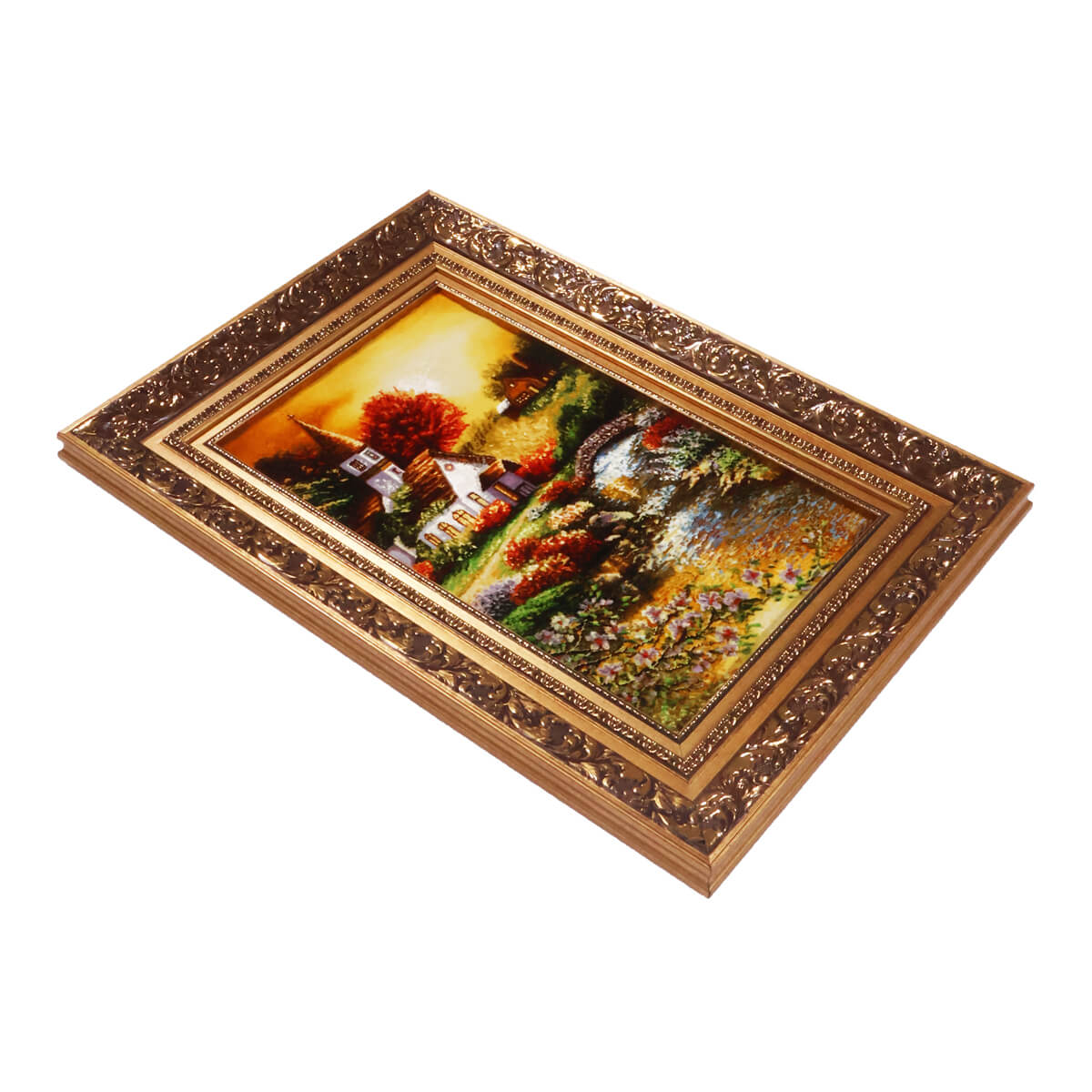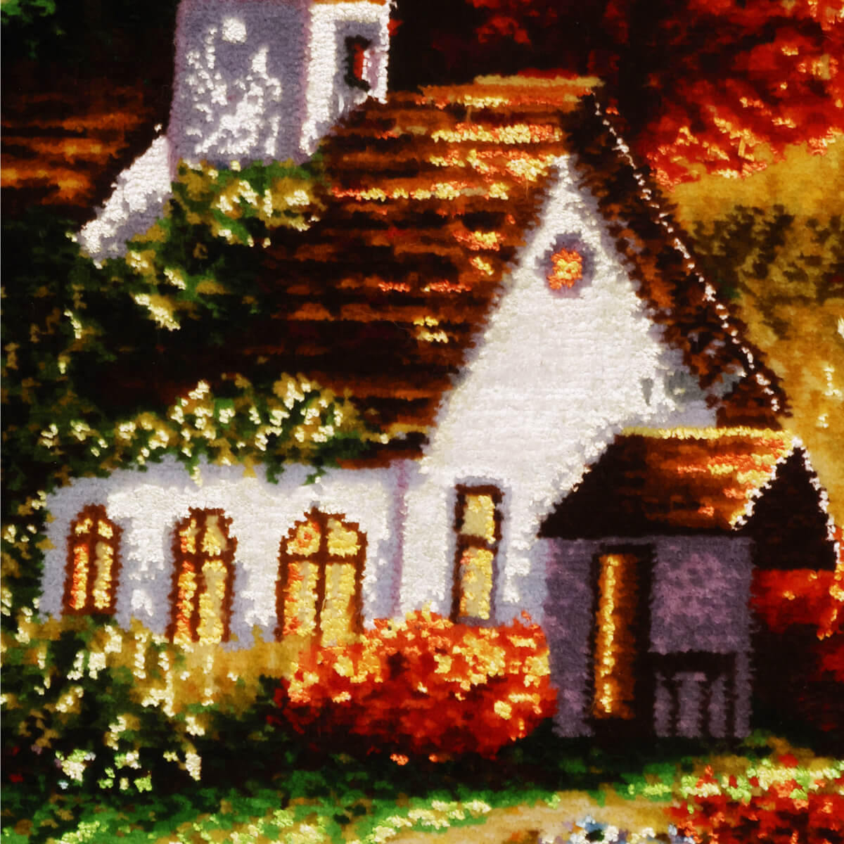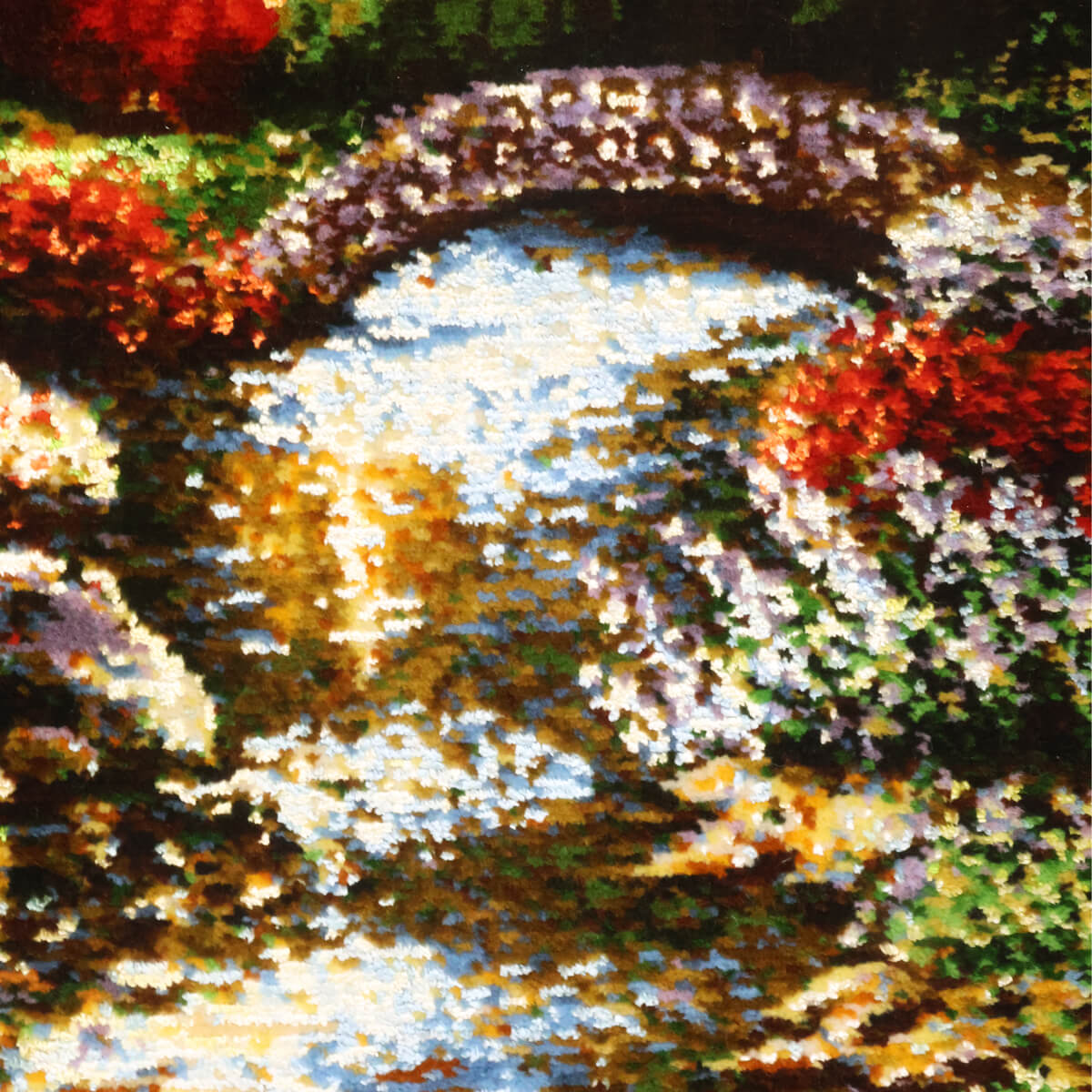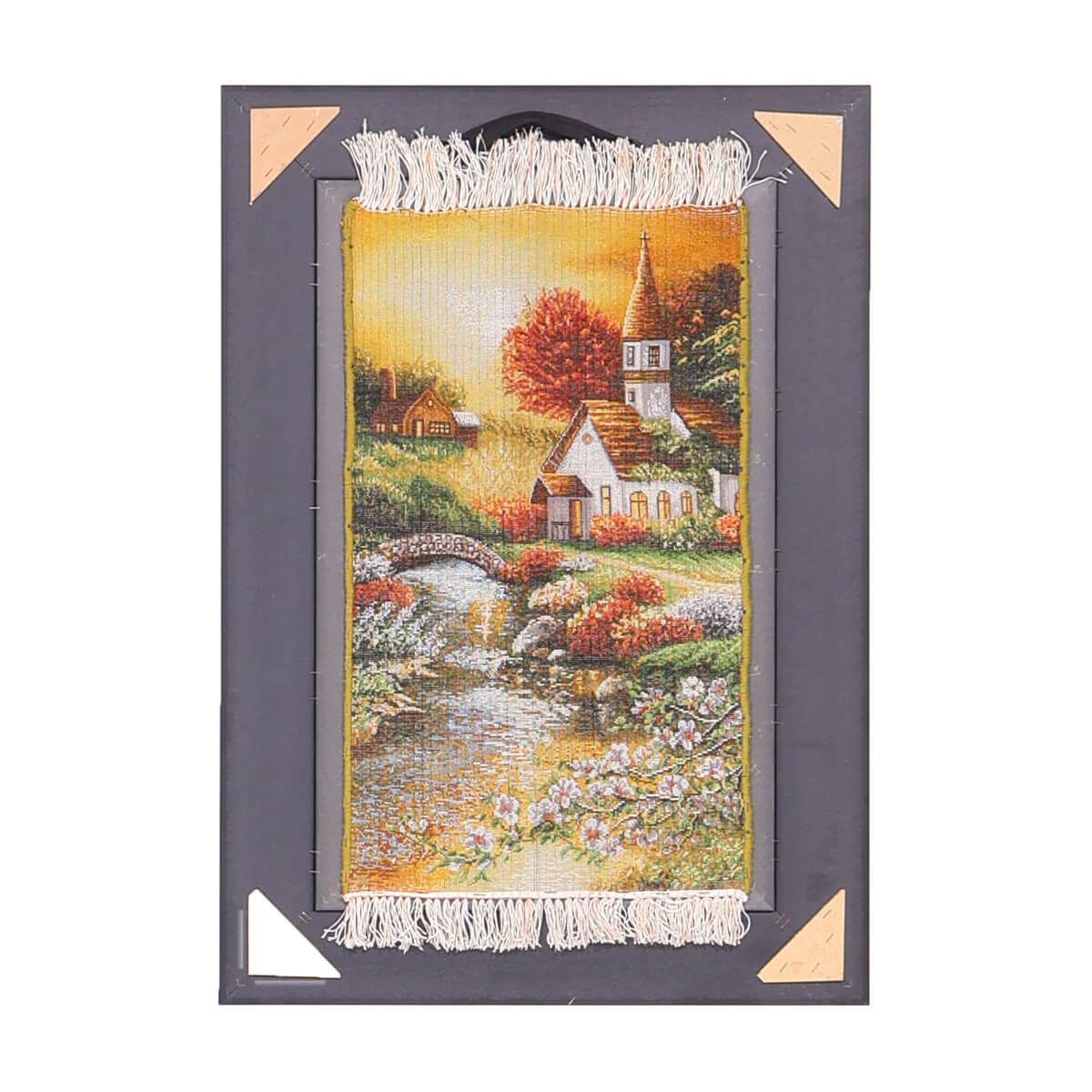 美しい教会と小川、石橋、咲き誇る花々。夕焼けに照らされた温かみのある田園風景が、絨毯の中で繊細に表現されています。どこか懐かしい、安らぎの空間を演出します。
