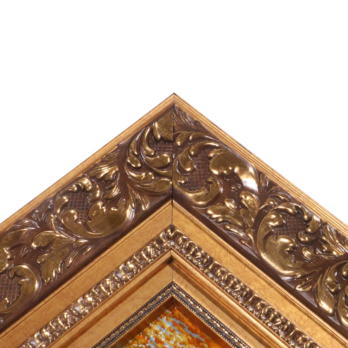 彫刻模様が美しい高級ゴールドフレームが、絨毯アートの存在感を際立たせます。届いたその日から壁に飾っていただけます。