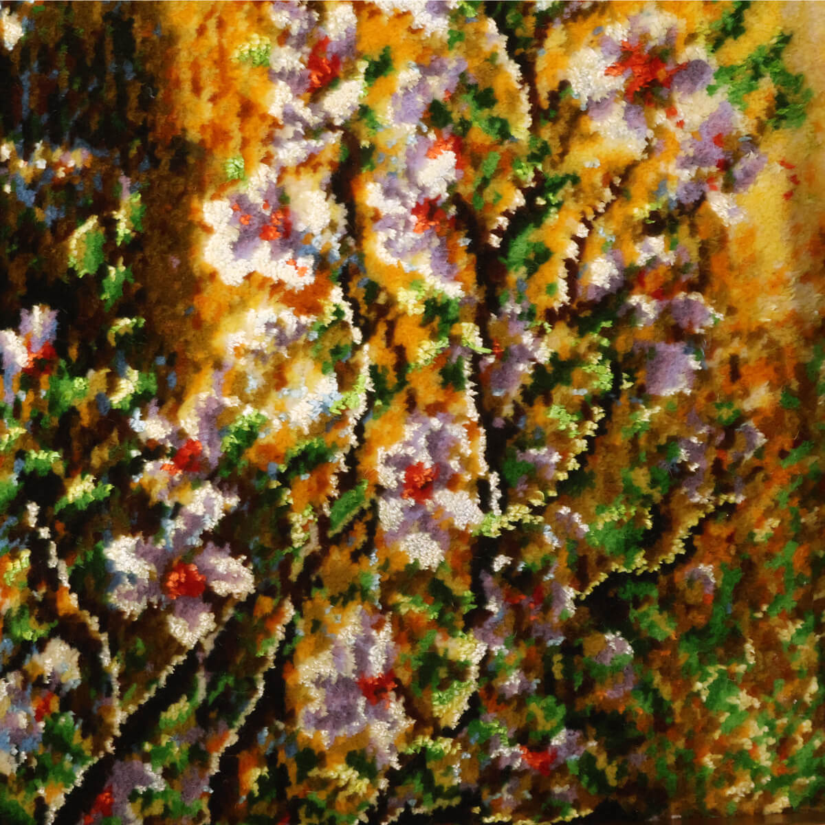 風景や人物、動物、花々など、イマジネーションと卓越した技術で描かれるモチーフは、まるでシルクのキャンバスに描かれたような、唯一無二の芸術絨毯です。