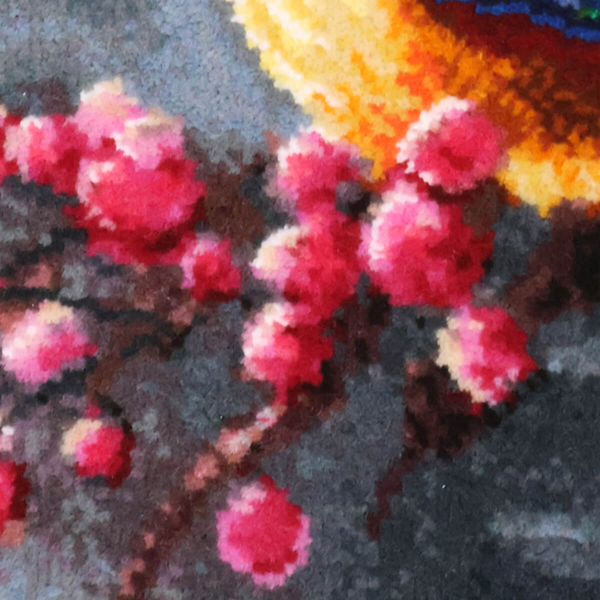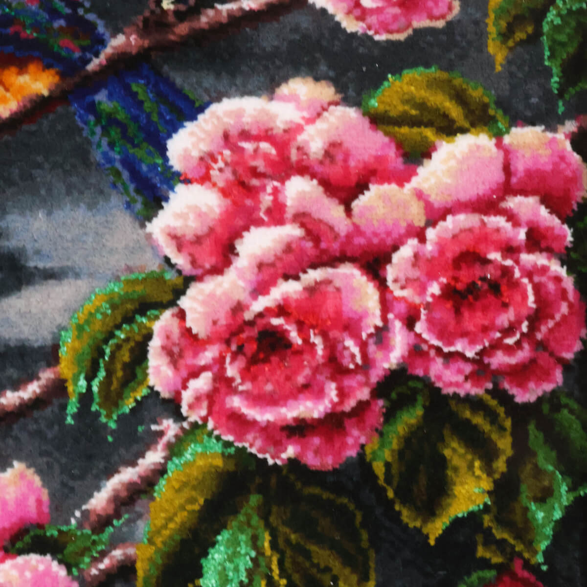 この絨毯は、鮮やかな色合いと小鳥、バラの華やかさが本当に素敵です。お部屋に飾るだけで気分が明るくなり、春の訪れを感じさせてくれます。贈り物にもぜひどうぞ。ご相談もお気軽にご連絡ください!