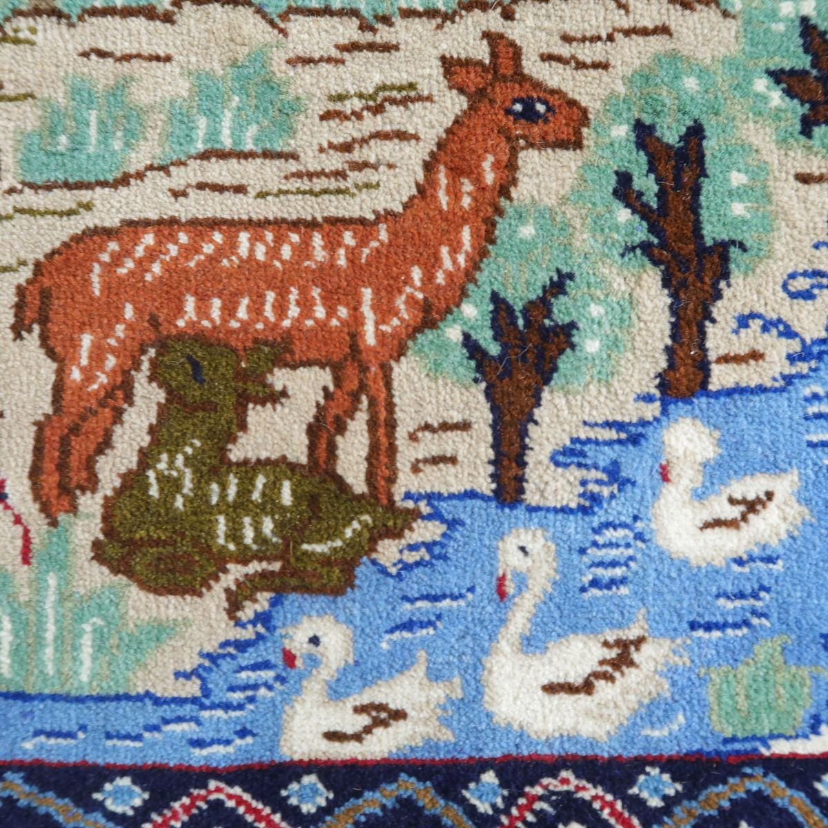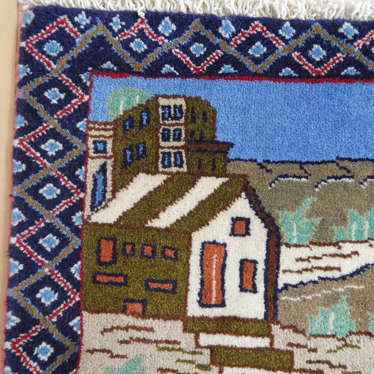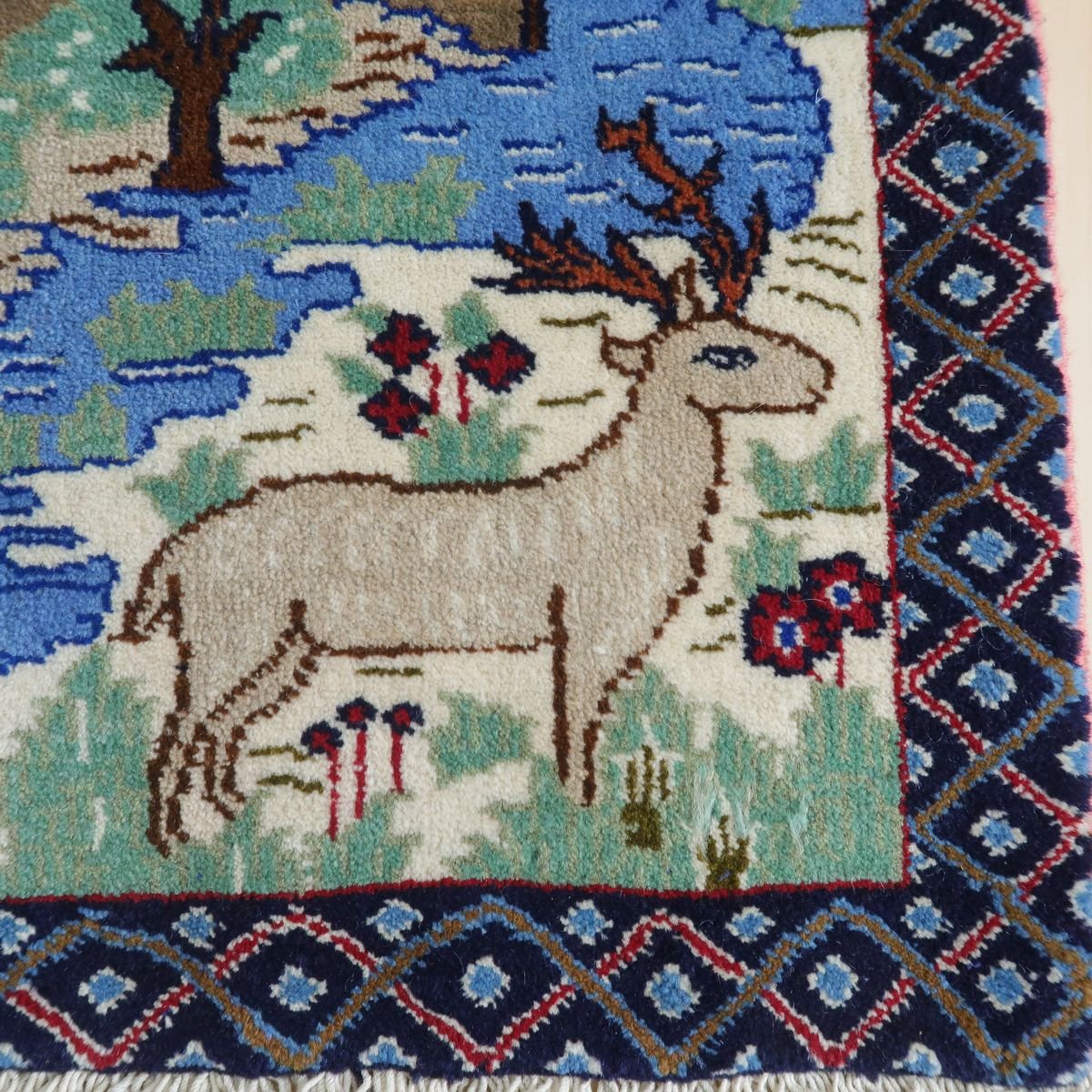 身の回りの自然の風景をバランスの良い絵にしたピクチャー絨毯です。野山の様子や色々な動物たちの表情の一つ一つをじっくり見てみるとたいへん丁寧に表現されていて、見るたび楽しい温かみある絨毯です。程よい厚みがあり柔らかな手触りのウールでしっとり心地の良い踏み心地。壁掛けとしてタペストリー加工も対応できます。