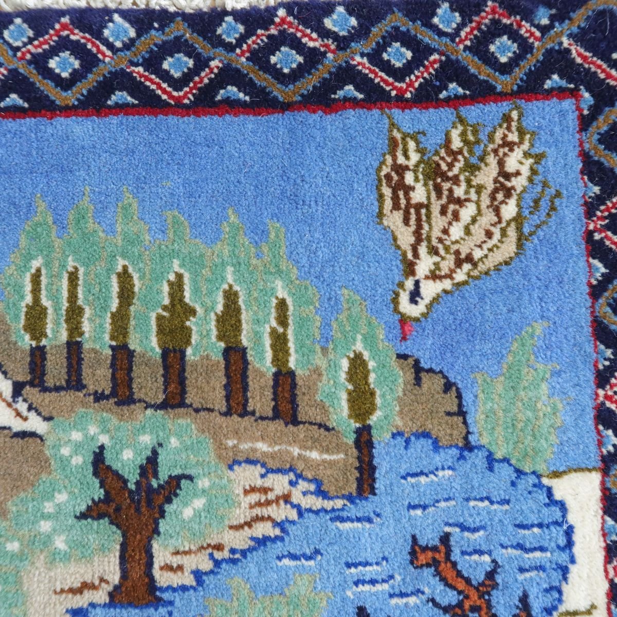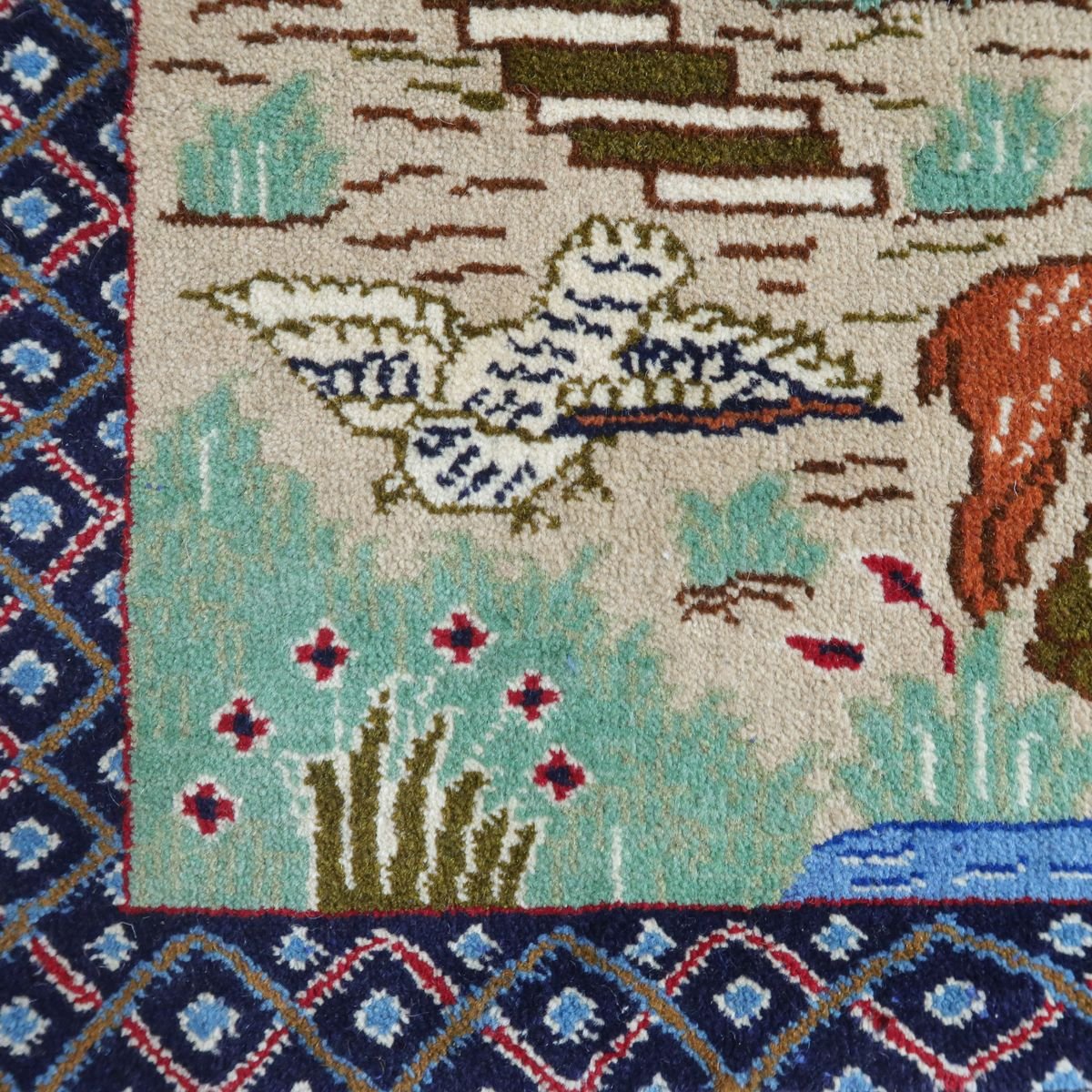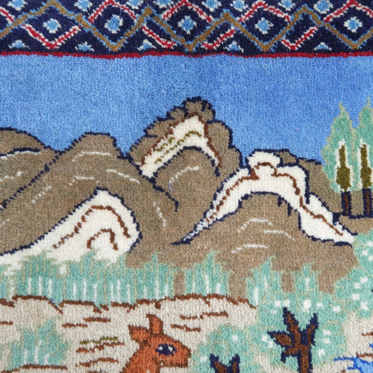 身の回りの自然の風景をバランスの良い絵にしたピクチャー絨毯です。野山の様子や色々な動物たちの表情の一つ一つをじっくり見てみるとたいへん丁寧に表現されていて、見るたび楽しい温かみある絨毯です。程よい厚みがあり柔らかな手触りのウールでしっとり心地の良い踏み心地。壁掛けとしてタペストリー加工も対応できます。