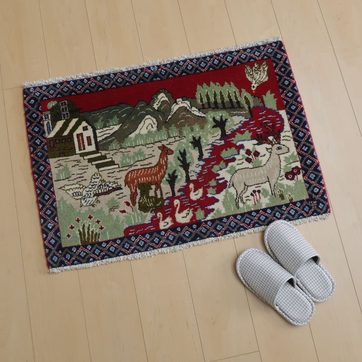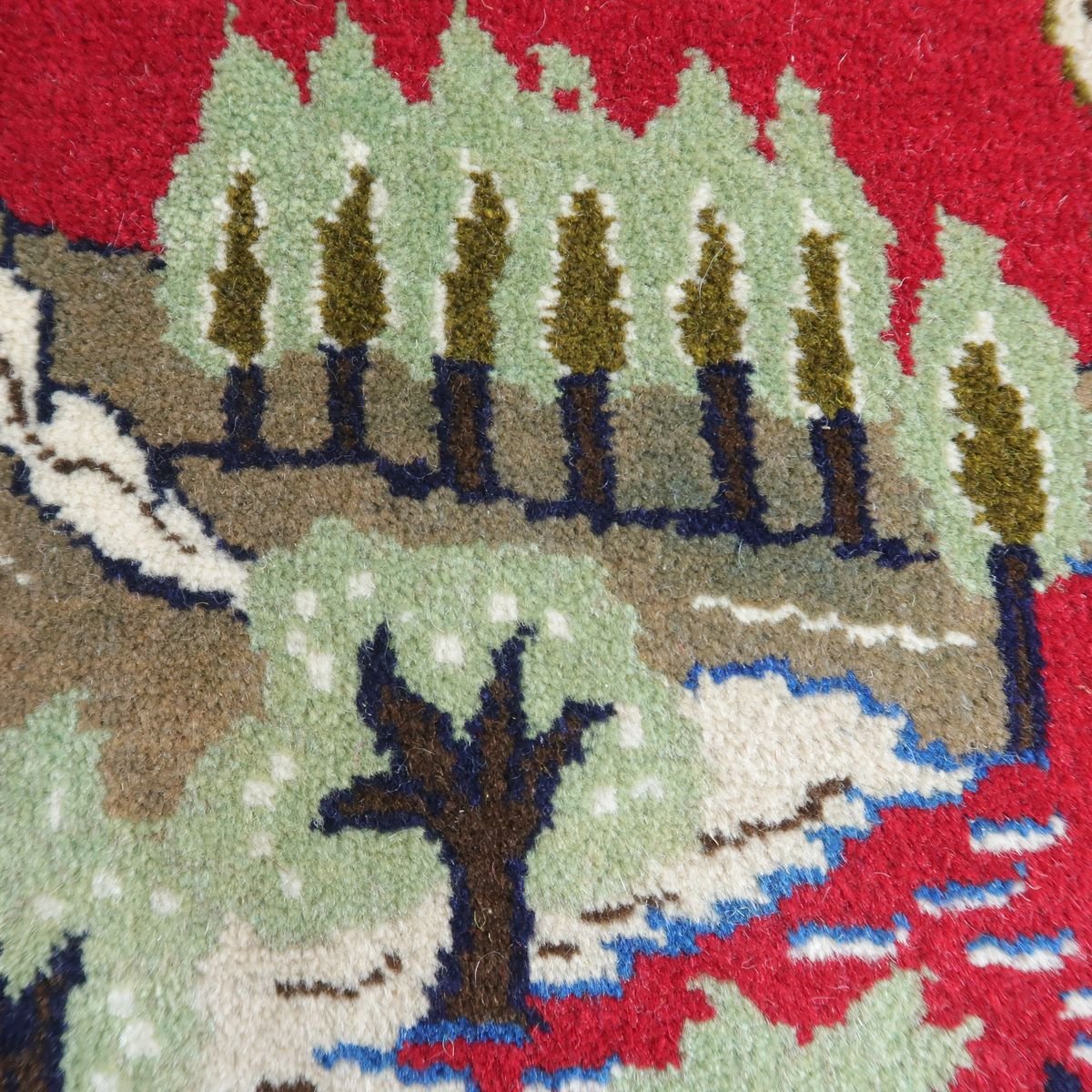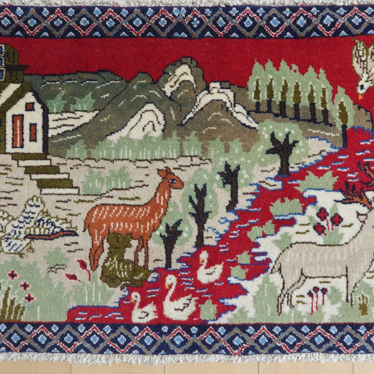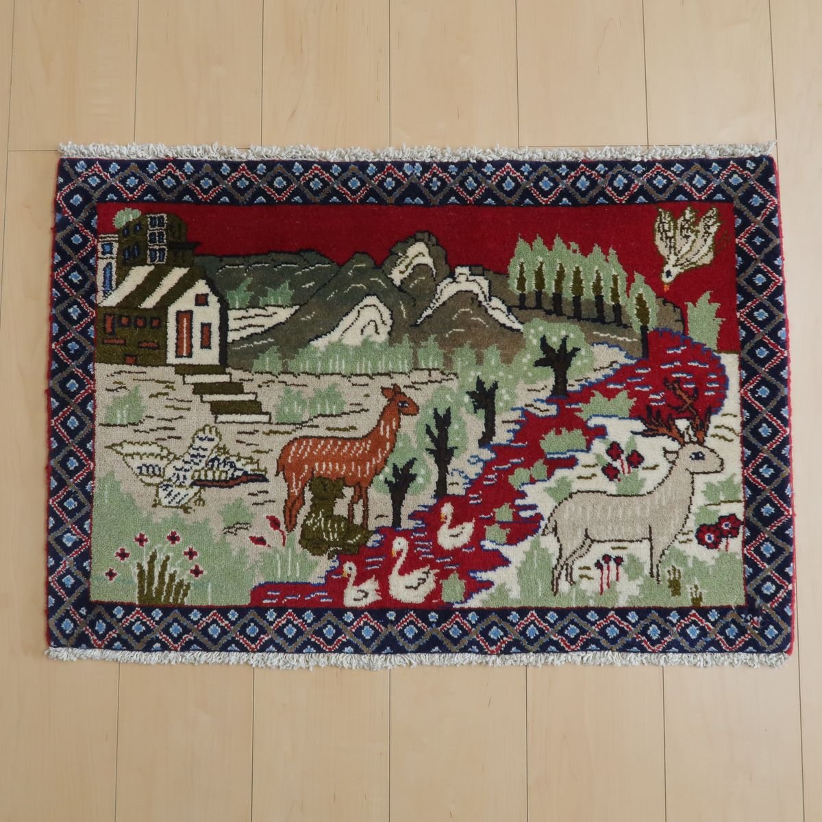 身の回りの自然の風景をバランスの良い絵にしたピクチャー絨毯です。夕焼けに染まる野山の様子や色々な動物たちの表情の一つ一つをじっくり見てみるとたいへん丁寧に表現されていて、見るたび楽しい温かみある絨毯です。程よい厚みがあり柔らかな手触りのウールでしっとり心地の良い踏み心地。壁掛けとしてタペストリー加工も対応できます。