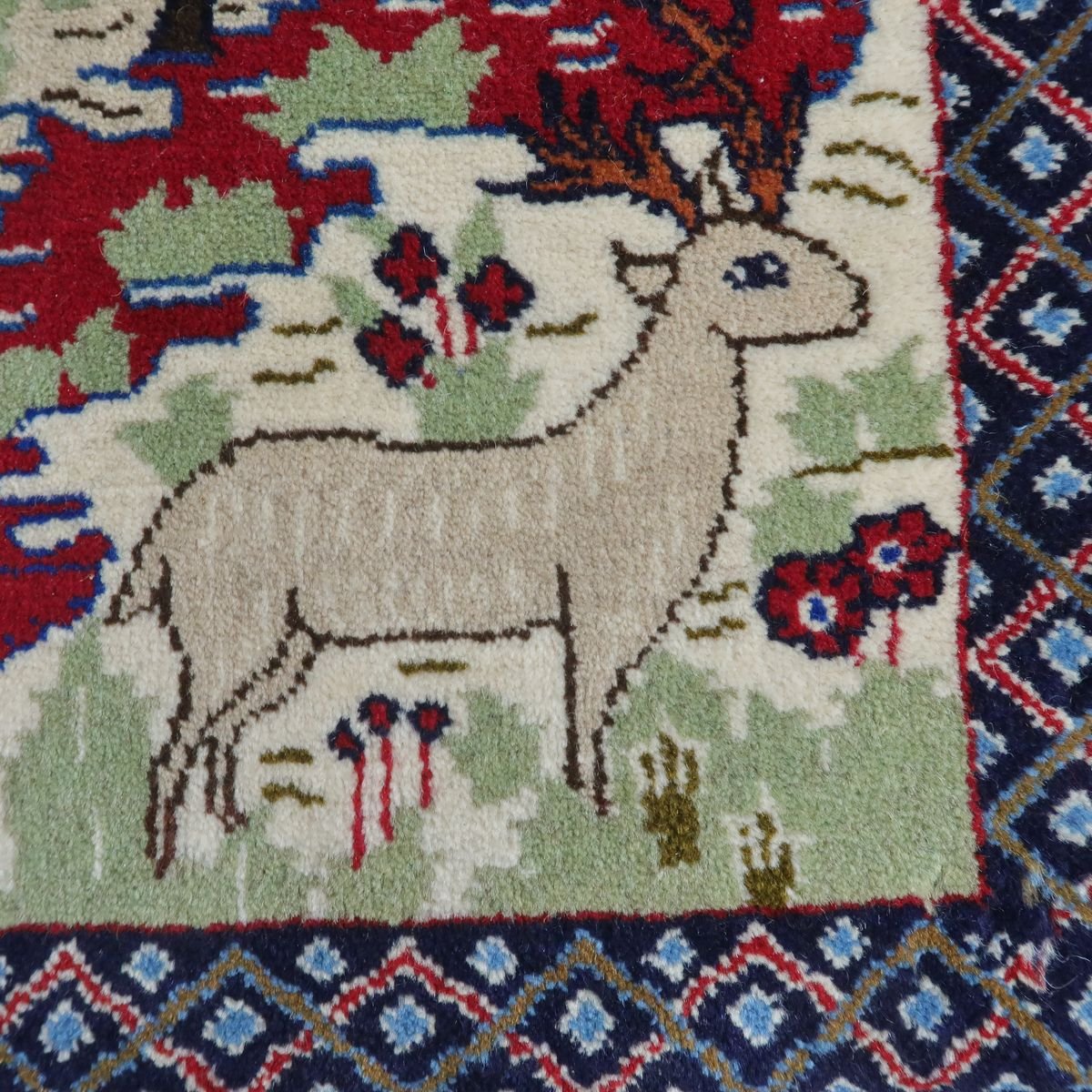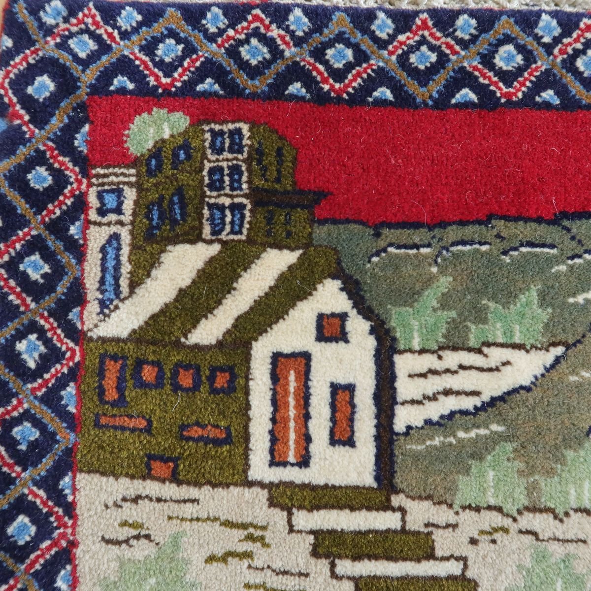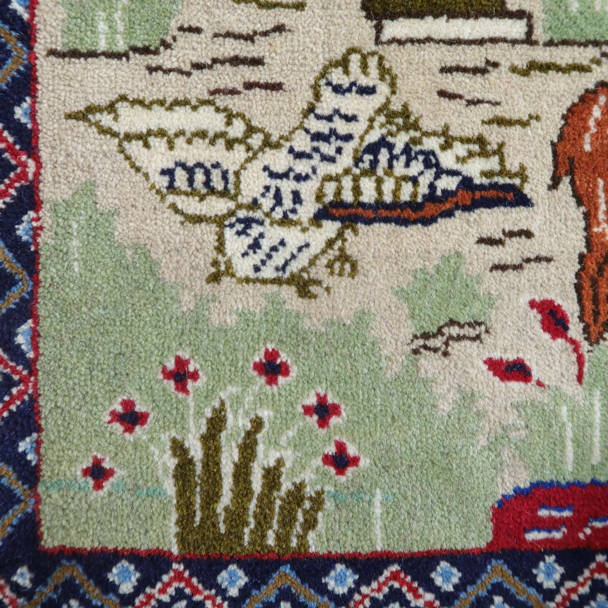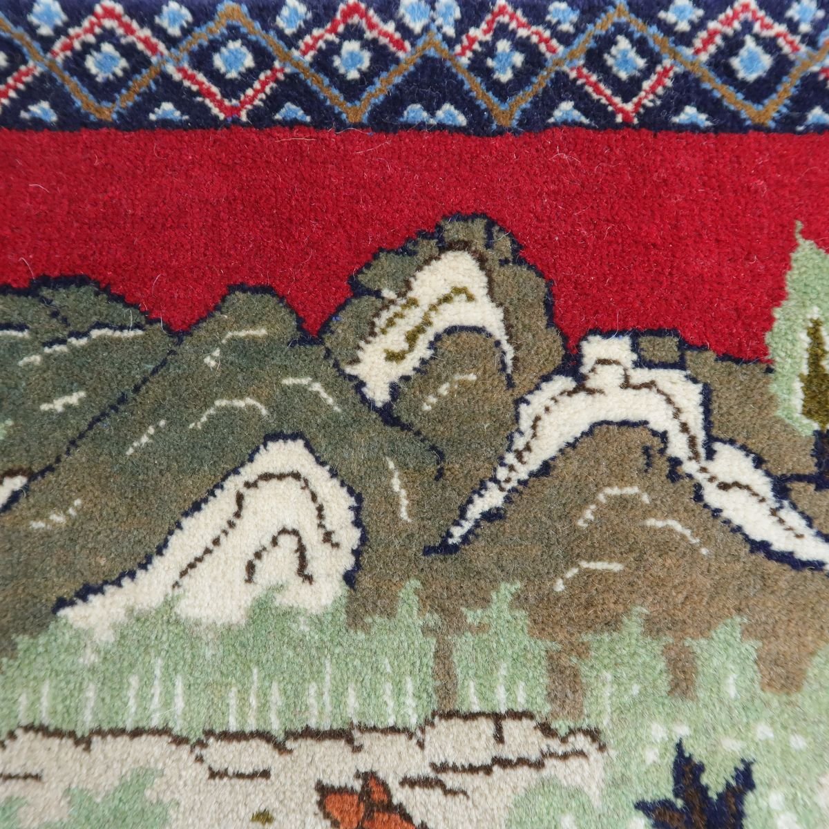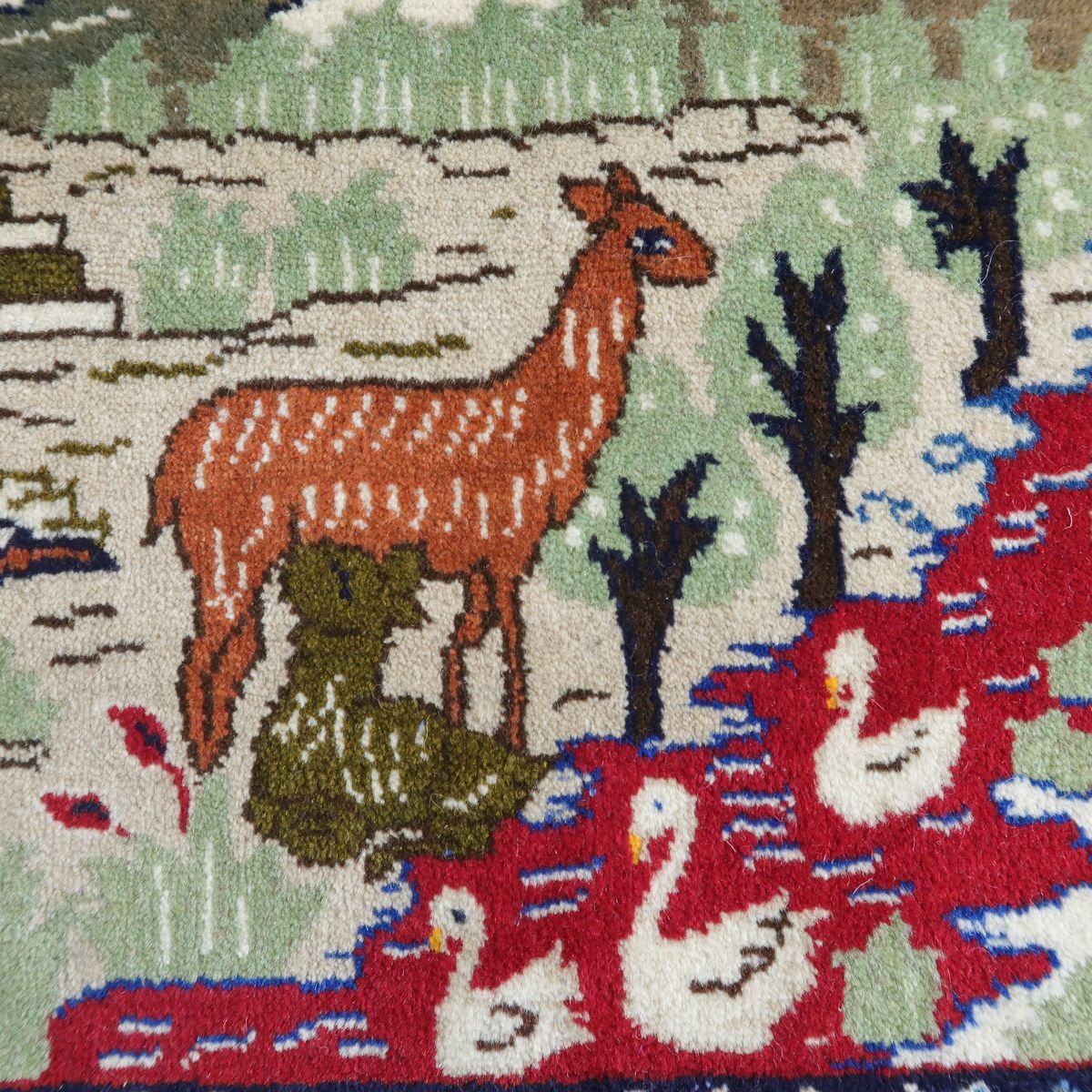 身の回りの自然の風景をバランスの良い絵にしたピクチャー絨毯です。夕焼けに染まる野山の様子や色々な動物たちの表情の一つ一つをじっくり見てみるとたいへん丁寧に表現されていて、見るたび楽しい温かみある絨毯です。程よい厚みがあり柔らかな手触りのウールでしっとり心地の良い踏み心地。壁掛けとしてタペストリー加工も対応できます。