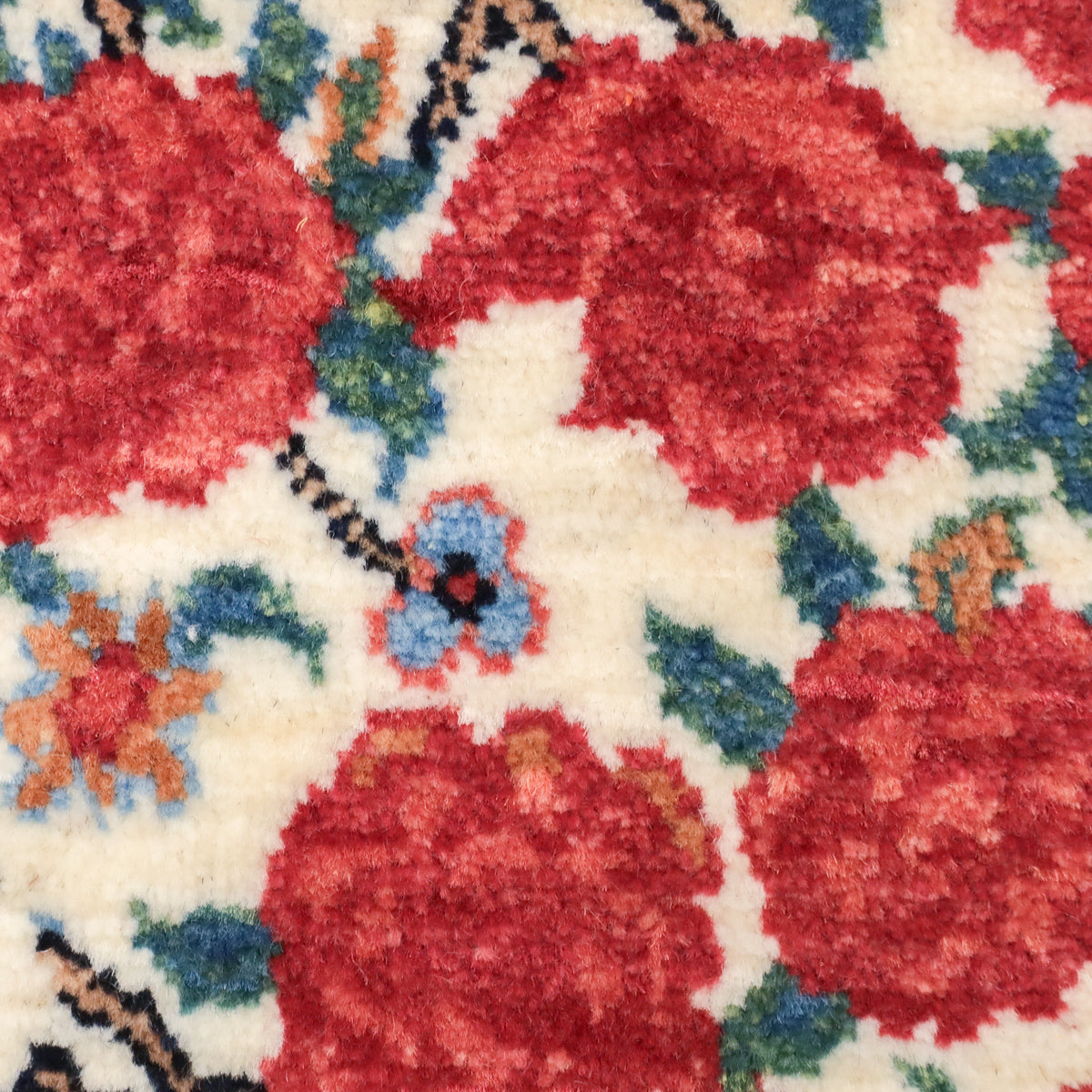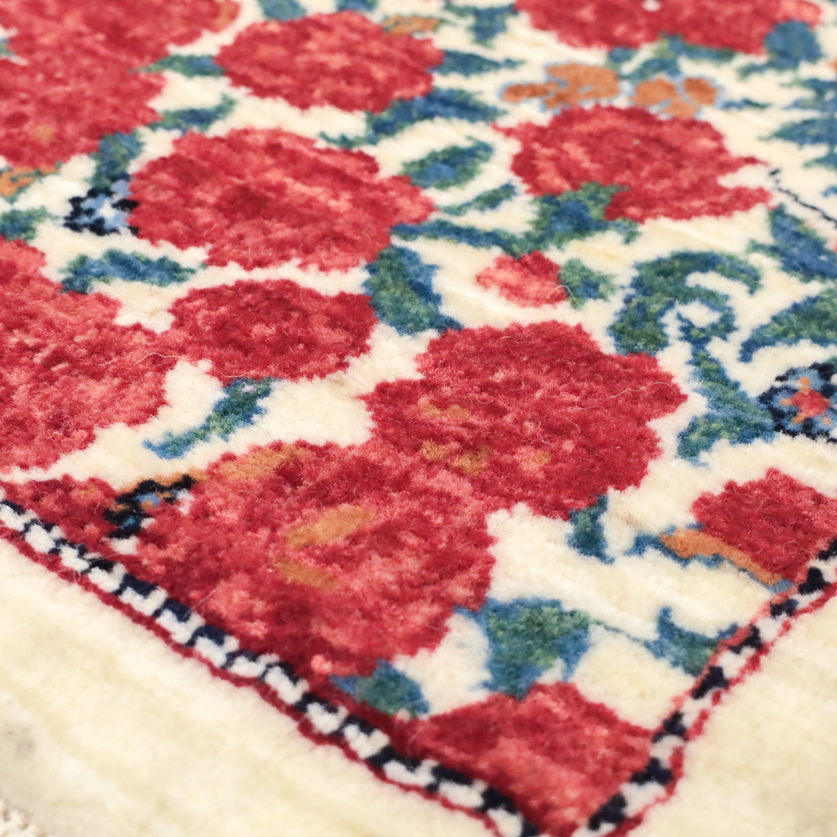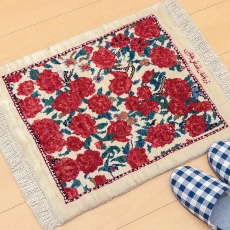 クリーム色を背景に咲き乱れるバラの花をふんだんに配置した、上品な華やかさがたいへん美しいデザイン。目の詰まったさらりと肉厚の生地、踏むたびに、しっとりハリのあるウールの感触が心地の良いハイランクの品です。