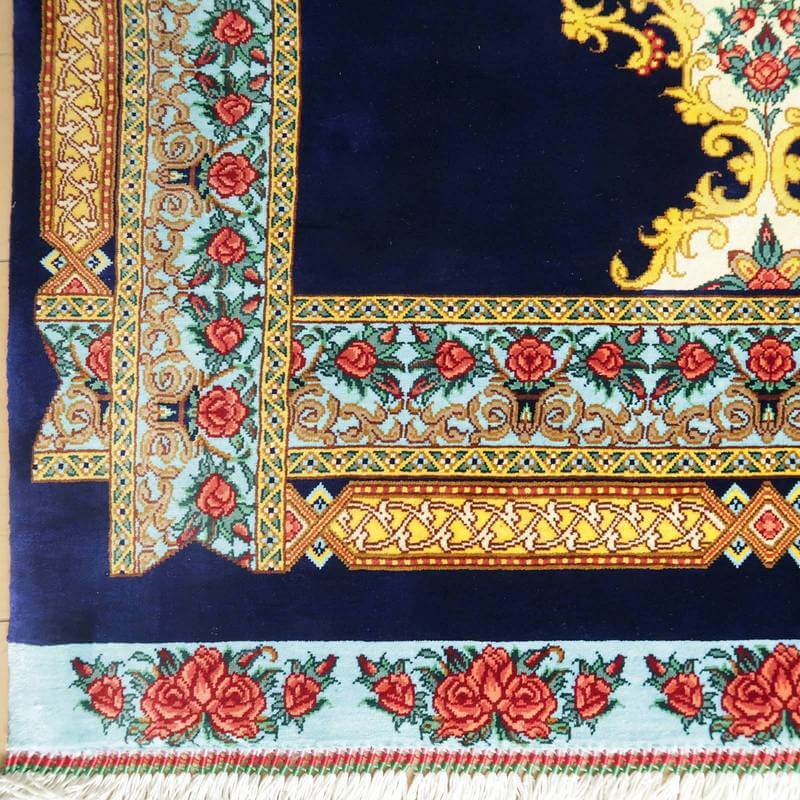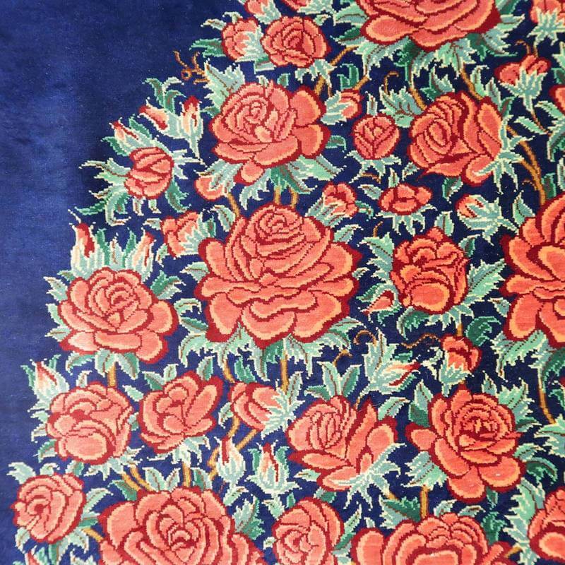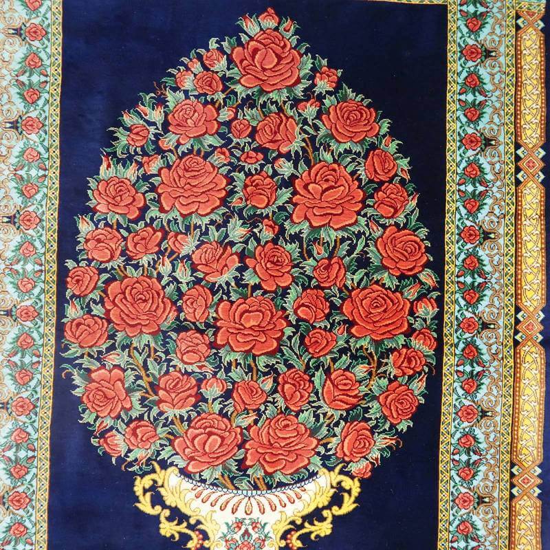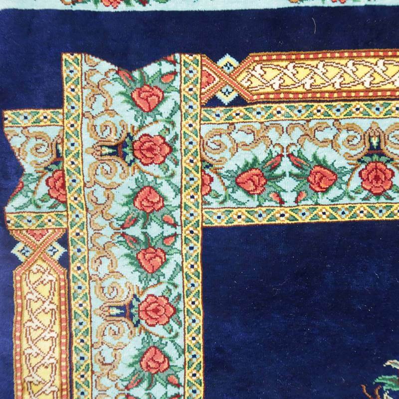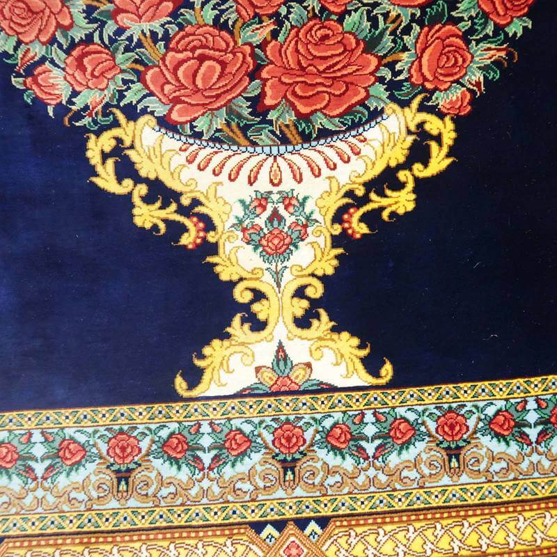 驚くような細かな織り目とビロードのような生地、肌に吸い付くようなシルクの艶やかな光沢感が豪華絢爛。まさに、「The ペルシャ絨毯」と言うべき最高峰のペルシャ絨毯は、もはや工芸品ではなく美術品としての価値となります。シルクの絨毯は毛足の光沢が見る向きによってまったく趣の異なる色合いになりますので、敷く際は向きを調整していただくとよいです。