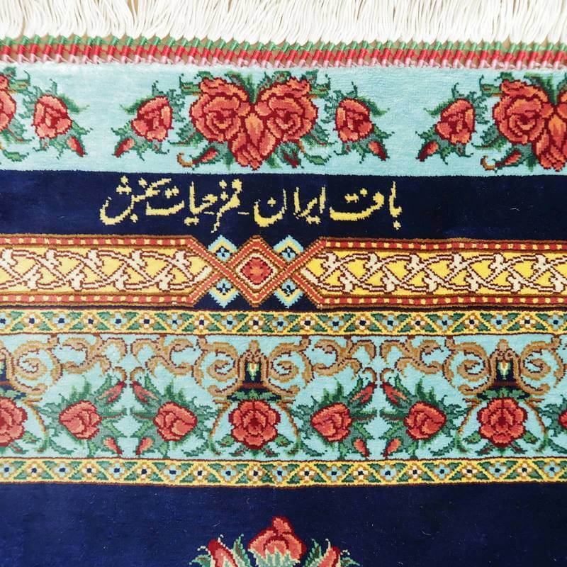 花瓶いっぱいに活けられた赤いバラのデザインは、紺色の背景にくっきりと浮き立つような存在感。周りには水色と金色を基調とした小さなバラ柄のリボンの帯が、豪華な額縁となって、美しさをいっそう際立たせています。「バフテ イラン ゴム ハヤドバフシー」のサイン入り。