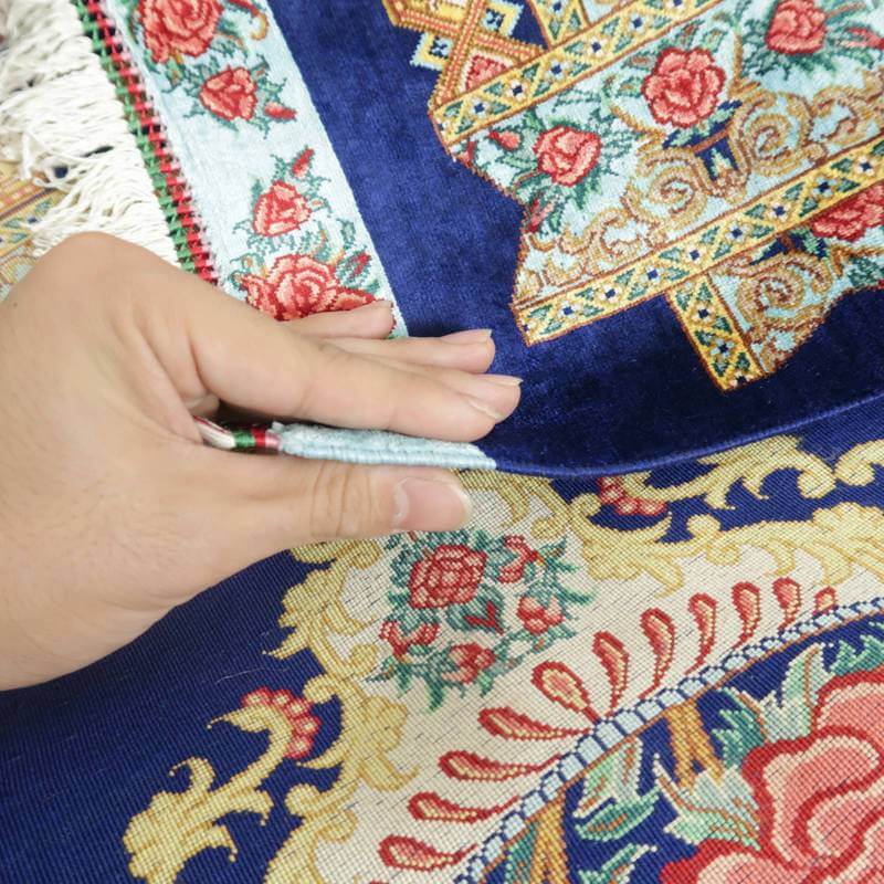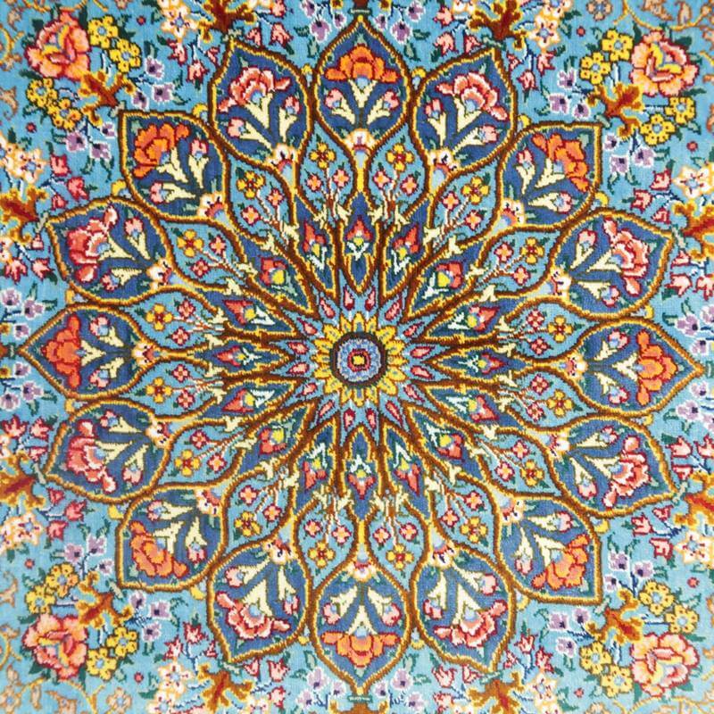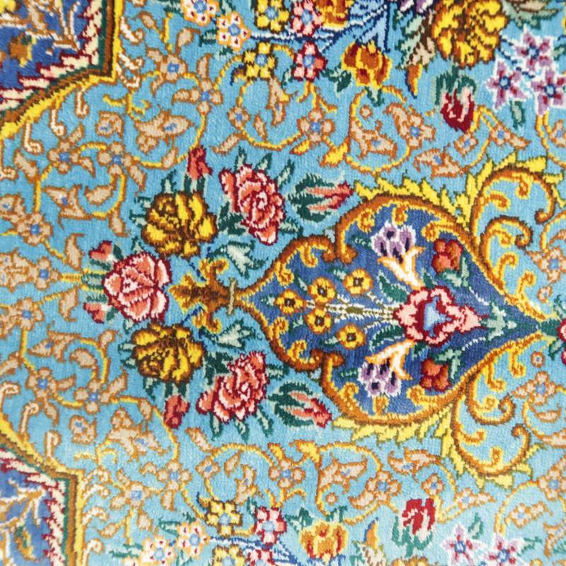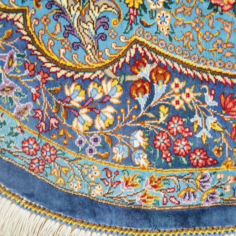 驚くような細かな織り目とビロードのような生地、肌に吸い付くようなシルクの艶やかな光沢感が豪華絢爛。まさに、「The ペルシャ絨毯」と言うべき最高峰のペルシャ絨毯は、もはや工芸品ではなく美術品としての価値となります。シルクの絨毯は毛足の光沢が見る向きによってまったく趣の異なる色合いになりますので、敷く際は向きを調整していただくとよいです。