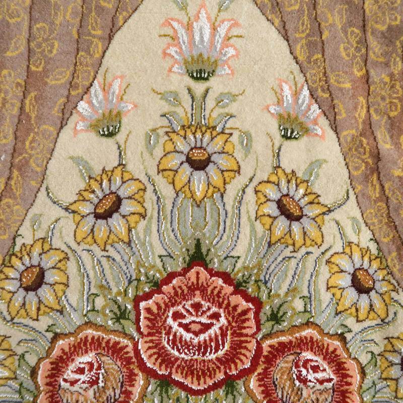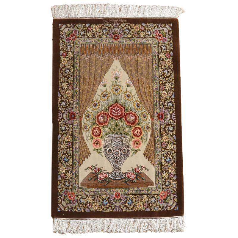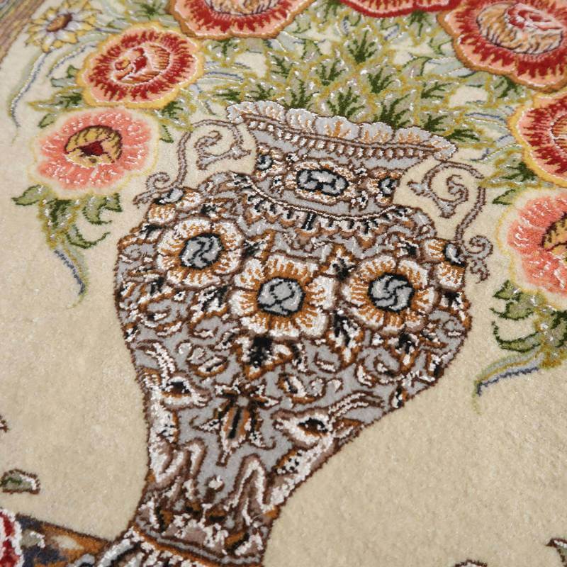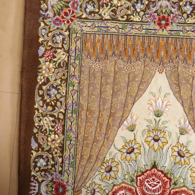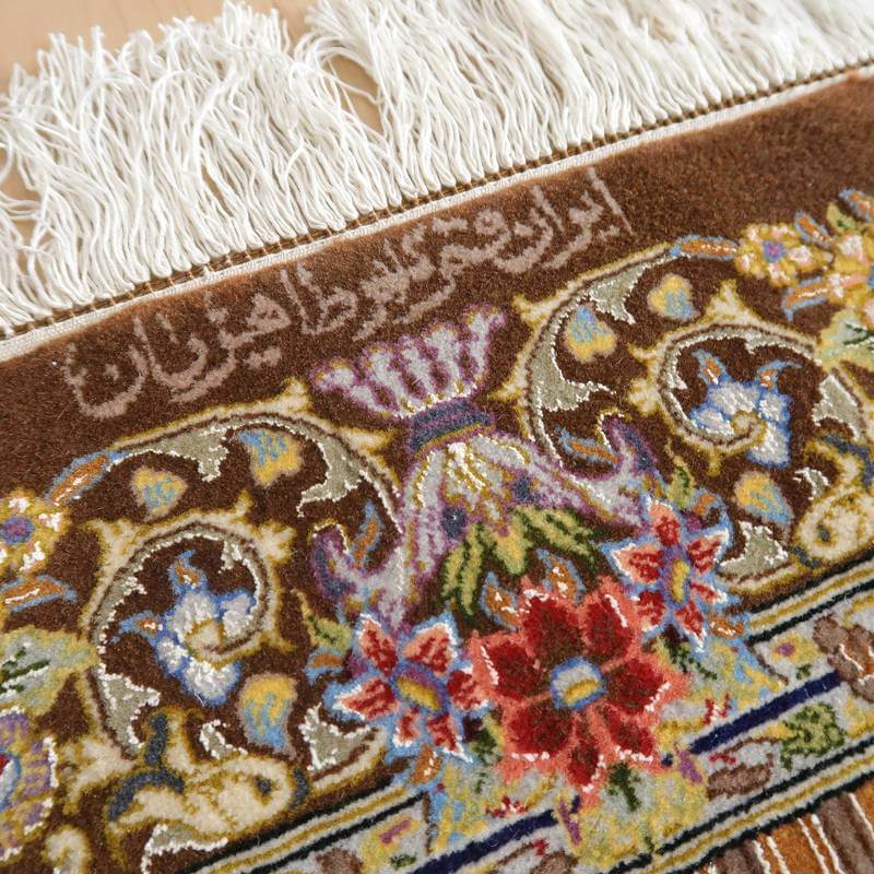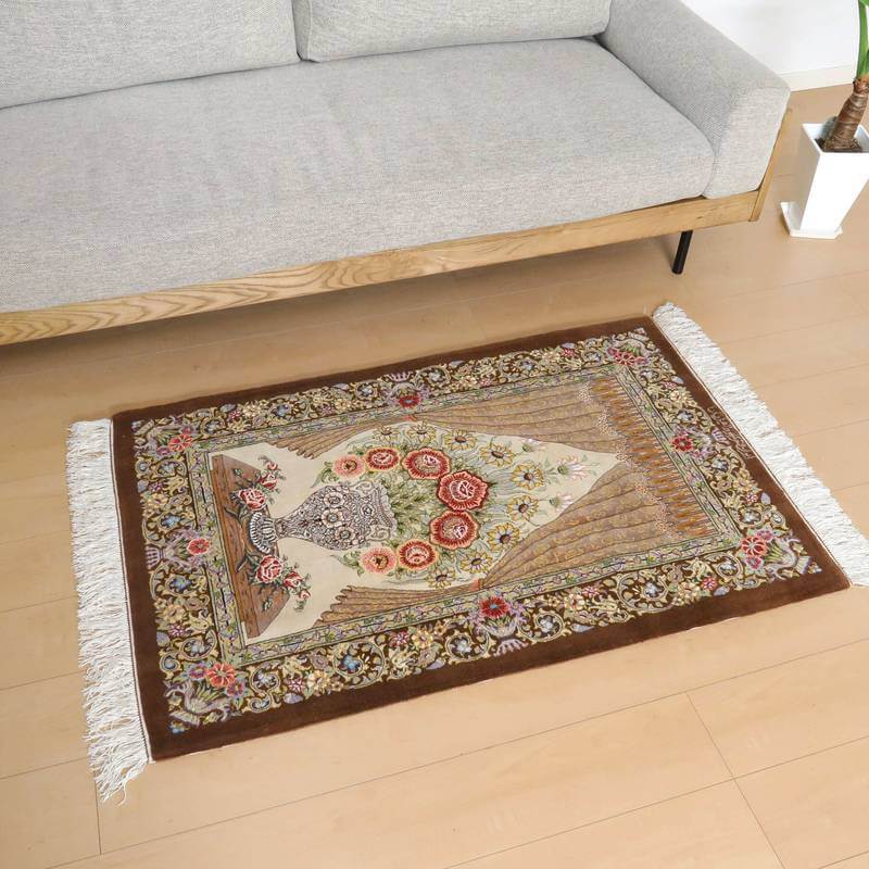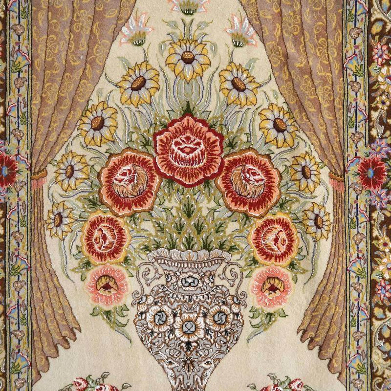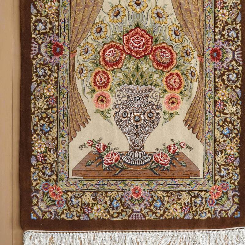 茶ベージュを基調にしたソフトな色合い、花々のセンターに印象的な薔薇の花を配した存在感のあるゴルダニ(花瓶)と、リアルなカーテン。オールシルクの滑らかな毛足の角度や方向で艶やかに輝いて見えます。絵画見るように、壁に飾るのも大変おすすめです。緻密なクムの高級絨毯は、玄関やお部屋のエリアラグとして華やかで高級な空間をつくります。