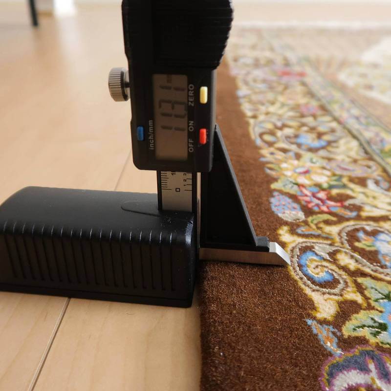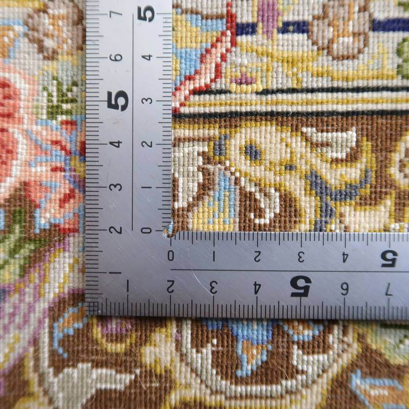 縦糸はシルクを使用しています。パイルはウールをベースにシルク糸も多用したハイランクのクム産ペルシャ絨毯です。デザインを美しく表現するために、細い糸で細かな織り目で作られています。高級ランク特有のしなやかな生地感。美術品といえるハイランクのクォリティになります。