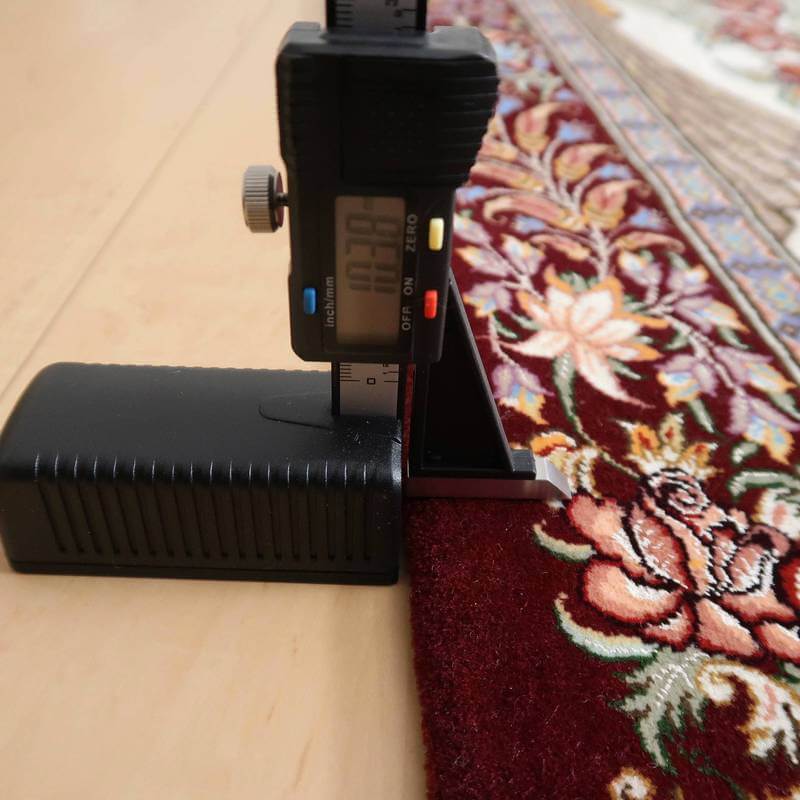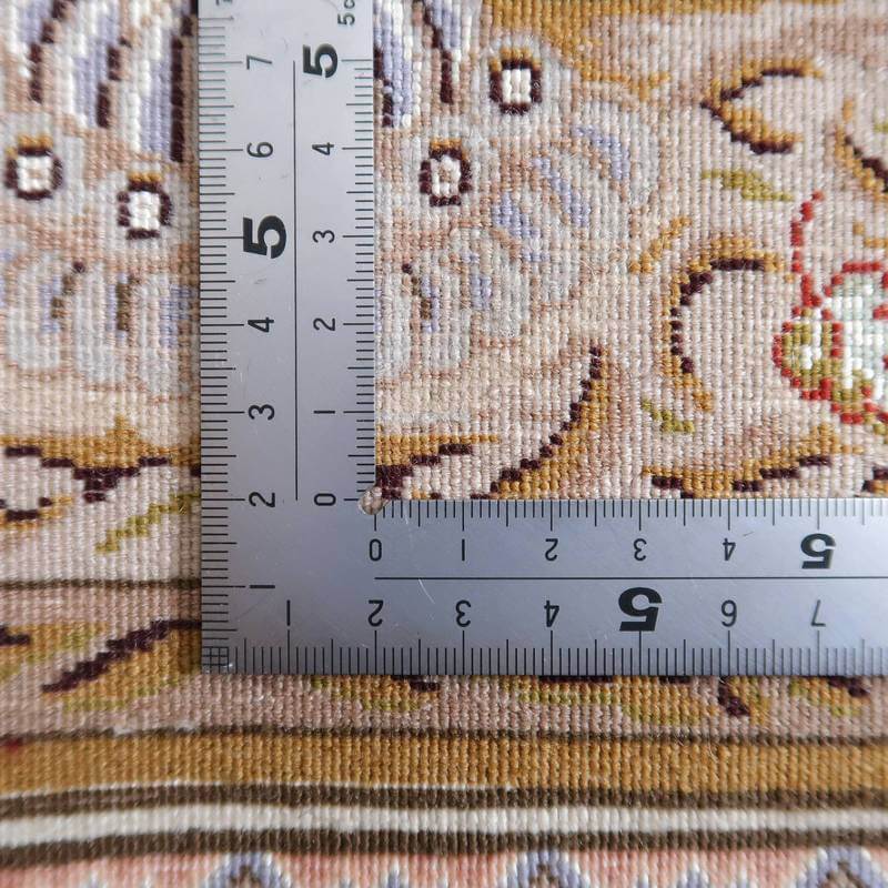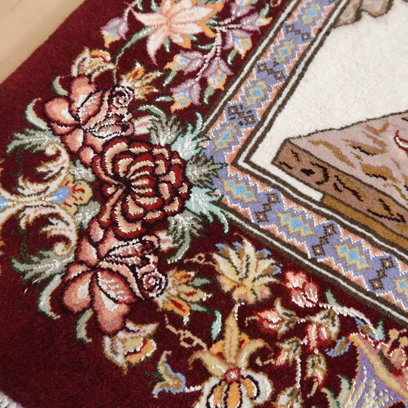 縦糸はシルクを使用しています。パイルはウールをベースにシルク糸も多用したハイランクのクム産ペルシャ絨毯です。デザインを美しく表現するために、細い糸で細かな織り目で作られています。高級ランク特有のしなやかな生地感。美術品といえるハイランクのクォリティになります。