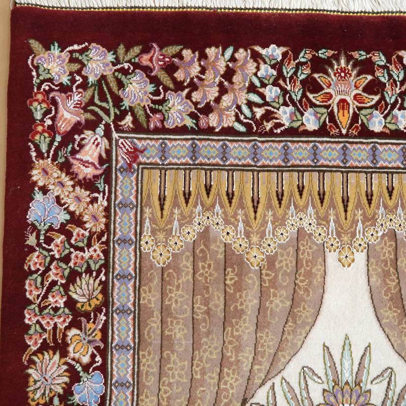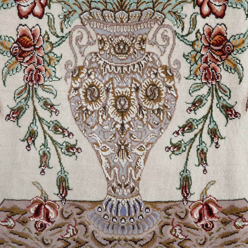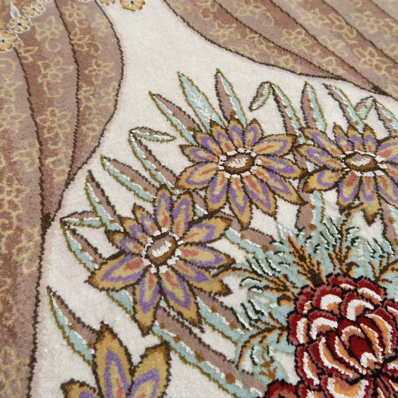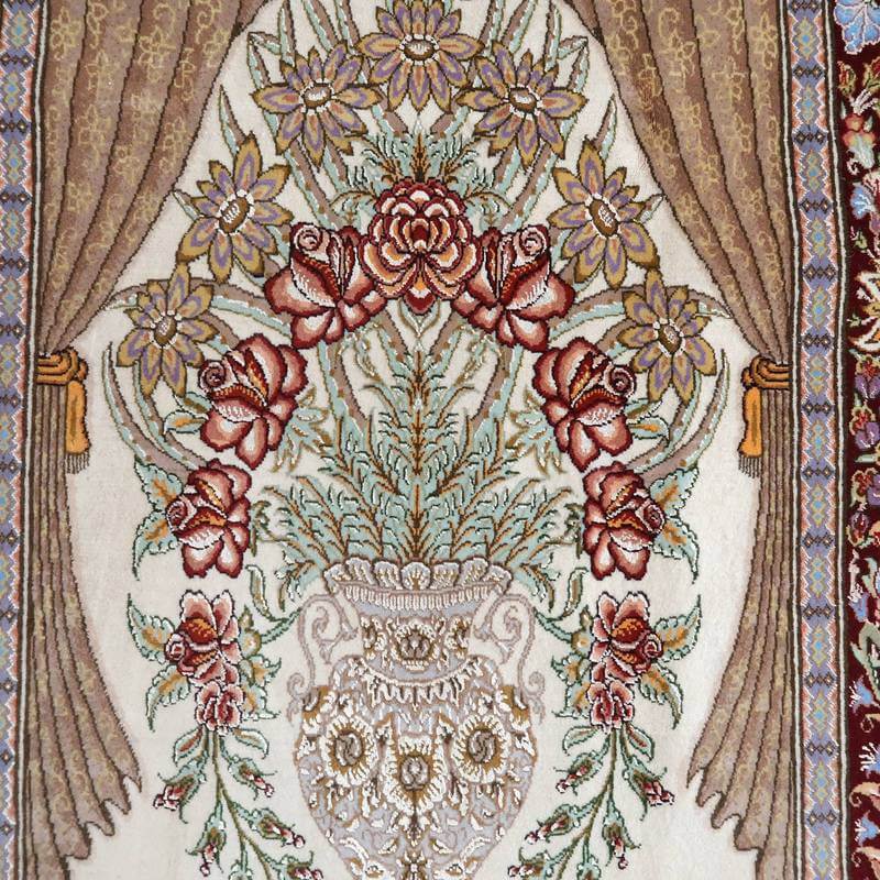 赤茶のボーダーとベージュを基調にしたソフトな色合い、花々のセンターに印象的な薔薇の花を配した存在感のあるゴルダニ(花瓶)と、リアルなカーテン。オールシルクの滑らかな毛足の角度や方向で艶やかに輝いて見えます。絵画見るように、壁に飾るのも大変おすすめです。緻密なクムの高級絨毯は、玄関やお部屋のエリアラグとして華やかで高級な空間をつくります。