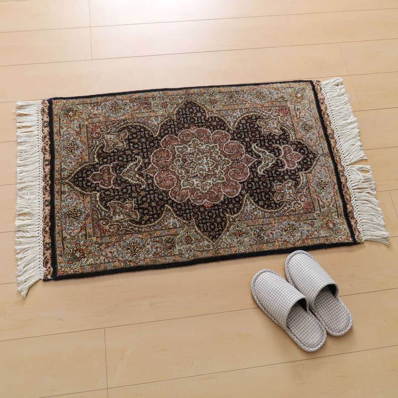遠目には落ち着いたカラーながら、近くで見ると実に様々なカラーが使われた多彩で細かなデザイン。タブリーズ地方に伝わる上品なマヒ(魚)デザインの玄関マットです。上質なウールを使ってかたく丁寧に織られたハリのある手触りで上質感がございます。