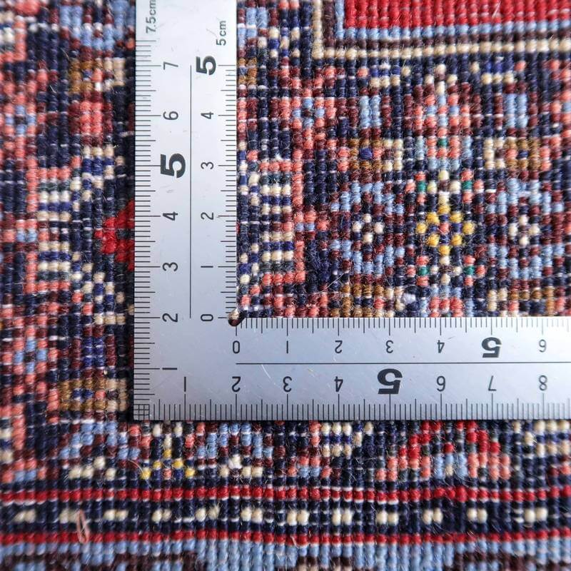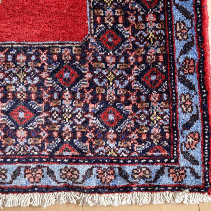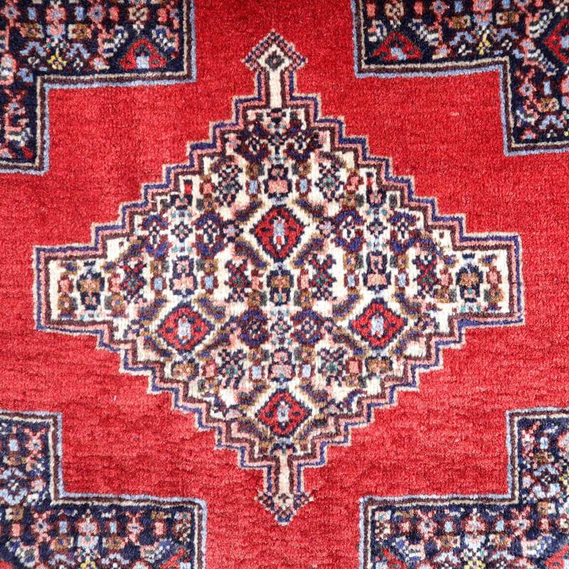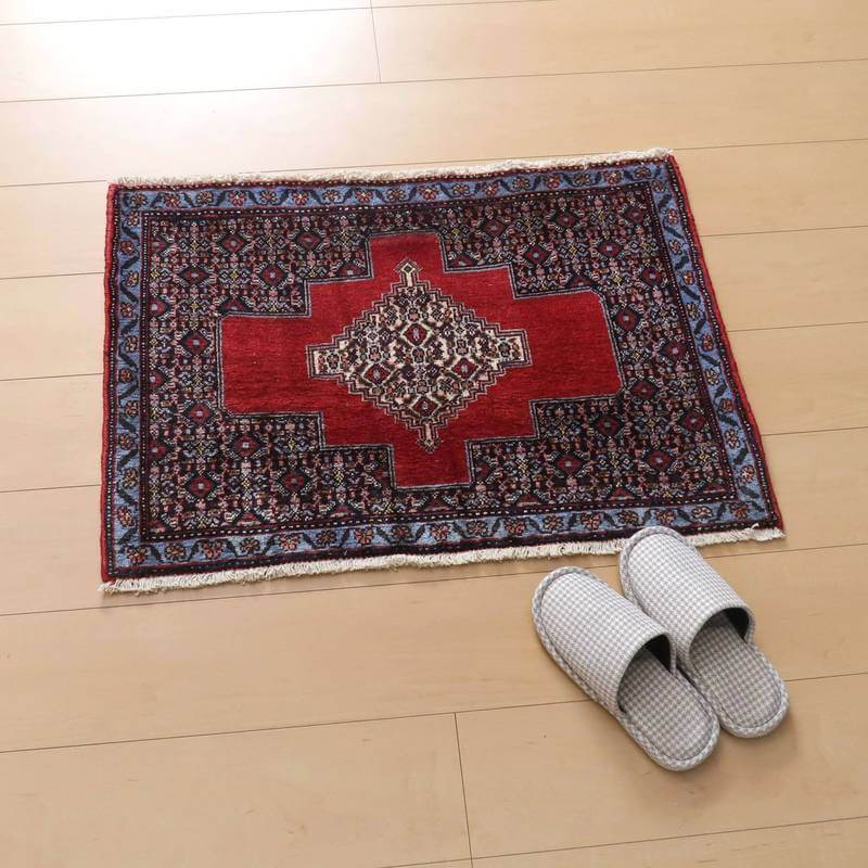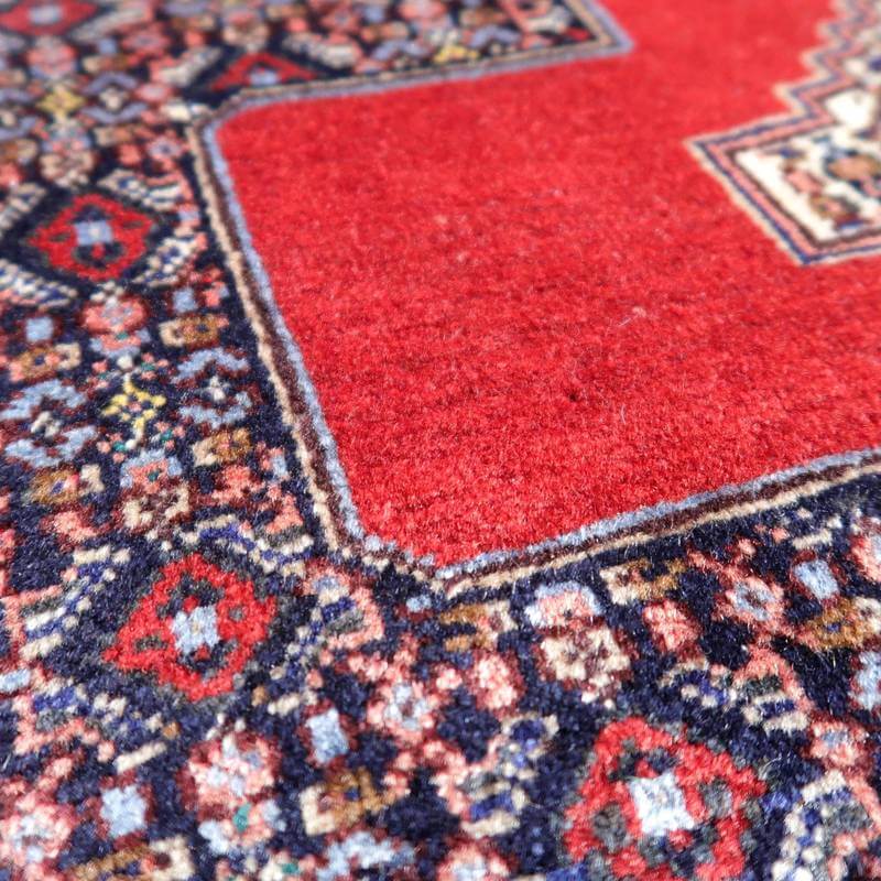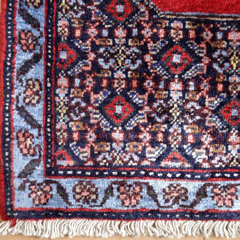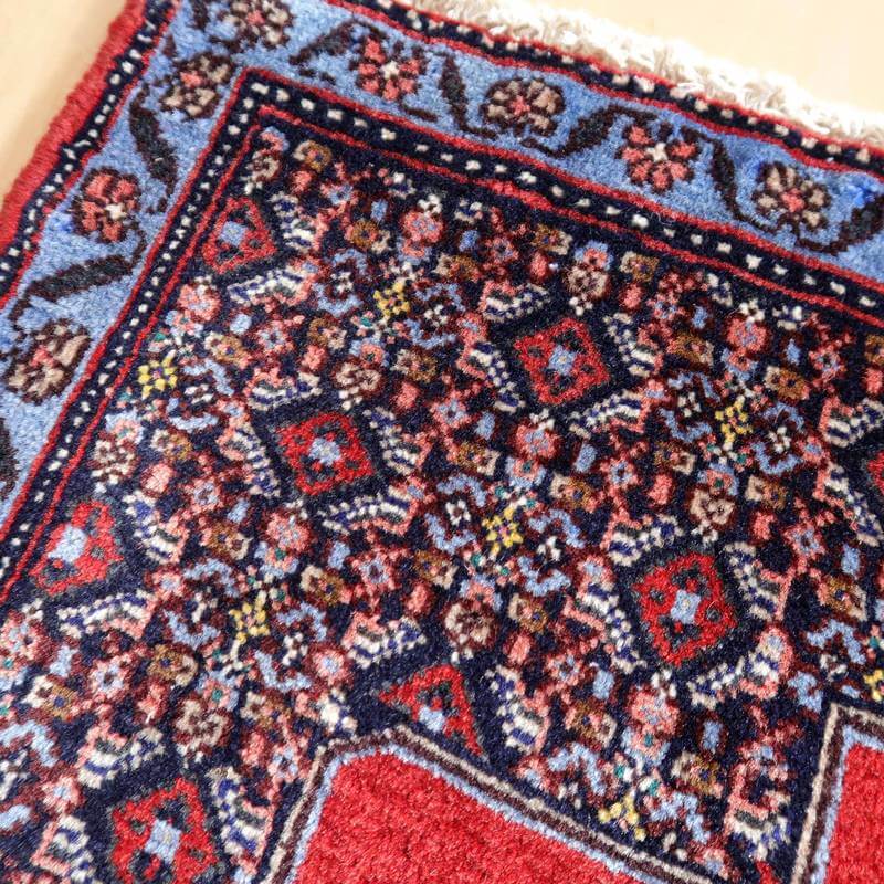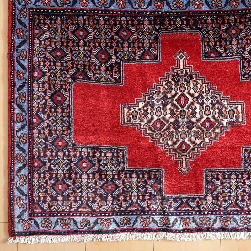 真ん中に大きなひし形模様を配したサナンダジ地方特有の文様デザイン。茶交じりの赤、紺、ブルーを基調とした落ち着いた雰囲気、細い糸を使用した織りの詰まった作りで、しなやかな生地感の滑らかな手触りです。