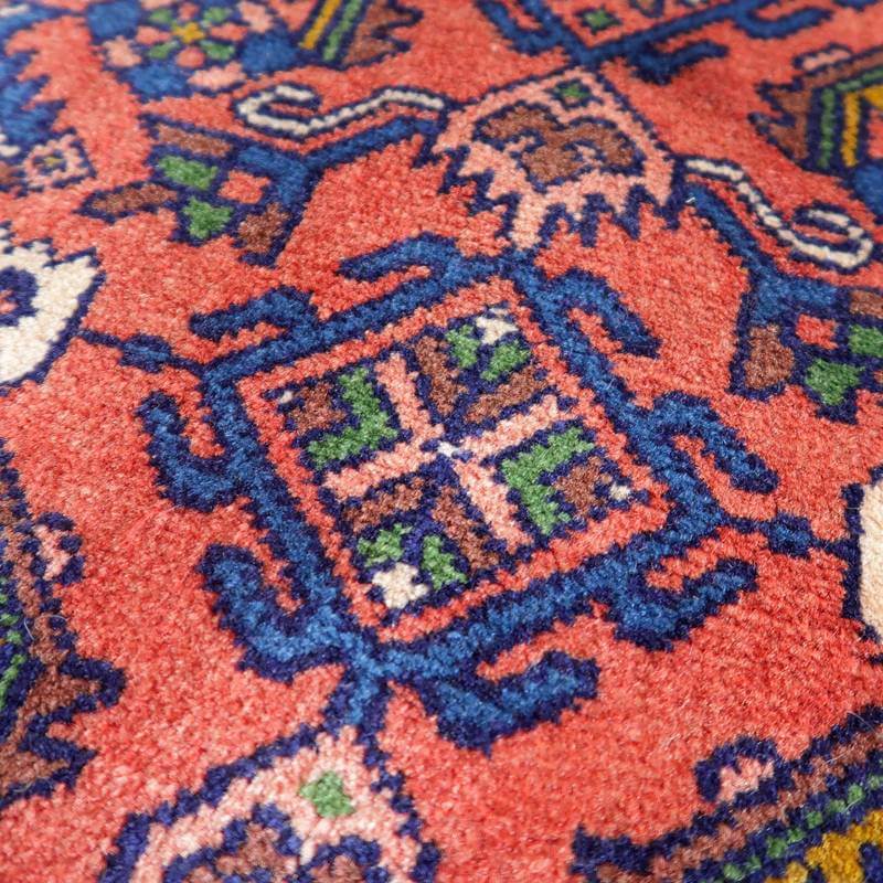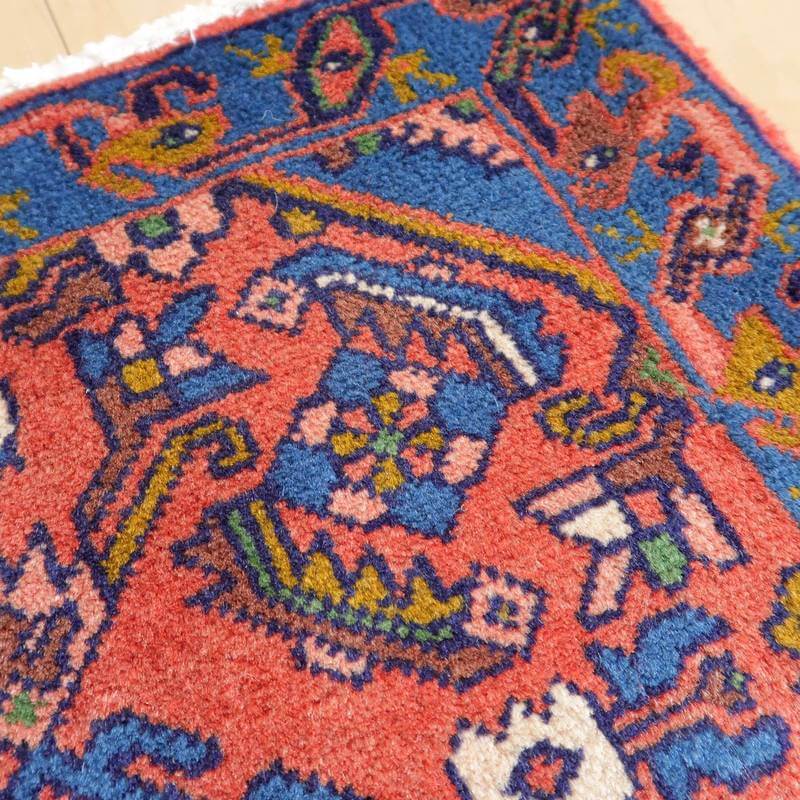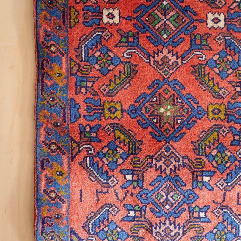 イラン南西部アフワーズに近い小さな村で家庭織りとして織られた普段使いの絨毯です。魔よけの意味を持つカギ足のついたひし形の文様がシンメトリーに並んだバランスの良いデザインです。真ん中にペルシャ語で1370年と入っていて何の記念の作なのかと想像がふくらみます。褪せ感も雰囲気が良いので、和洋問わずに合わせやすく、アレンジ次第でモダンにもなる品です。柔らかなウールです。