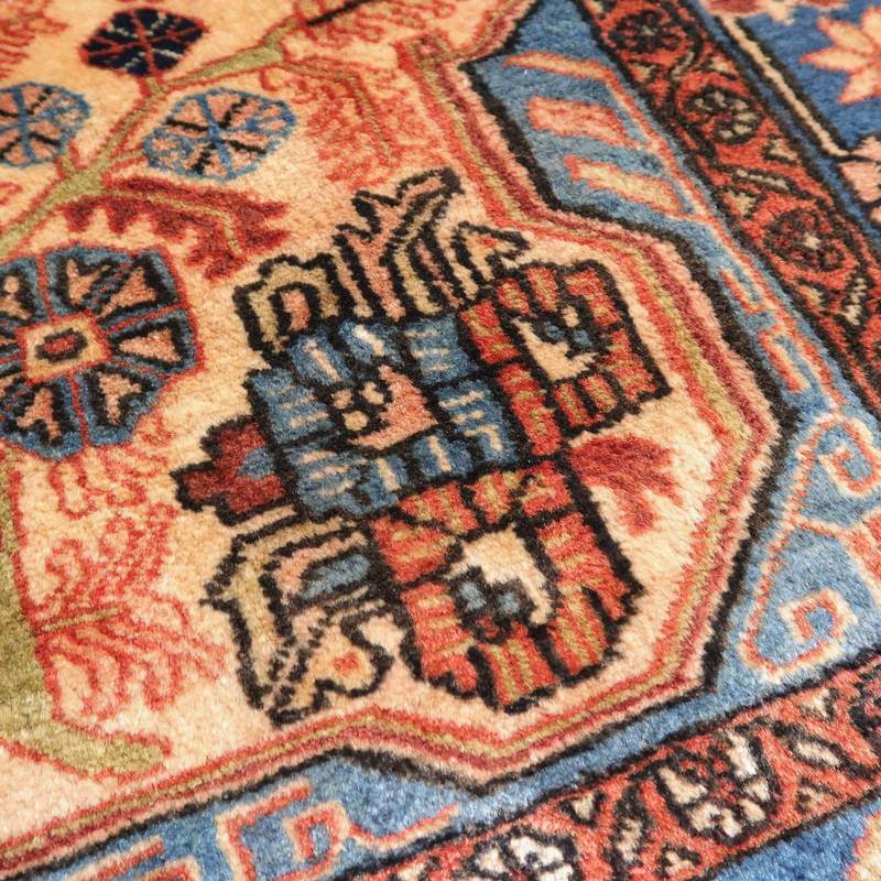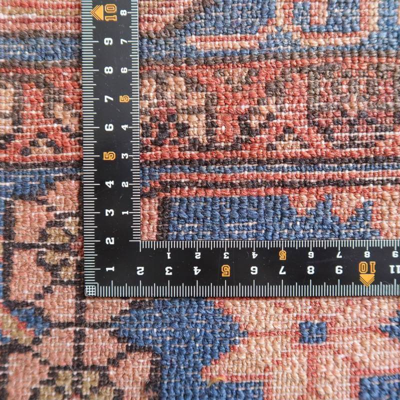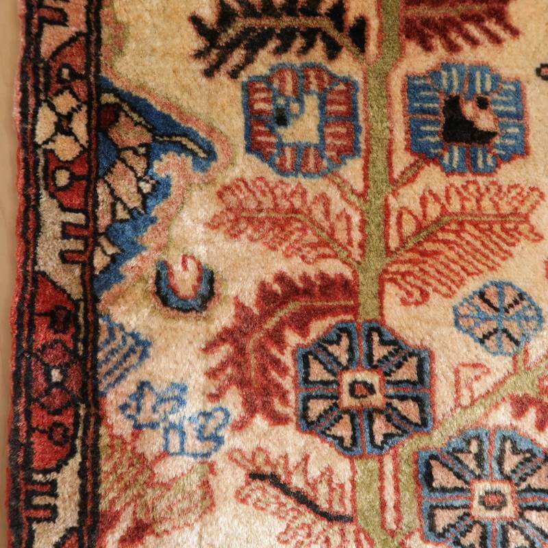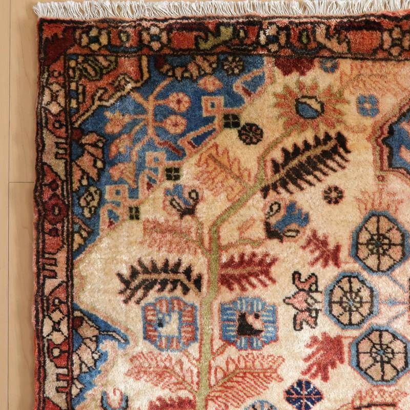 主だったカラーはアイボリー、シアンブルー、赤茶ですが、全体を茶渋色でコーティングしたような大変渋いカラーです。大きなものをカットしたかのような非対称なデザインが大変ユニークで味わいのある生命の木デザインです。ほど良い生地厚と、踏むたびに、しっとり柔らかなウールの感触を味わっていただける十分な素材品質で、日々の普段使いで快適さを実感いただける絨毯です。上端85センチ、下端76センチと横幅に手織りならではの差がございます。
