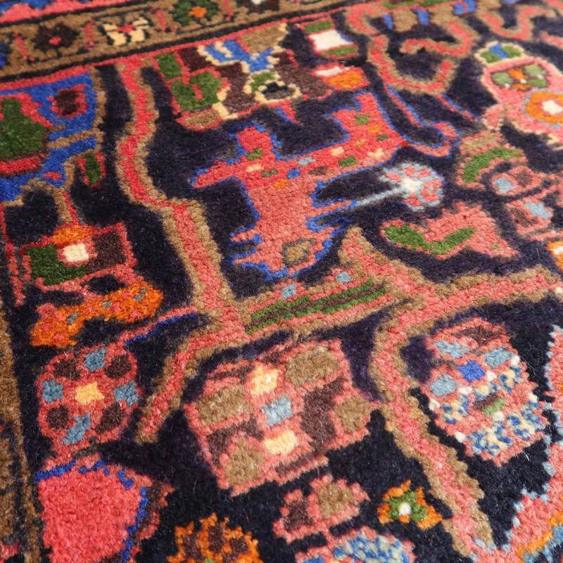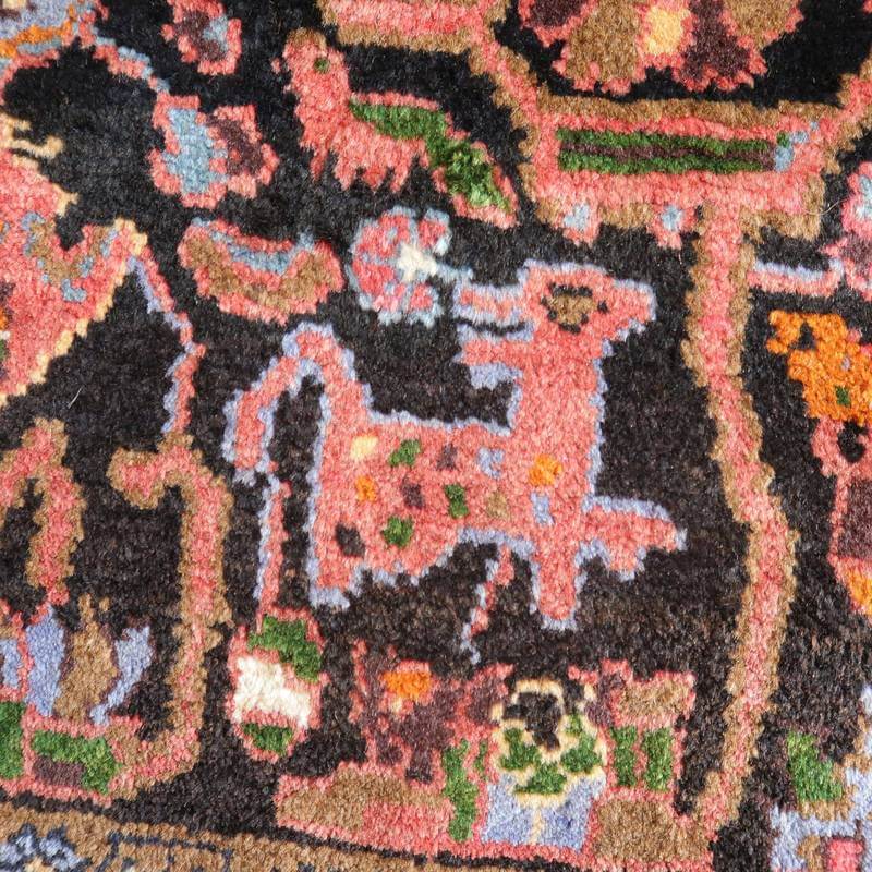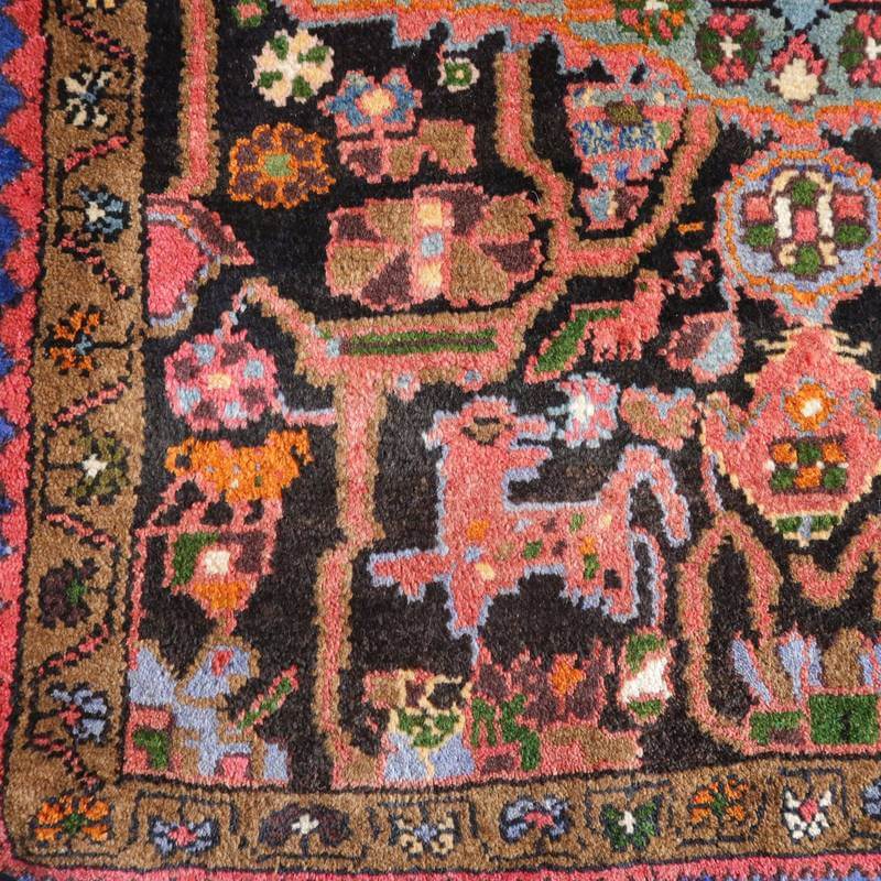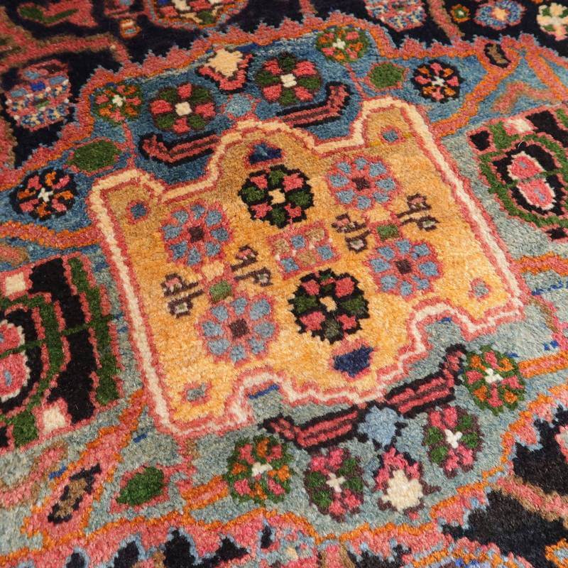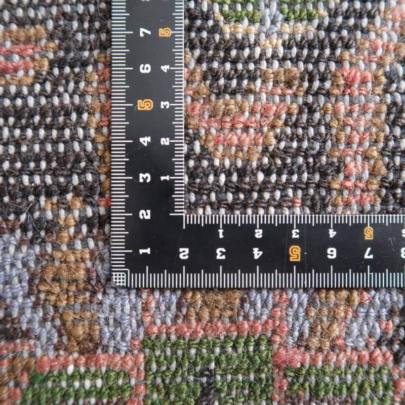シックな黒色を背景に、動物と草花のモチーフと真ん中のゆるっと曲がったメダリオンがユニーク。年月を経た風合いが重なって、味わいある存在感をかもし出しています。ふっくら厚手でツヤのある生地です。踏むたびに、柔らかくしっとり気持ちの良いウールの感触を味わえる十分な素材品質で、日々の普段使いで快適さを実感いただける絨毯です。