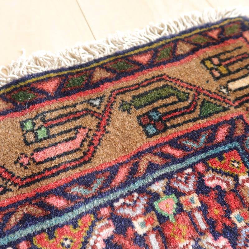 茶と紺を基調とした落ち着いた配色。細かな文様が規則的に並んだ伝統的なデザイン、新しい物には無いレトロモダンな味わいがあります。コンディションは比較的良好、踏むたびに、しっとり気持ちの良いウールの感触を味わえる十分な素材品質、日々の普段使いで快適さを実感いただける絨毯です。