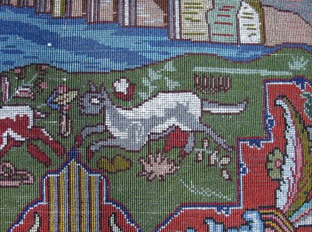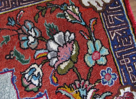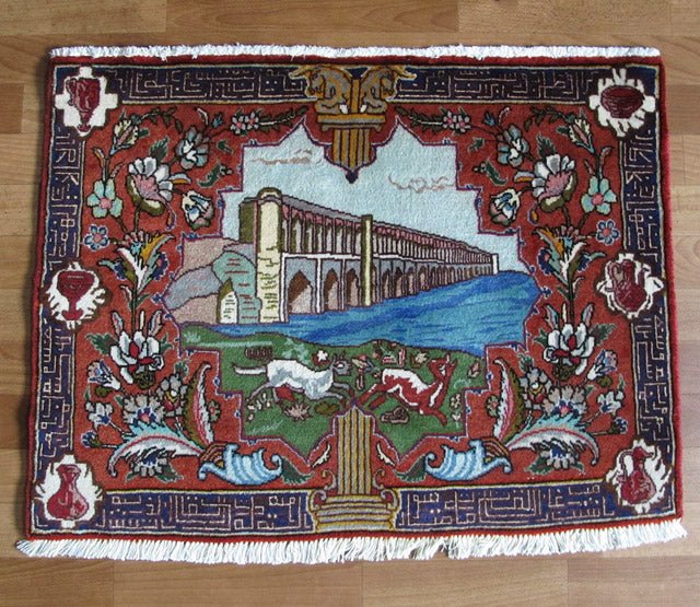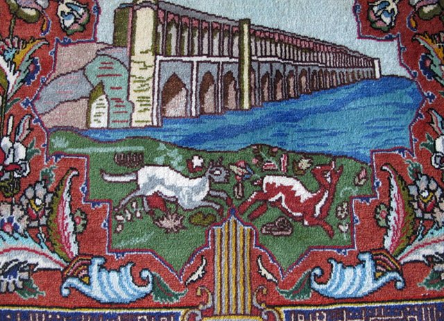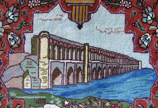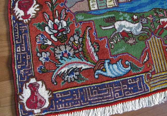 レンガ色に濃いめの紫の枠がメインカラー。ペルシャ絨毯の伝統柄が散りばめられた窓枠からイランの風景が覗くバランスの美しいピクチャーデザイン。有名産地タブリーズらしい緻密な作りと繊細なデザインのじゅうたんです。少し古い時代に作られた品で、額入りで飾ったりしていたものなのですが、新しい絨毯には無いレトロモダンな味わいが感じられます。※見た目に少し台形にも感じられるので正面からの画像でご確認ください。