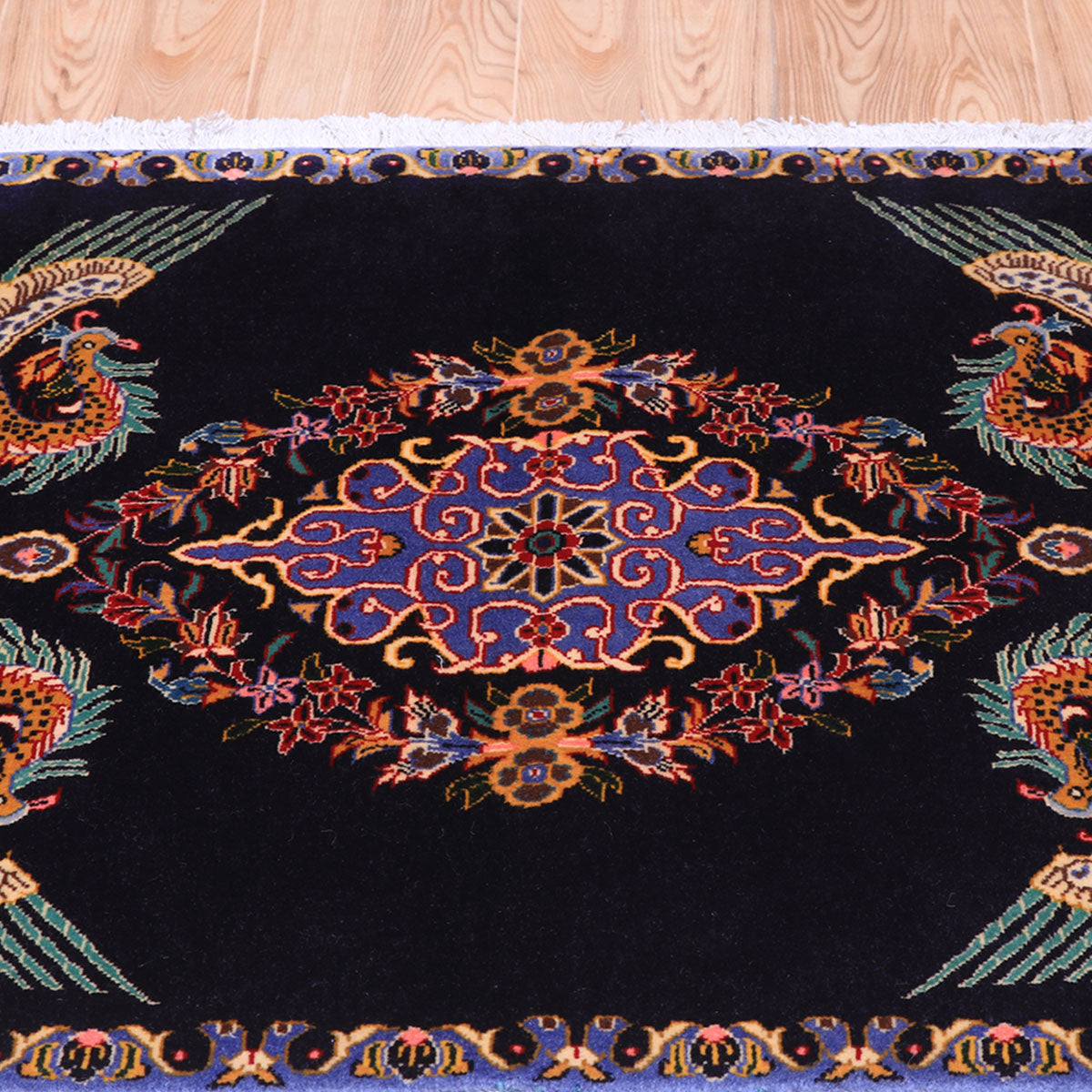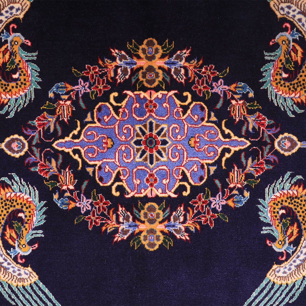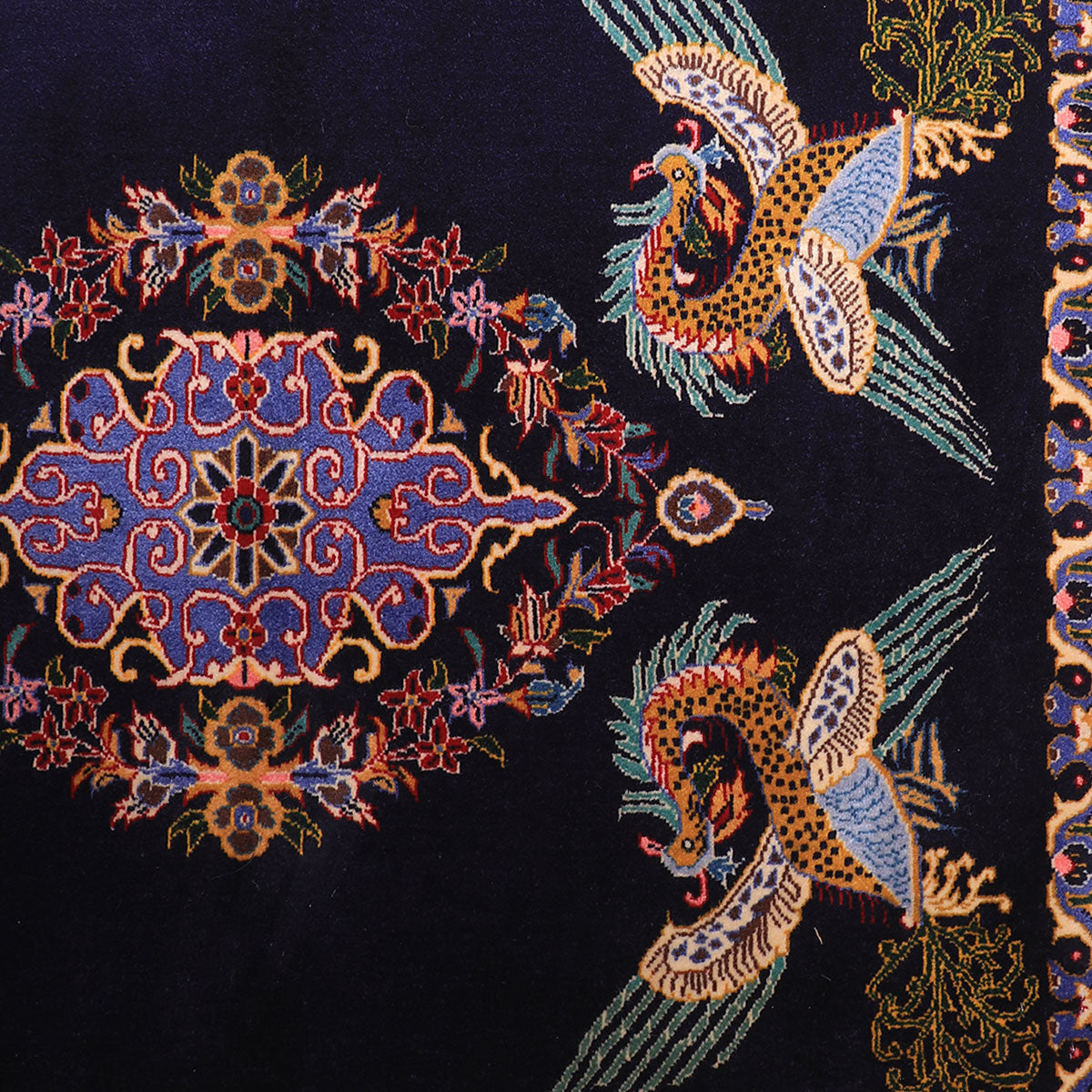 ・カーシャーン伝統のメダリオンを囲むように、四隅には羽ばたく鳥が大きく描かれています。