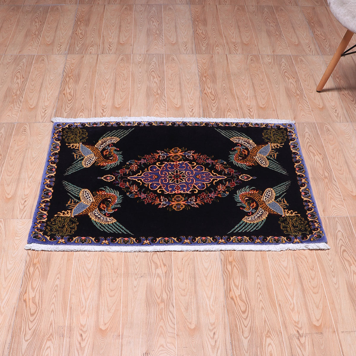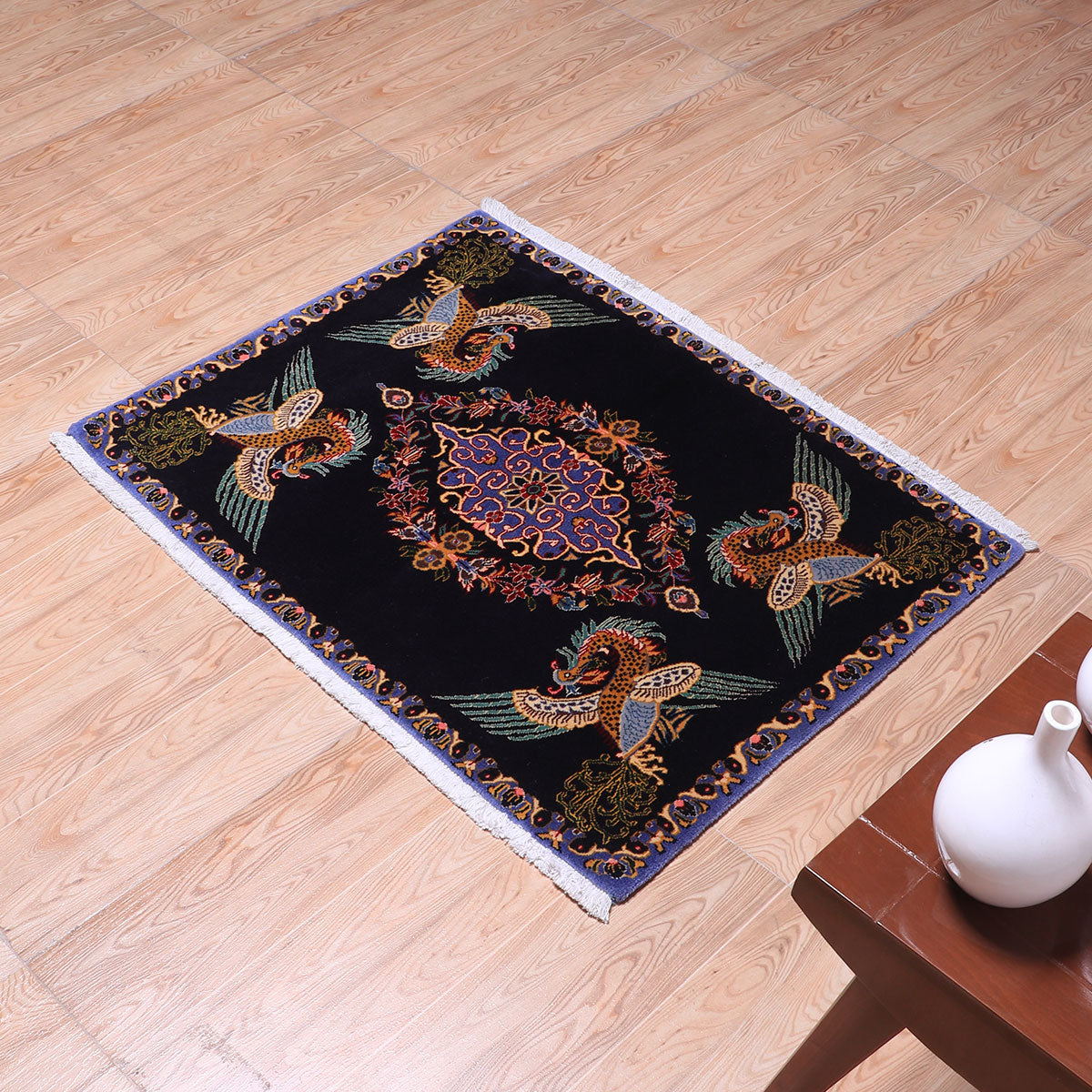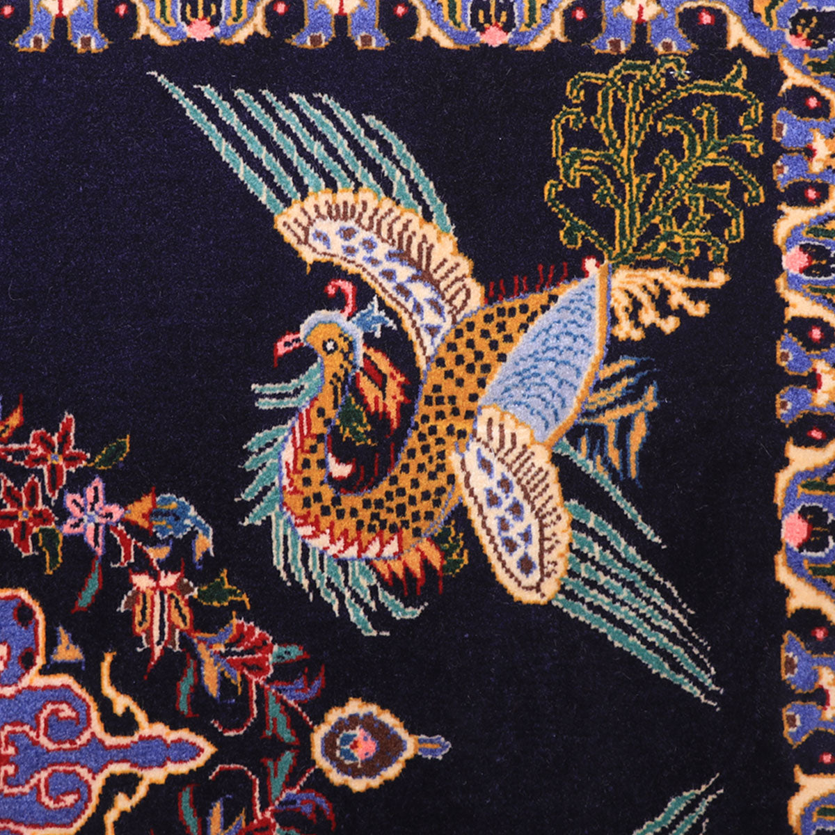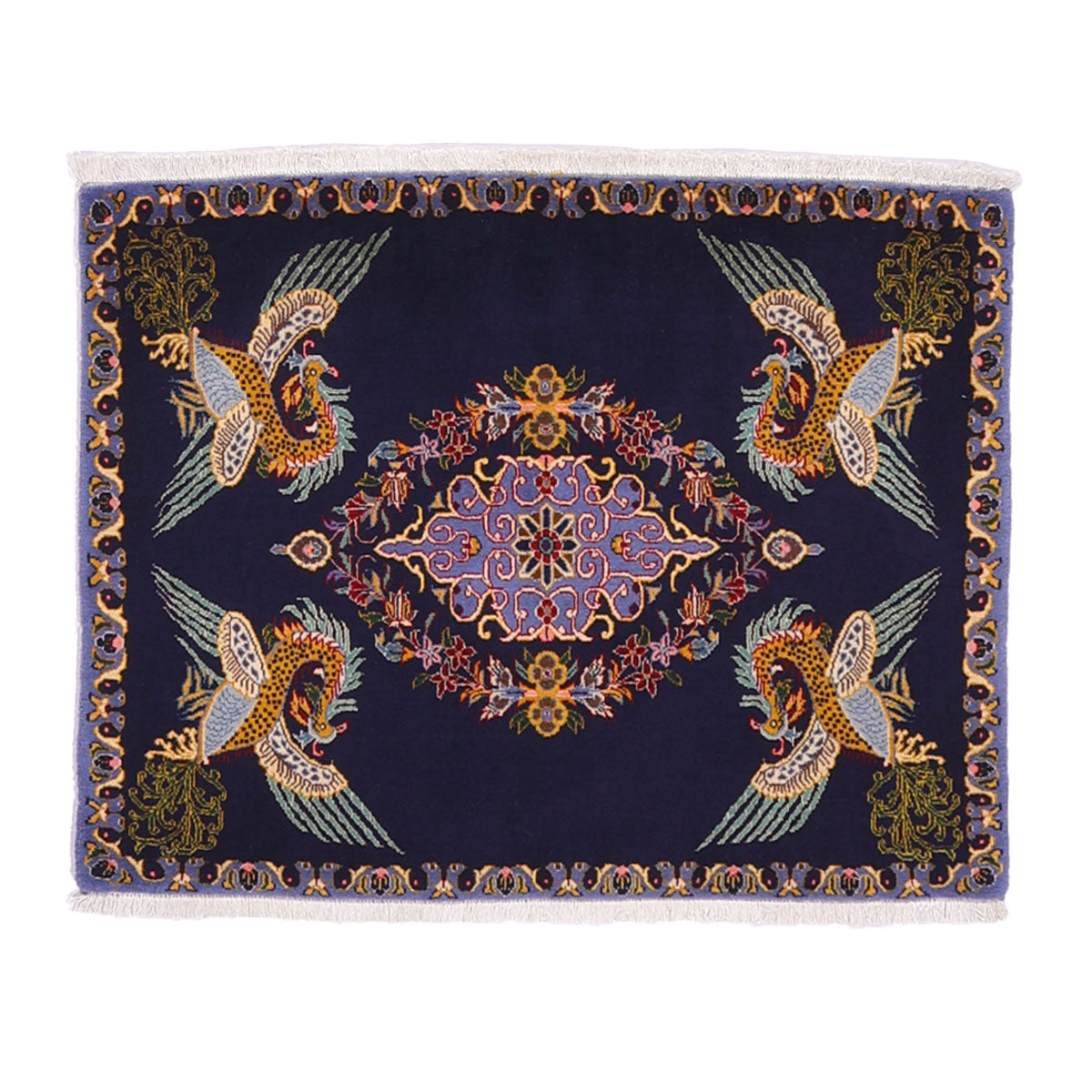 ・カーシャーン伝統のメダリオンを囲むように、四隅には羽ばたく鳥が大きく描かれています。