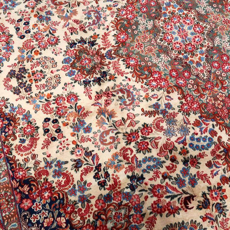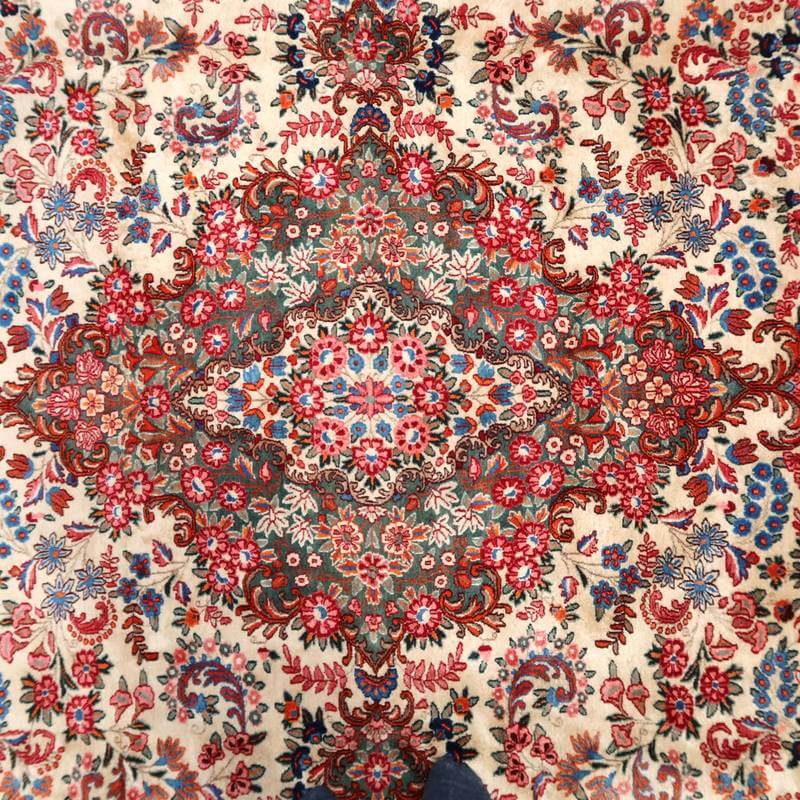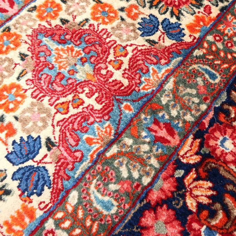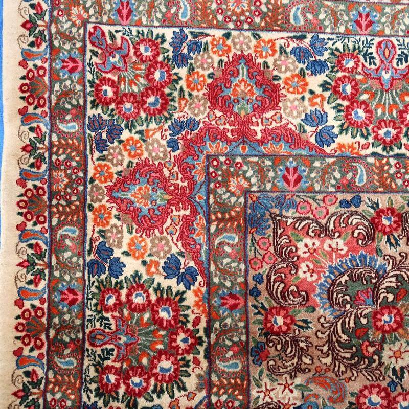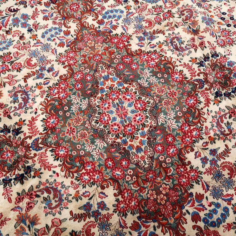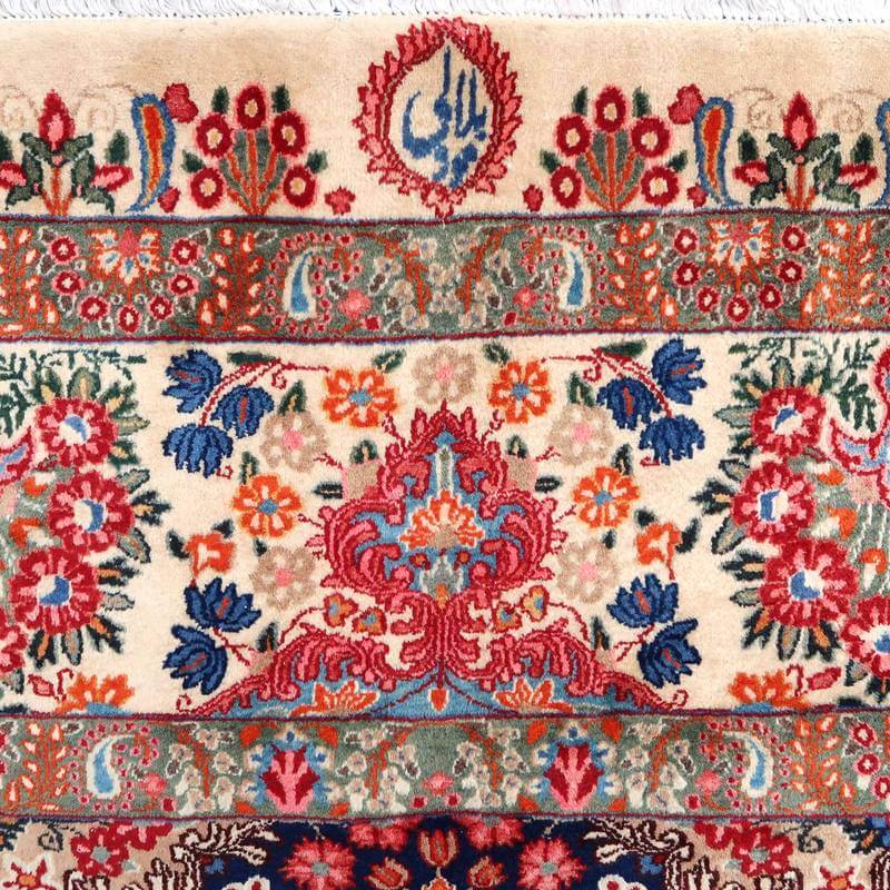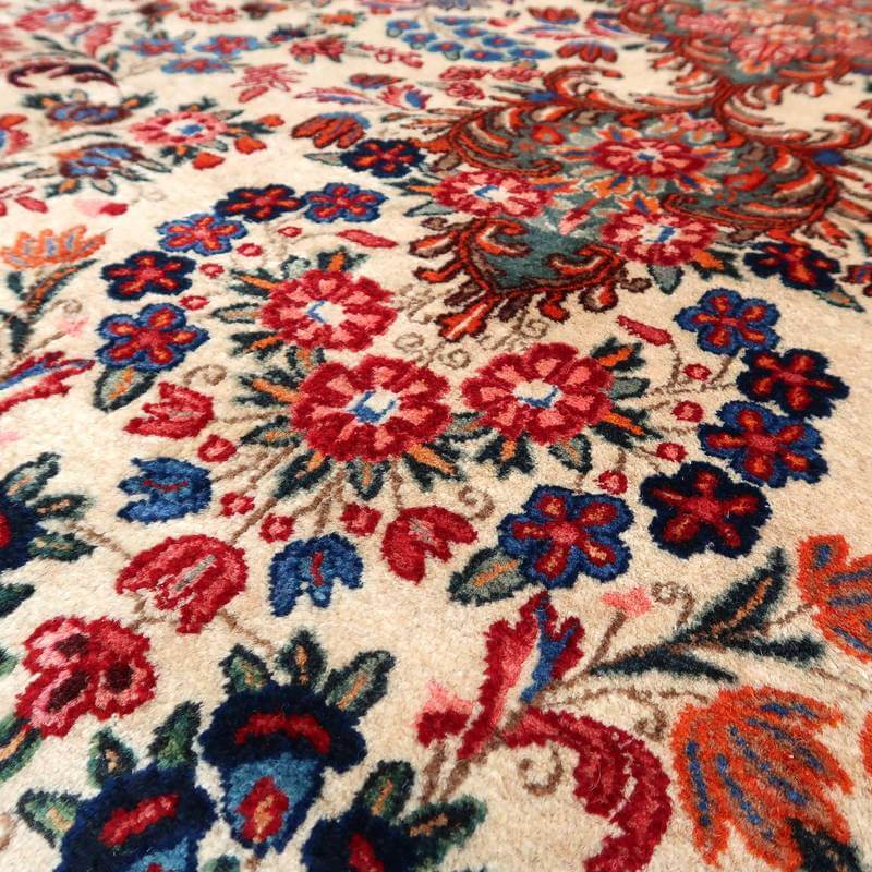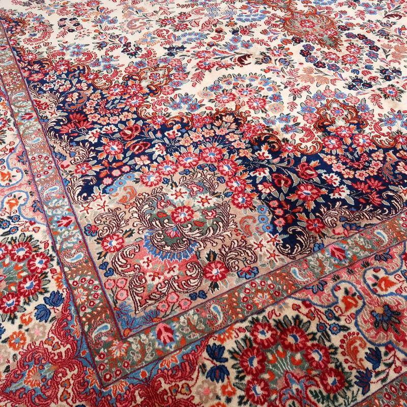 ムードは、マシャド、カシュマールなどと並ぶイラン東部の主要な絨毯産地の中で高品質の絨毯を産出する産地です。落ち着きと程よい華やかさ、それにレトロなモダンさが調和した美しい花柄のメダリオンコーナーデザイン。アイボリーを基調にしたやわらかな印象です。踏むと、やんわり沈み込む感じがある厚みのしっかりある生地、使用されているウールは柔らかくてコシのある良質なイラン産です。バラリのサイン入り。 およそ4×3mのかなりの大判サイズは、近年織られる数量が無く、サイズ面からも貴重でレアな品です。かなり大きなサイズなので見た目には感じられませんが、右端が389センチ・真ん中が392センチ・左端が394センチ、上端が290センチ・真ん中が293センチ・下端が297センチと長さと幅に手織りならではの違いがございます。