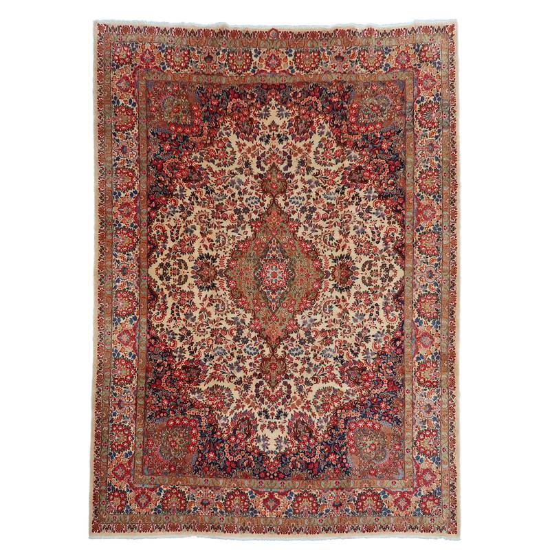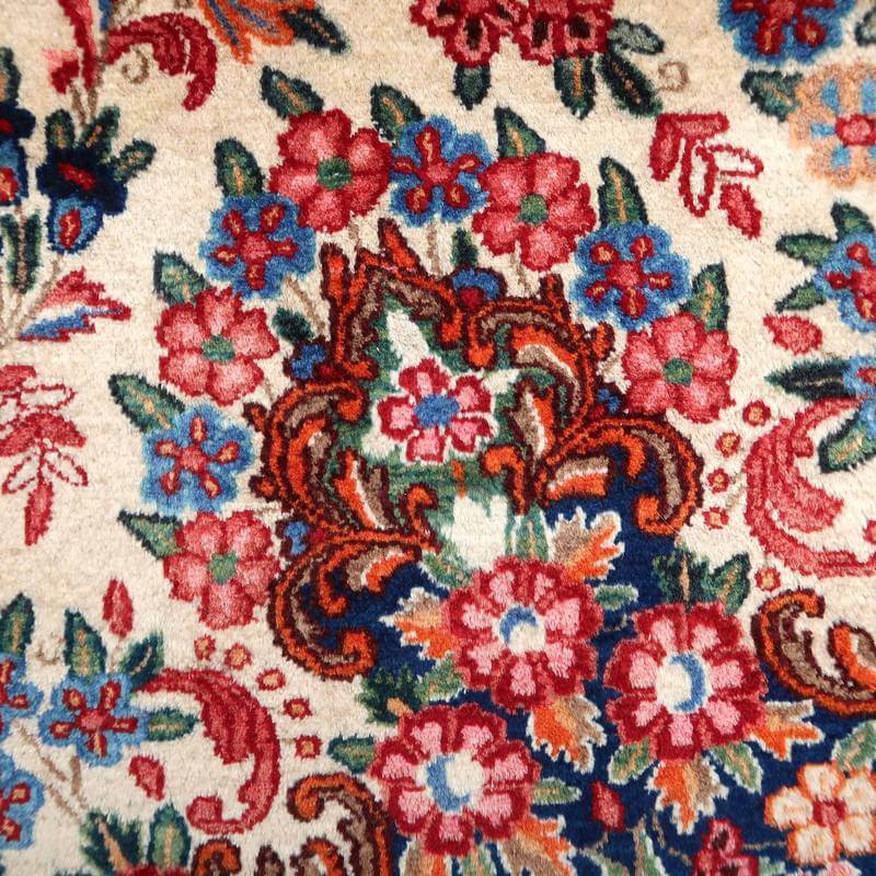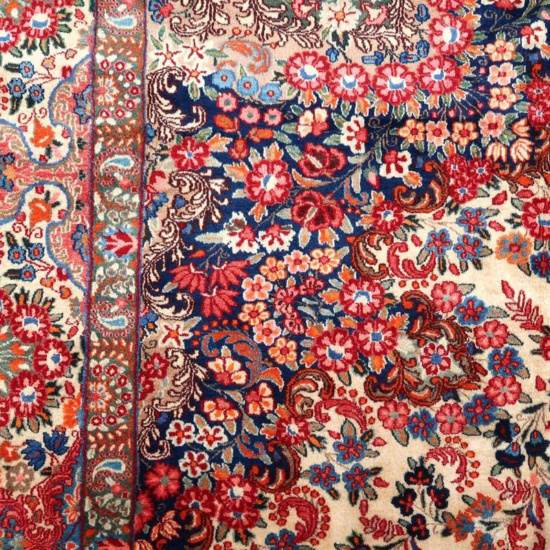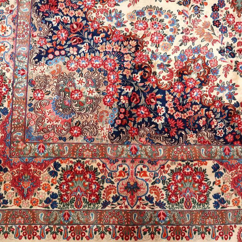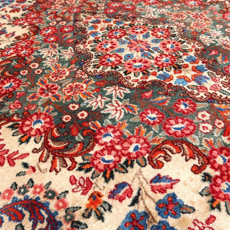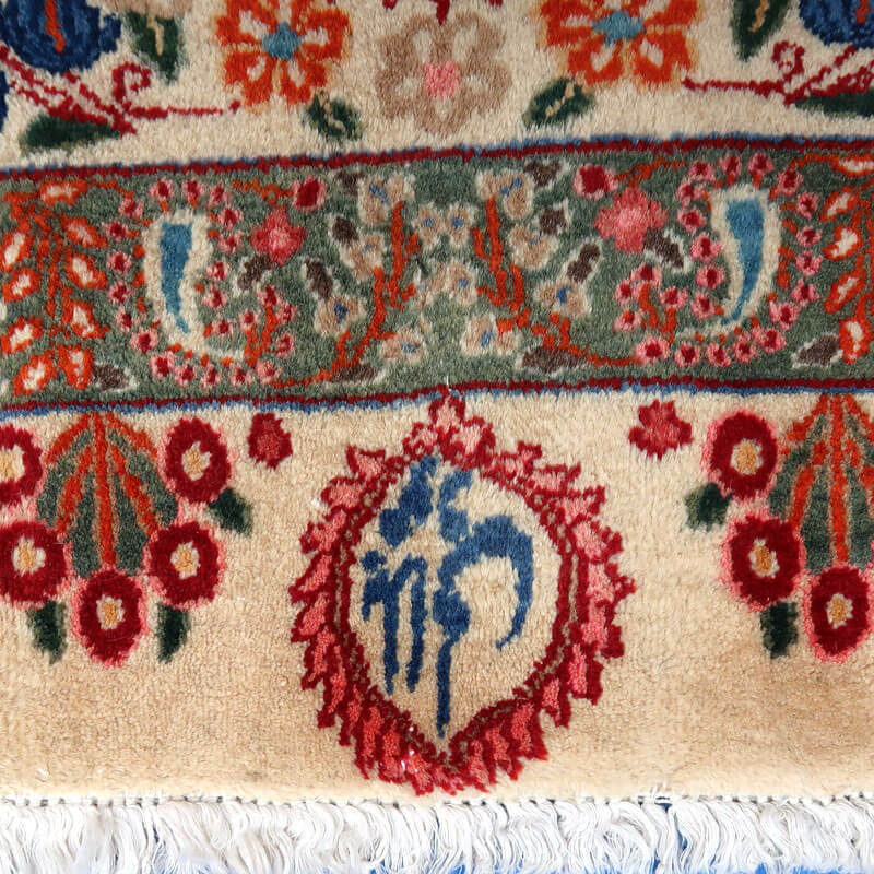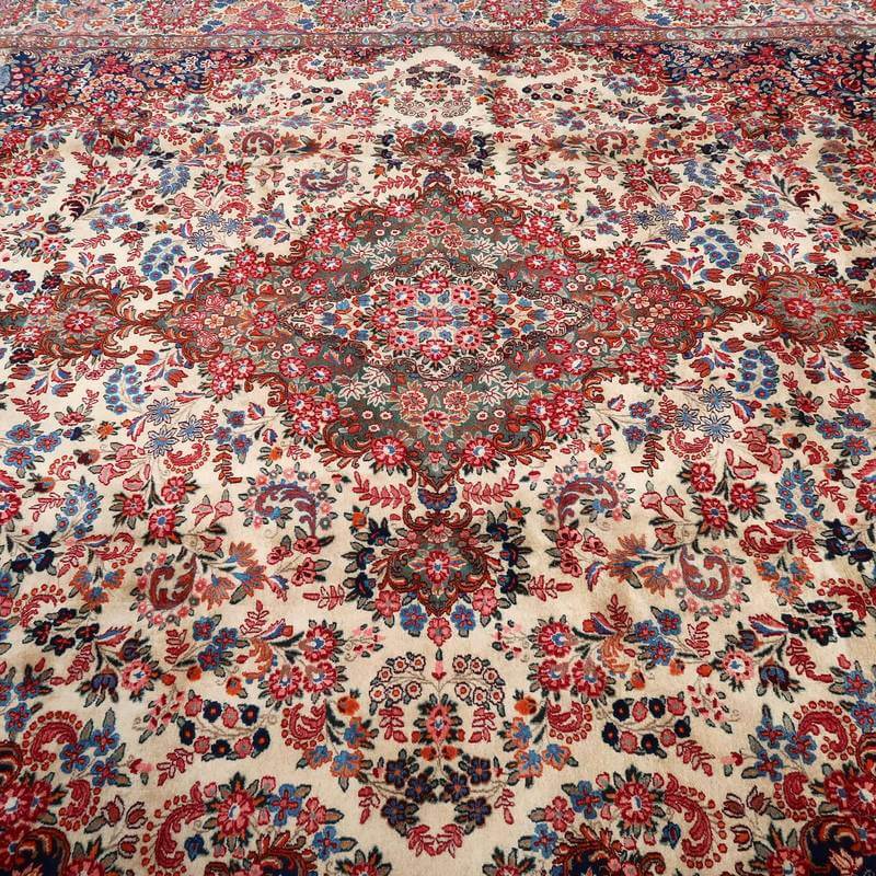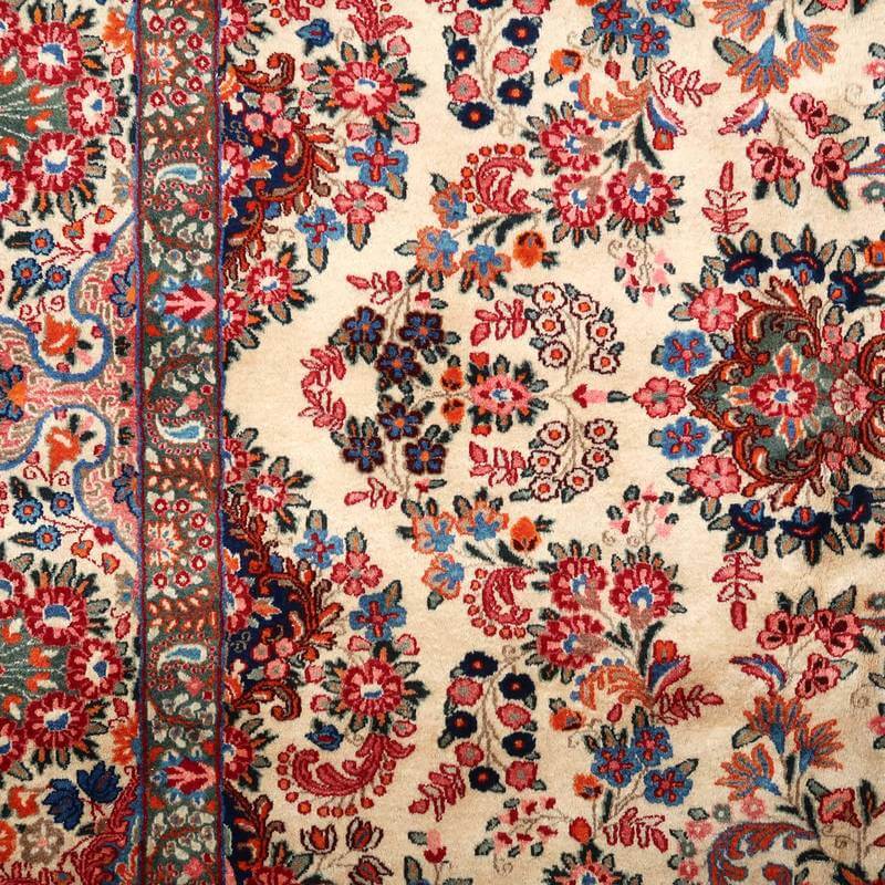 ムードは、マシャド、カシュマールなどと並ぶイラン東部の主要な絨毯産地の中で高品質の絨毯を産出する産地です。落ち着きと程よい華やかさ、それにレトロなモダンさが調和した美しい花柄のメダリオンコーナーデザイン。アイボリーを基調にしたやわらかな印象です。踏むと、やんわり沈み込む感じがある厚みのしっかりある生地、使用されているウールは柔らかくてコシのある良質なイラン産です。バラリのサイン入り。 およそ4×3mのかなりの大判サイズは、近年織られる数量が無く、サイズ面からも貴重でレアな品です。かなり大きなサイズなので見た目には感じられませんが、右端が389センチ・真ん中が392センチ・左端が394センチ、上端が290センチ・真ん中が293センチ・下端が297センチと長さと幅に手織りならではの違いがございます。