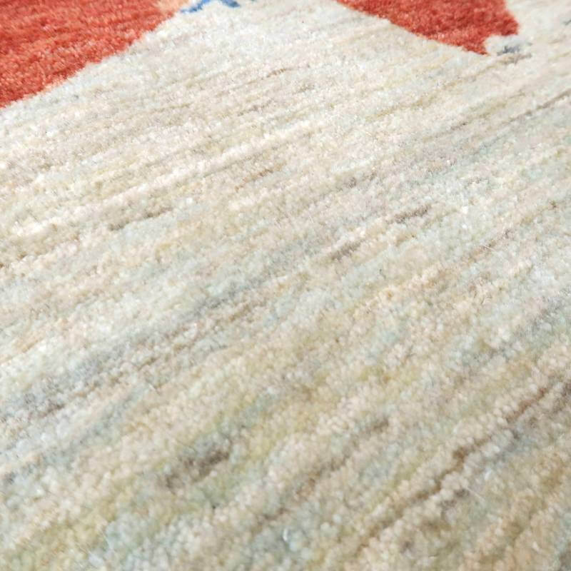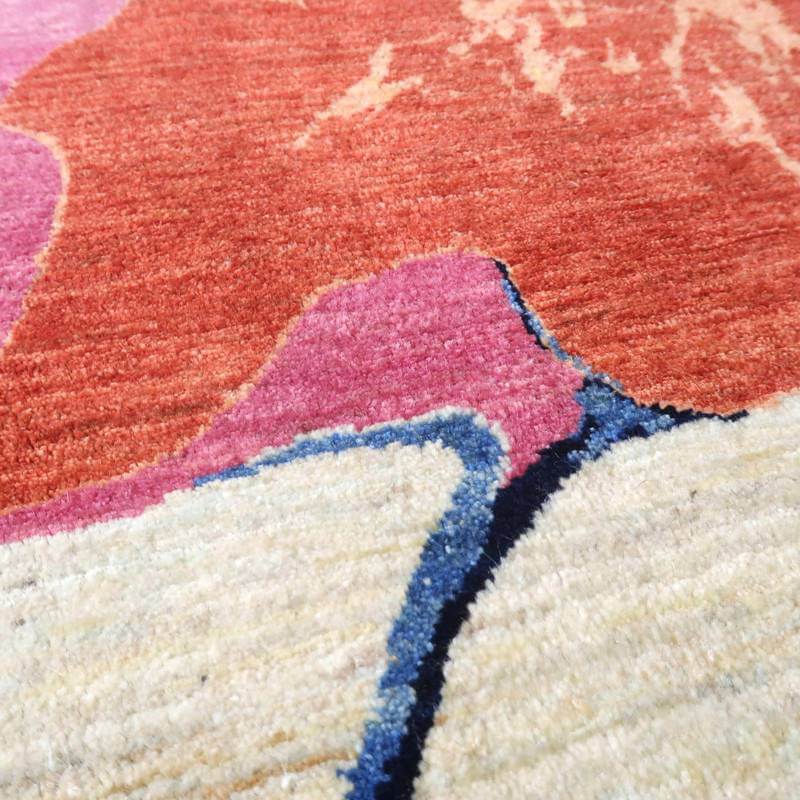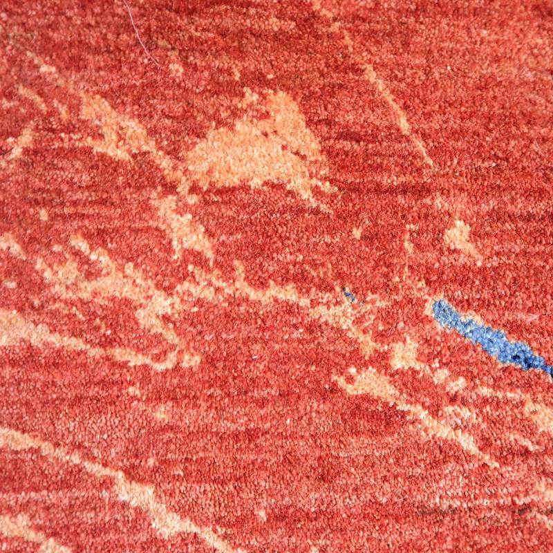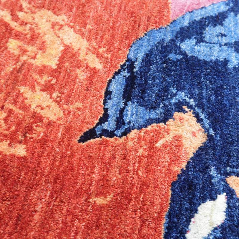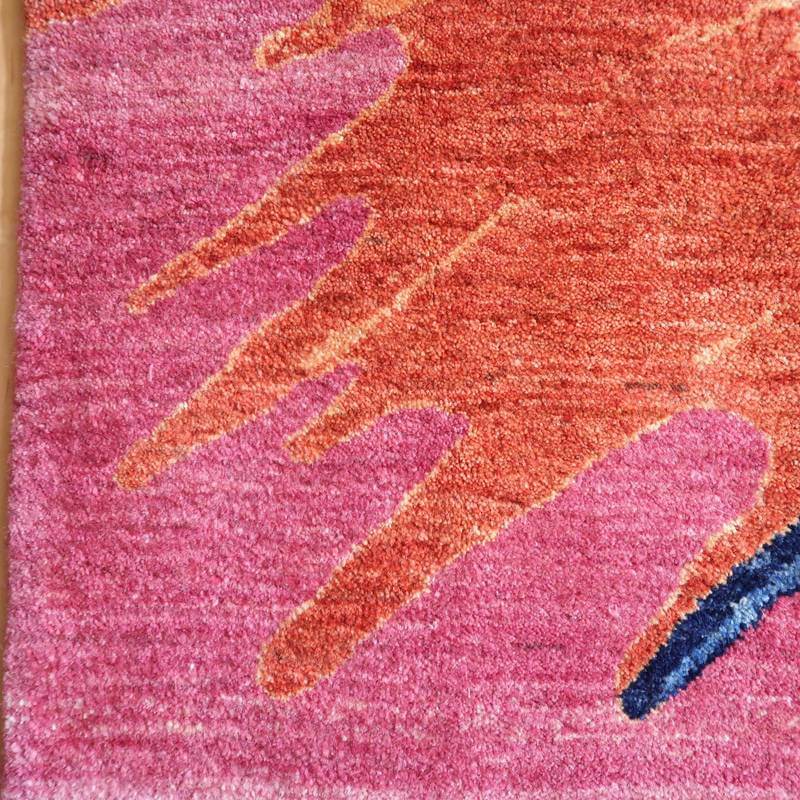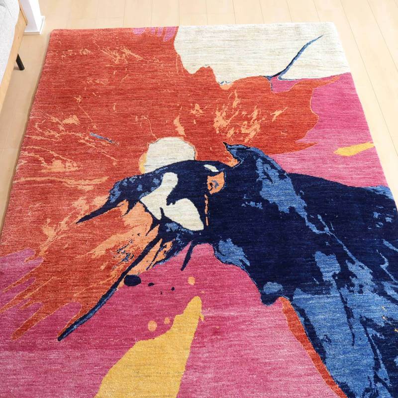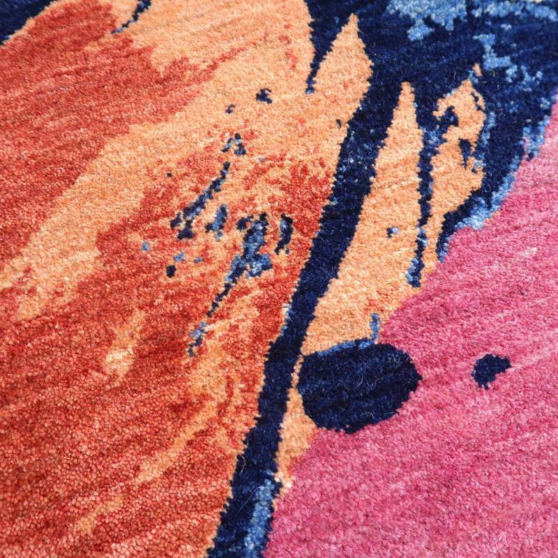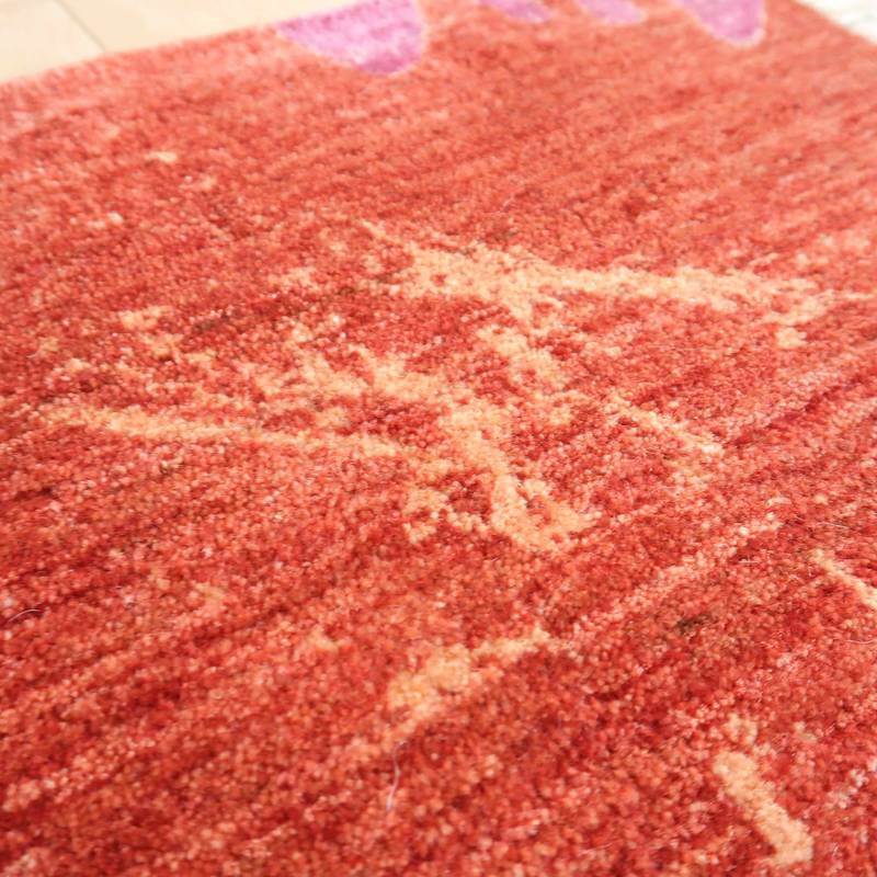 夕焼けのような赤、ブドウ色、冴えたネイビーなどを使用して、ほとばしるパッションを大胆に表現した革新的なニューデザインタイプ。従来の伝統にとらわれない若いパワーを感じます。ギャッベの魅力であるアブラシ(色むらのグラデーション)は全体に細やかに入って、色の美しい揺らぎが堪能でき、暖かみのある木のインテリアでもモダンな空間でも馴染むスタイリッシュなアートデザインのギャッベ。冬毛の柔らかな最高部位のウールのみを使用して細かく編んだ最上級のソフトな手触りです。