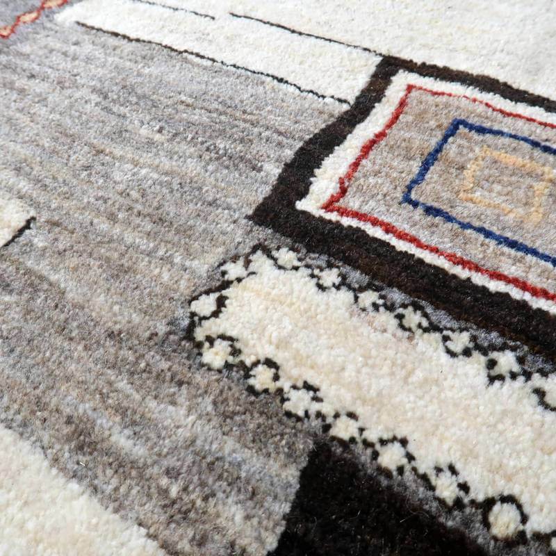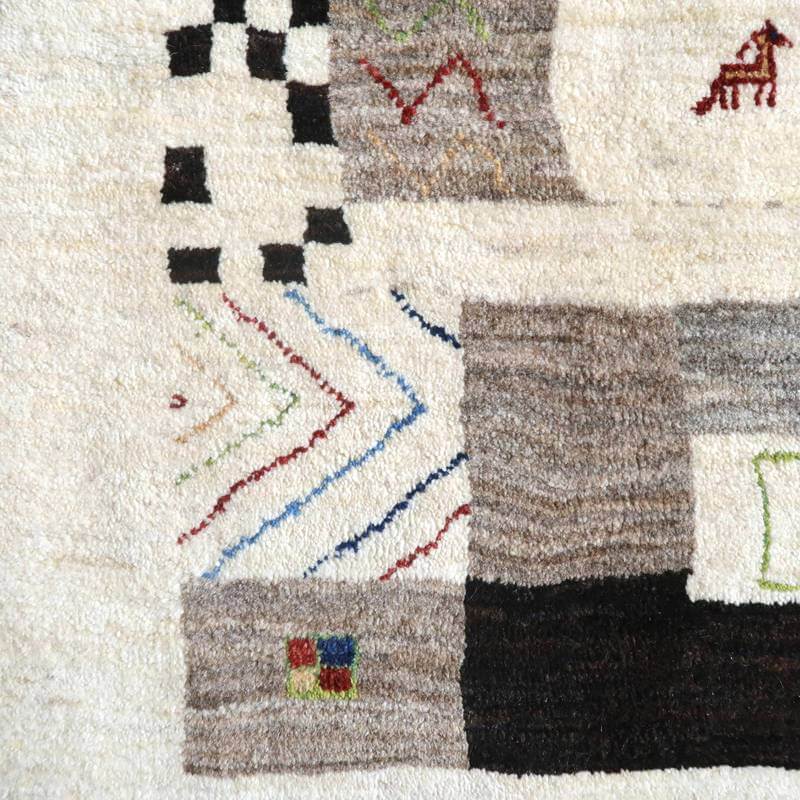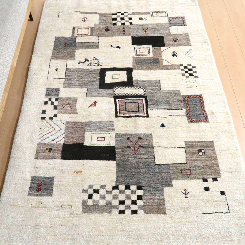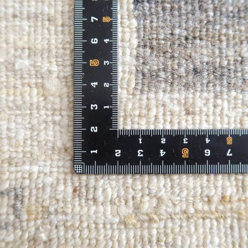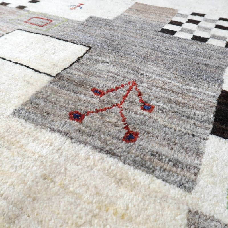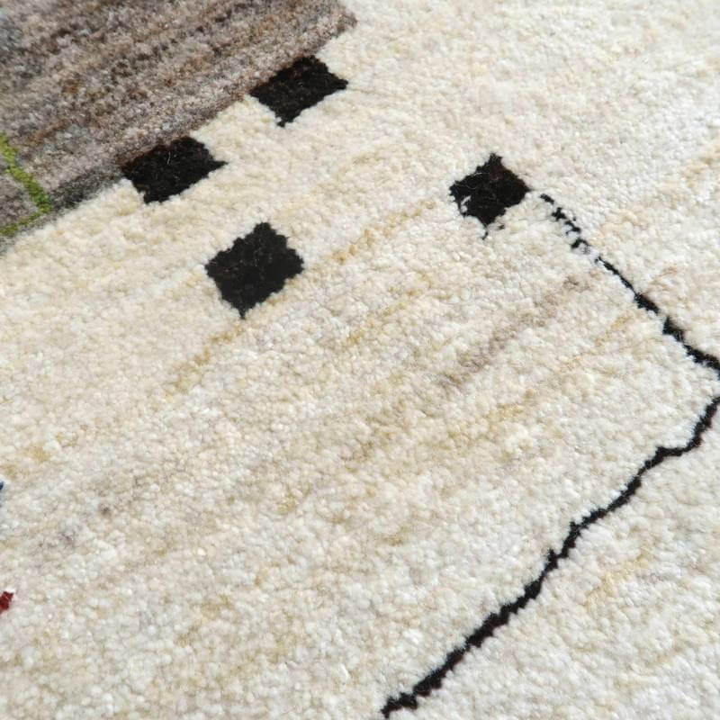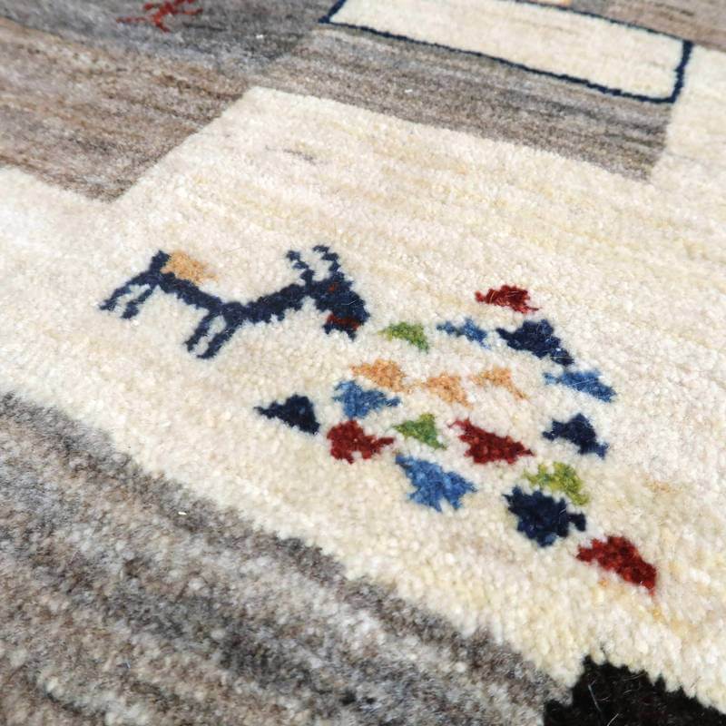 動物や人、草花など小さな模様以外のベースは、刈り取った羊の毛を染めずにそのままの羊の毛色を使用しています。こげ茶やグレー、ベージュのイレギュラーな四角は風景の遠近をイメージして置かれていますが、アブラシ(色むらのグラデーション)の揺らぎがしみじみと味わえます。動物や生命の木が小さいのは細かな織りの証。冬毛の柔らかな最高部位のウールのみを使用して細かく編んだ最上級のソフトな手触り。無染色のタイプの中では白っぽく、明るいカラーになります。
