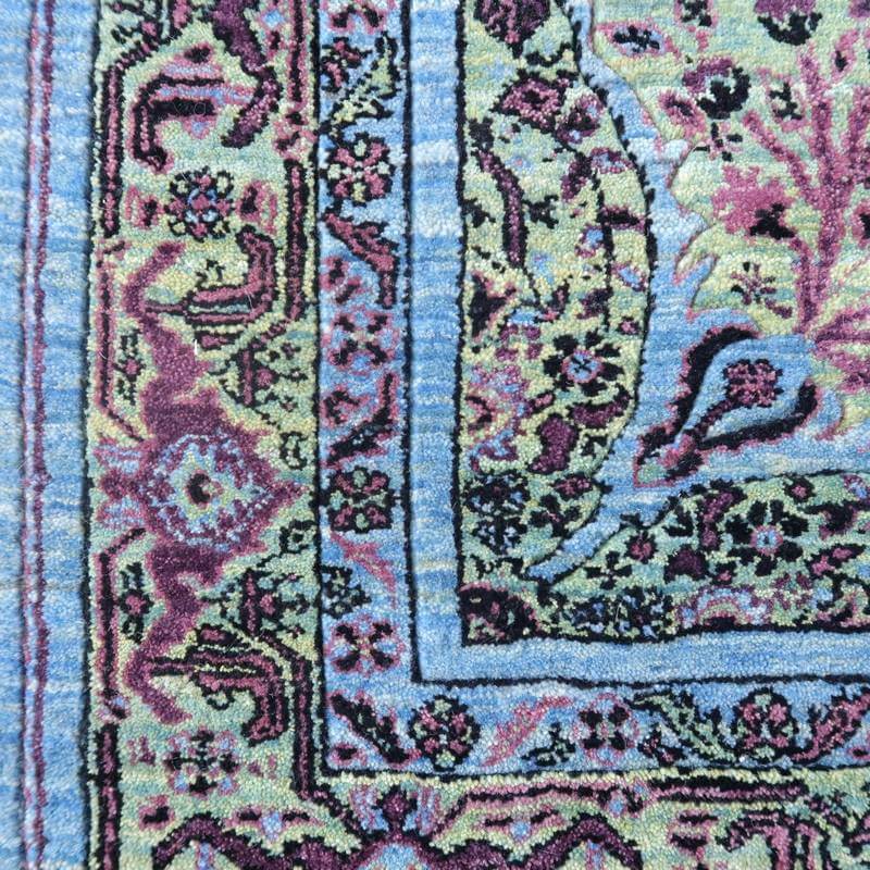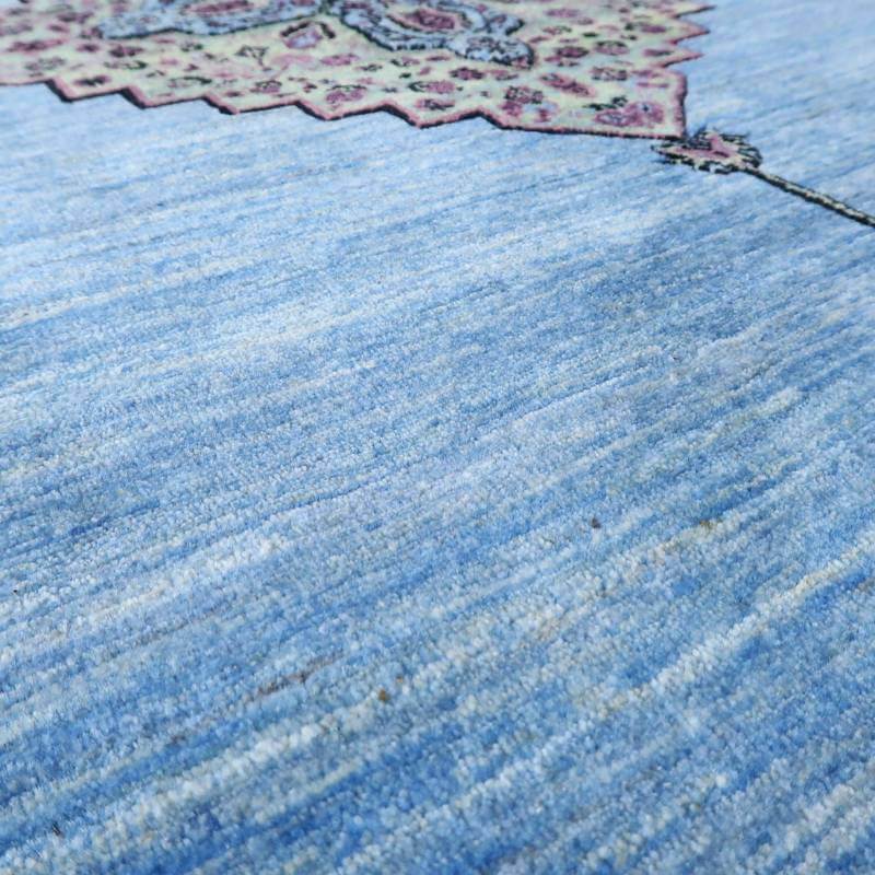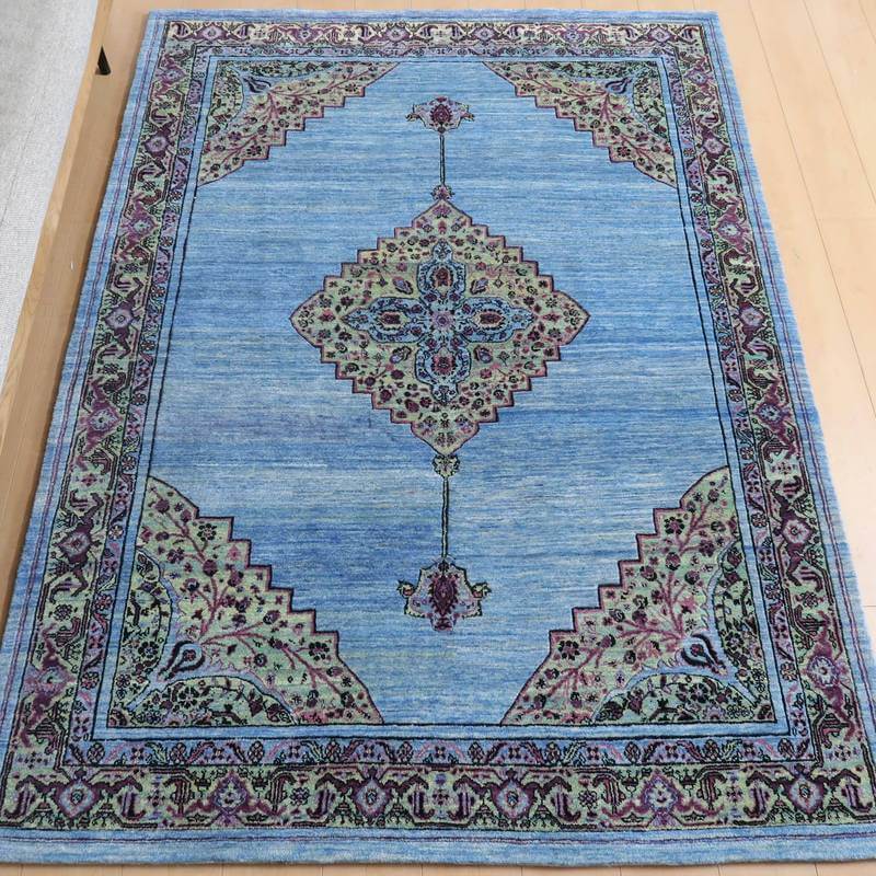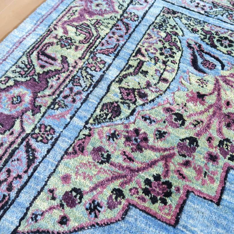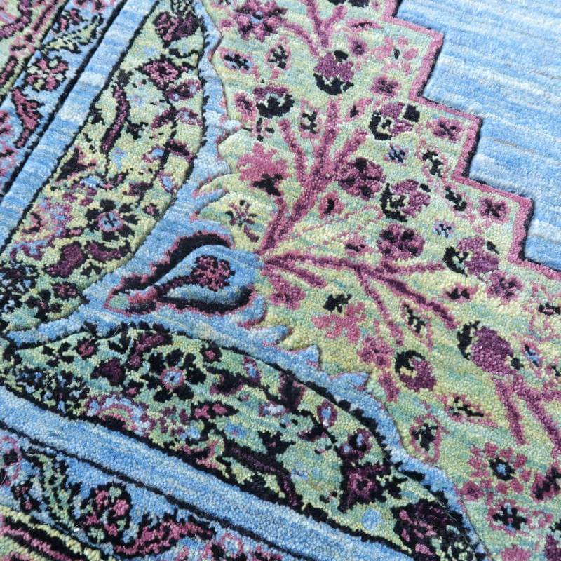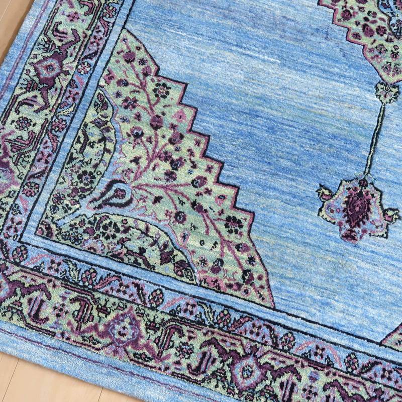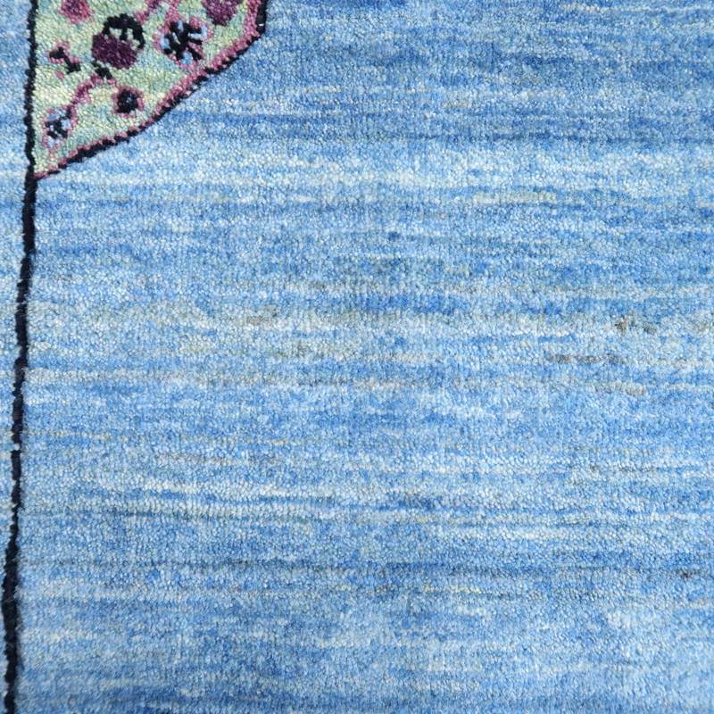 軽やかなライトブルーの爽やかな濃淡に、グリーンがふんわりと混じったような色合いの変化が見られます。紫と黒のモダンな配色のメダリオンコーナー柄は、デザインのアウトラインに手バサミで段差をつけて、凹凸で柄を際立たせるペルシャ絨毯の手法を取り入れています。ギャッベの魅力であるアブラシ(色むらのグラデーション)は全体に細やかに入って、色の美しい揺らぎが堪能でき、暖かみのある木のインテリアでもモダンな空間でも馴染むスタイリッシュなアートデザインのギャッベです。冬毛の柔らかな最高部位のウールのみを使用して細かく編んだ最上級のソフトな手触り。
