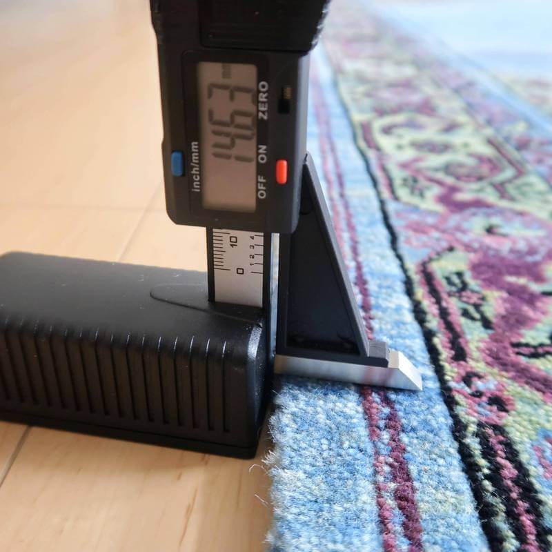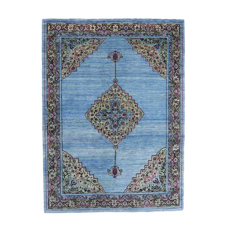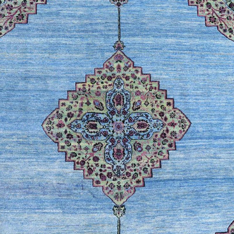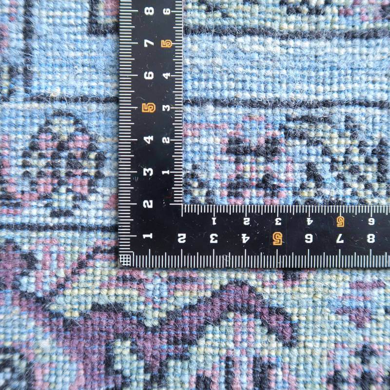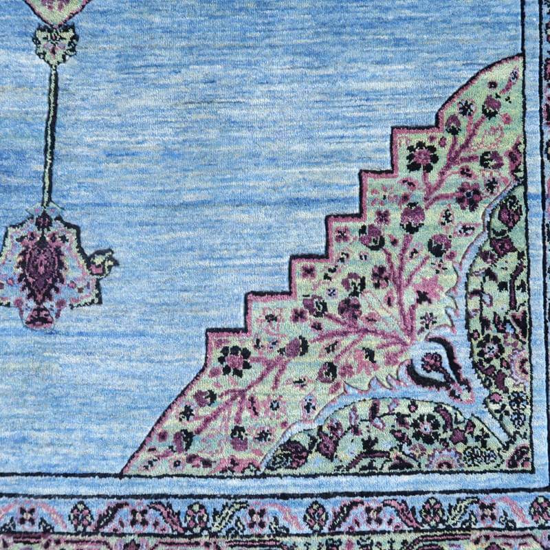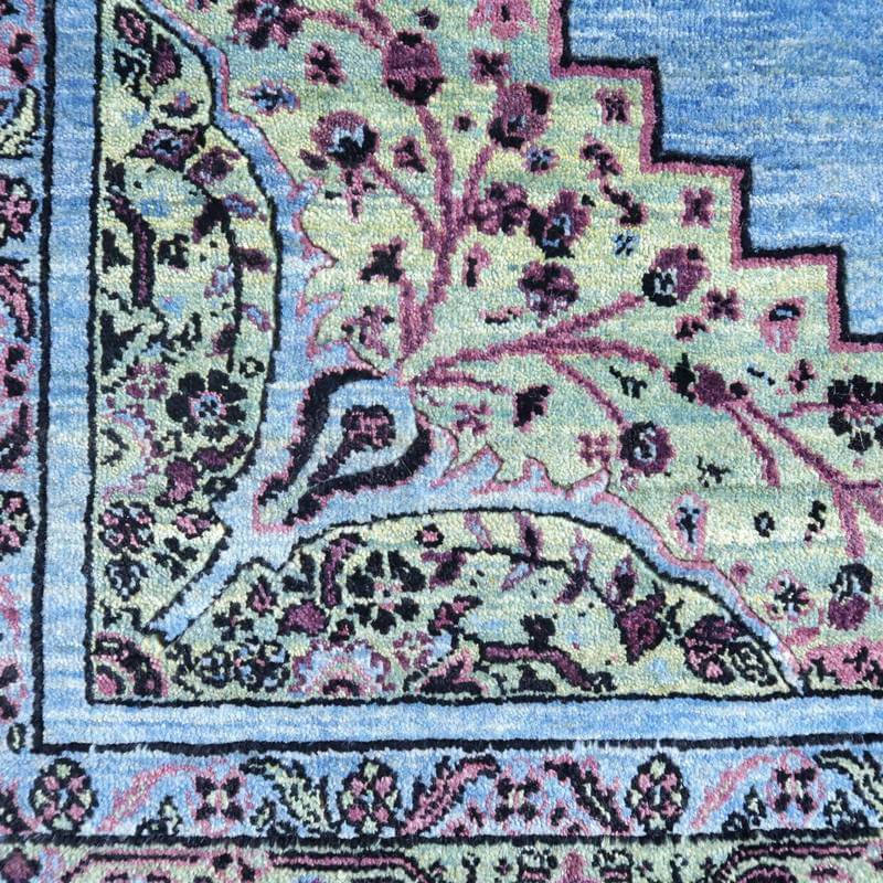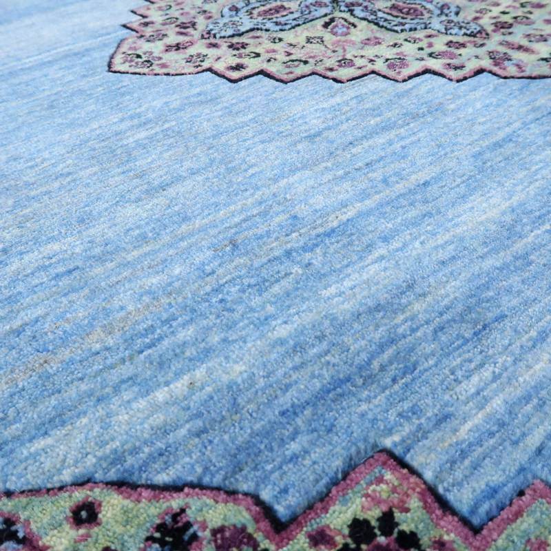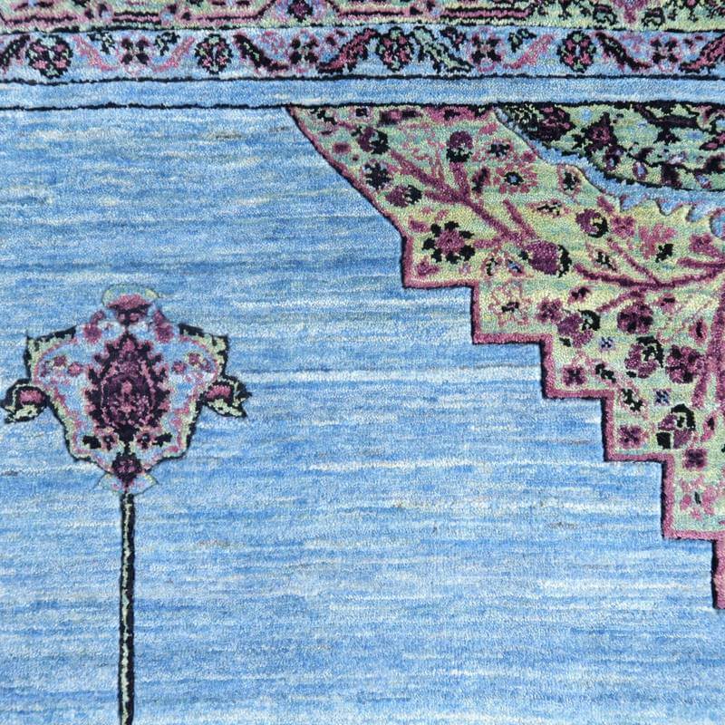 軽やかなライトブルーの爽やかな濃淡に、グリーンがふんわりと混じったような色合いの変化が見られます。紫と黒のモダンな配色のメダリオンコーナー柄は、デザインのアウトラインに手バサミで段差をつけて、凹凸で柄を際立たせるペルシャ絨毯の手法を取り入れています。ギャッベの魅力であるアブラシ(色むらのグラデーション)は全体に細やかに入って、色の美しい揺らぎが堪能でき、暖かみのある木のインテリアでもモダンな空間でも馴染むスタイリッシュなアートデザインのギャッベです。冬毛の柔らかな最高部位のウールのみを使用して細かく編んだ最上級のソフトな手触り。