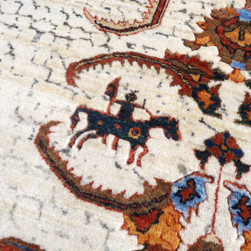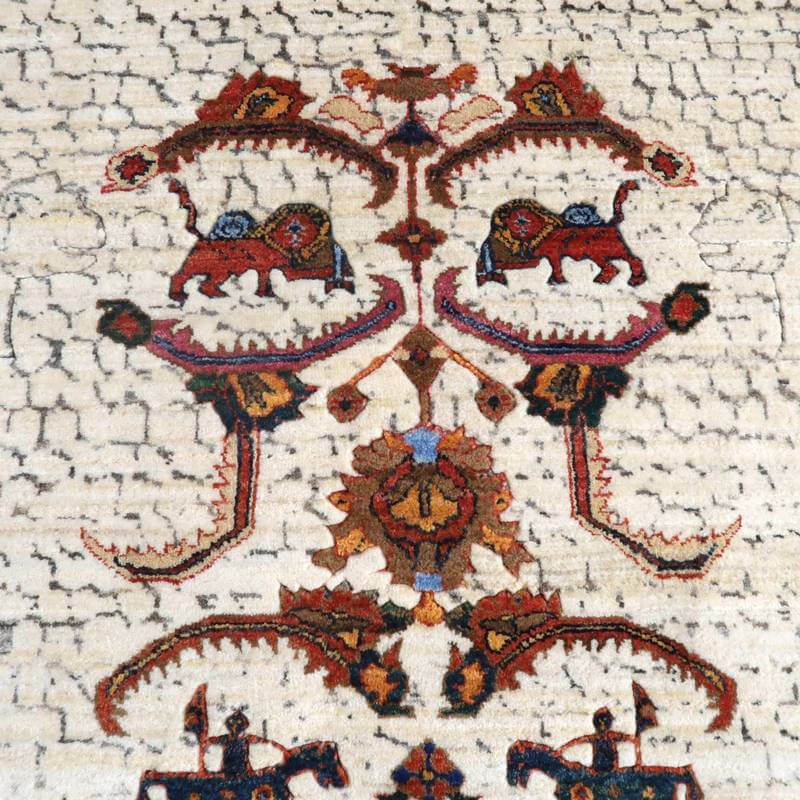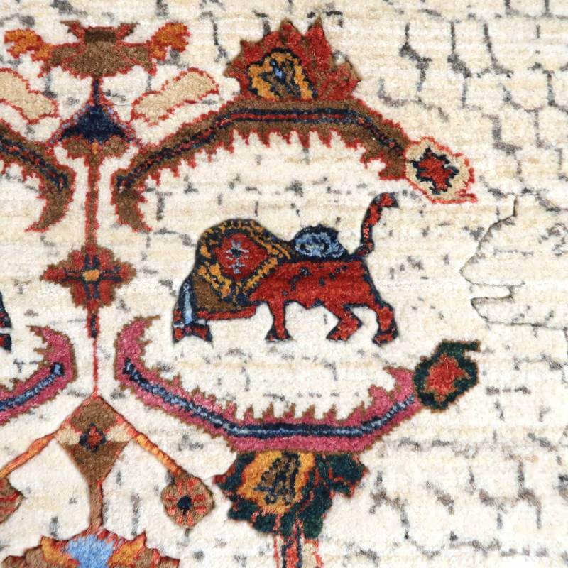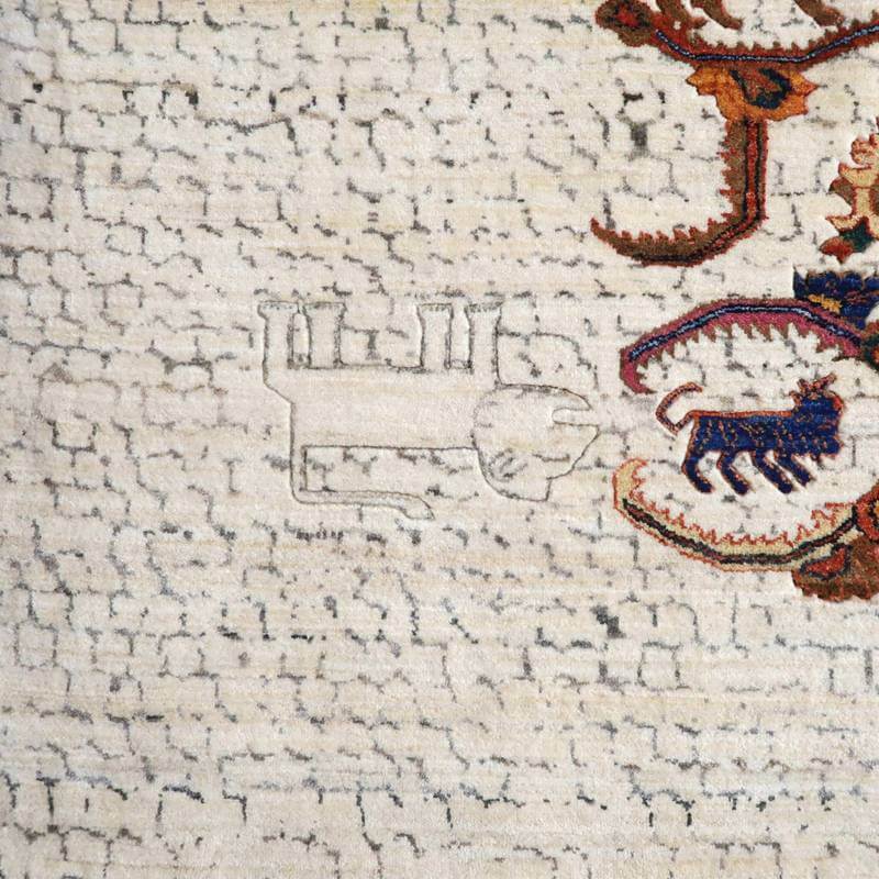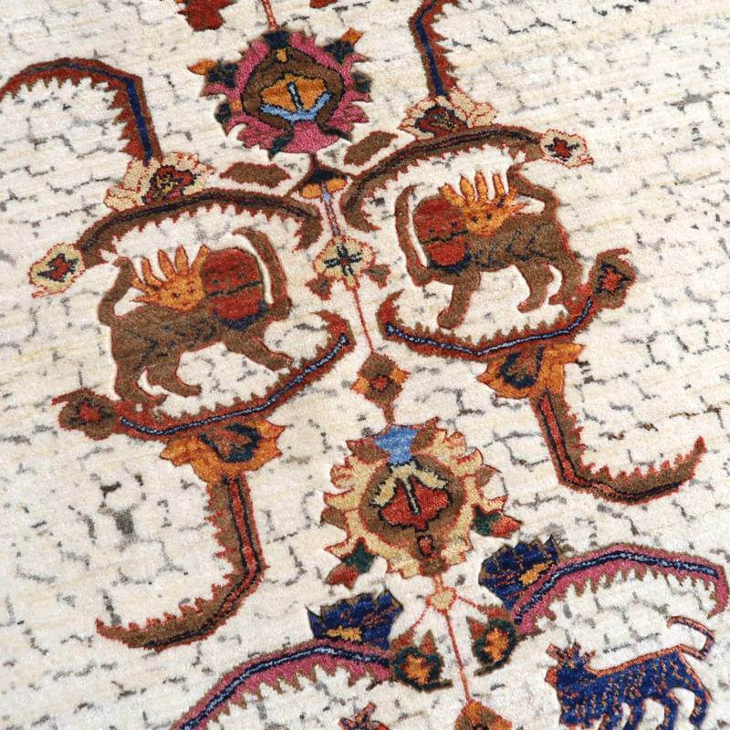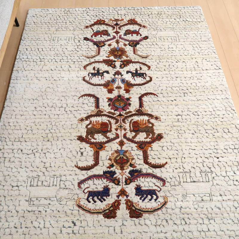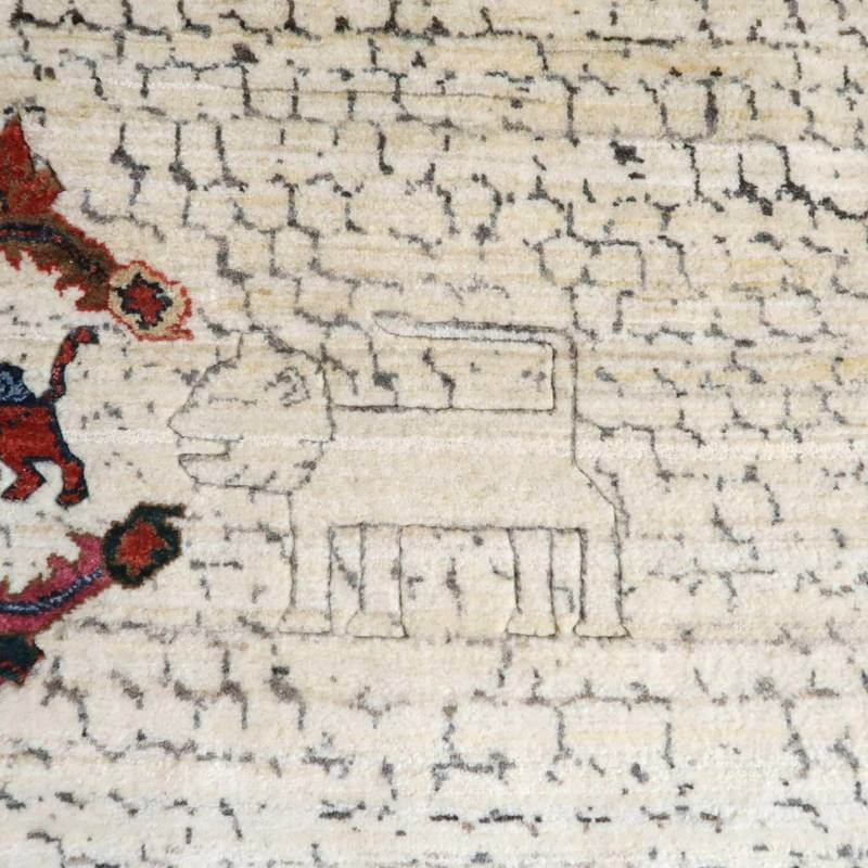 明るいアイボリーと石畳のような文様のグレーは、刈り取った羊の毛を染めずに上手くデザインに活かしています。センター部分は、植物を基にした連続模様が縦に連なり、その合間に剣を持ったライオンや騎士が対称に描かれた雄々しいデザインですが、そのアウトラインは手バサミで段差をつけて、凹凸で柄を際立たせる技法が施されています。作者の個性と感性あふれるアートデザインのギャッベです。冬毛の柔らかな最高部位のウールのみを使用して細かく編んだ最上級のソフトな手触り。